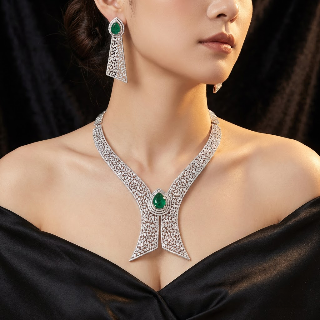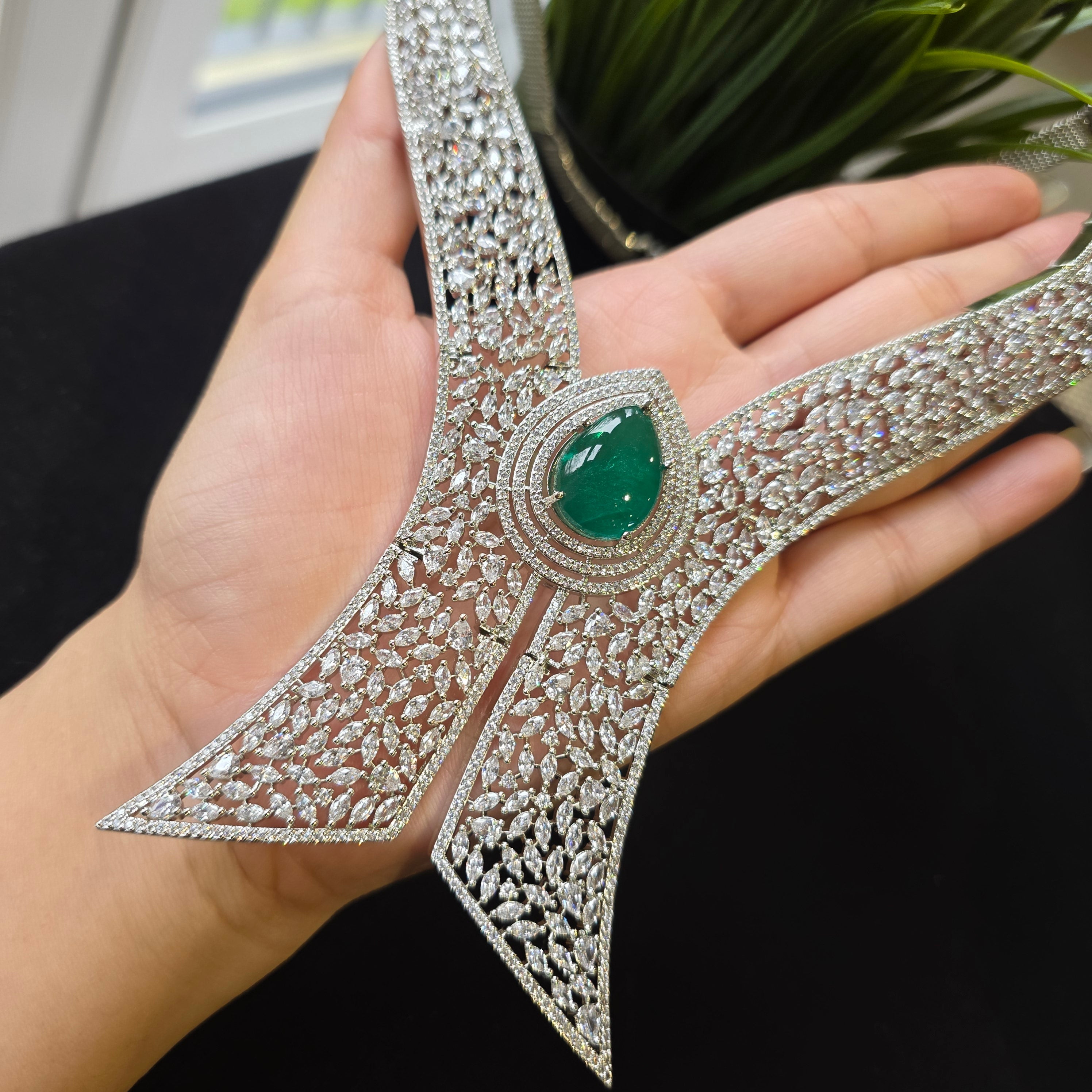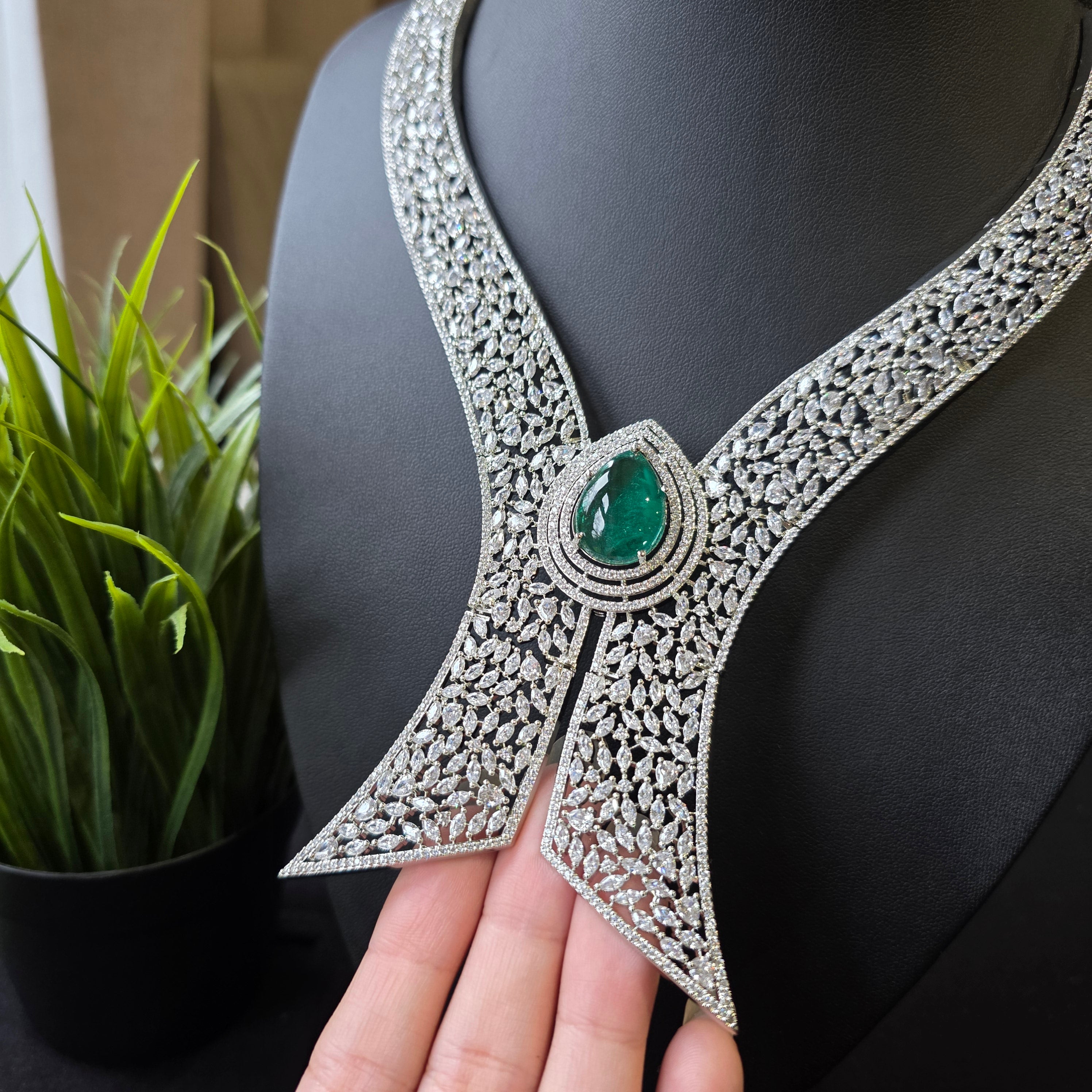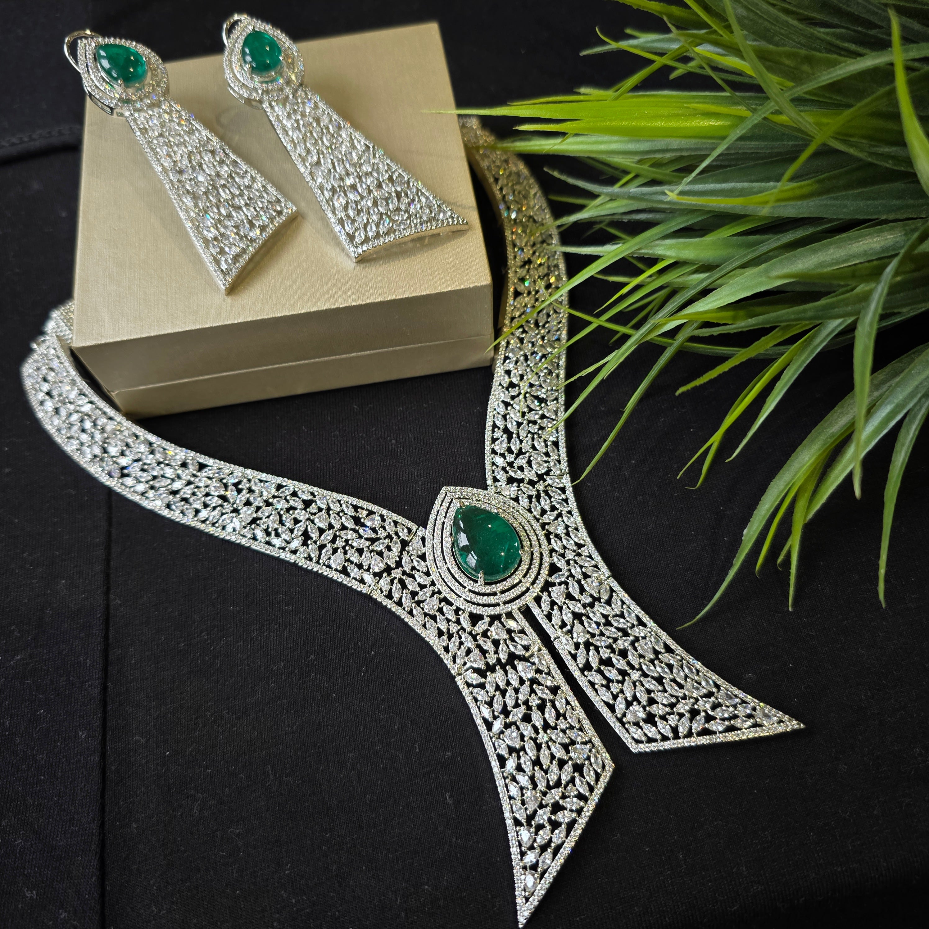 Introducing this Statement piece that boasts Green Emerald (lab made) & AAAA CZ complemented by matching Earrings. Add a touch of elegance and sparkle to your look, perfect accessory to elevate any outfit!