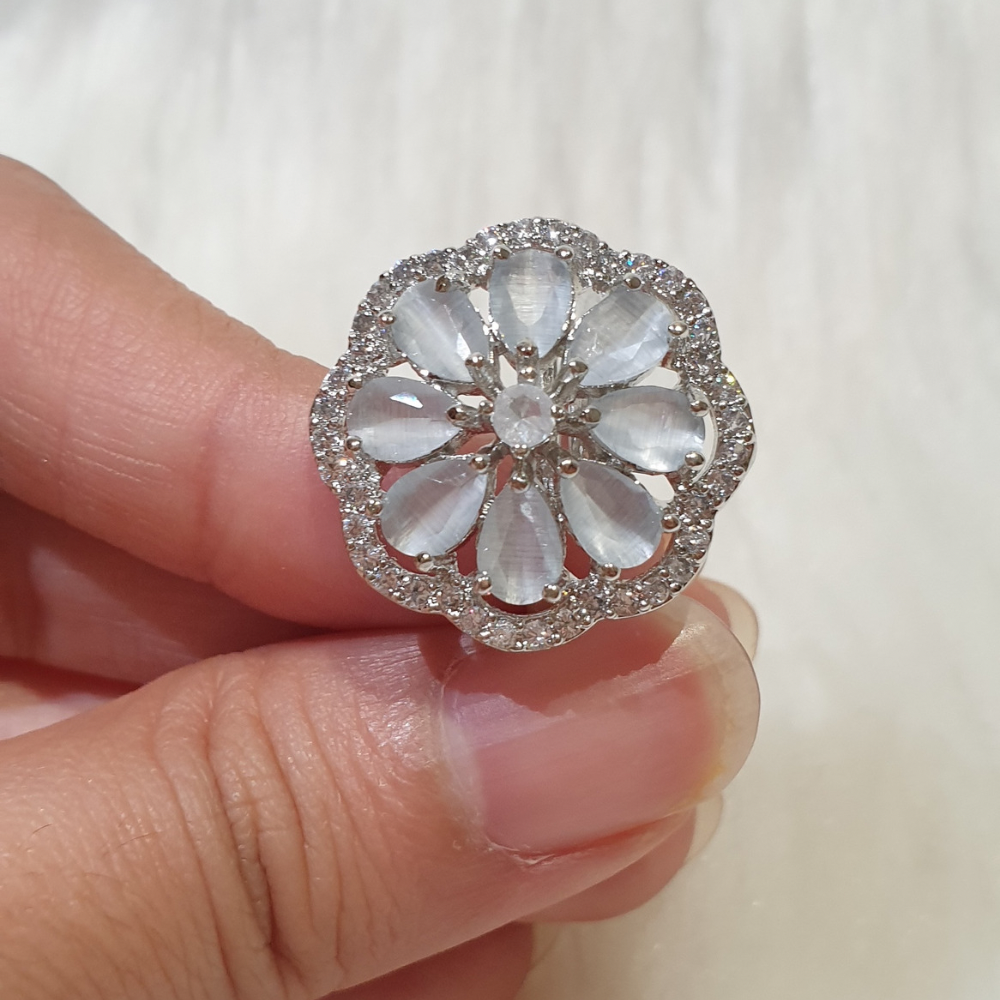 White Gold and Rhodium Size Adjustable Ring with Grey Quartz and Cubic Zirconia.