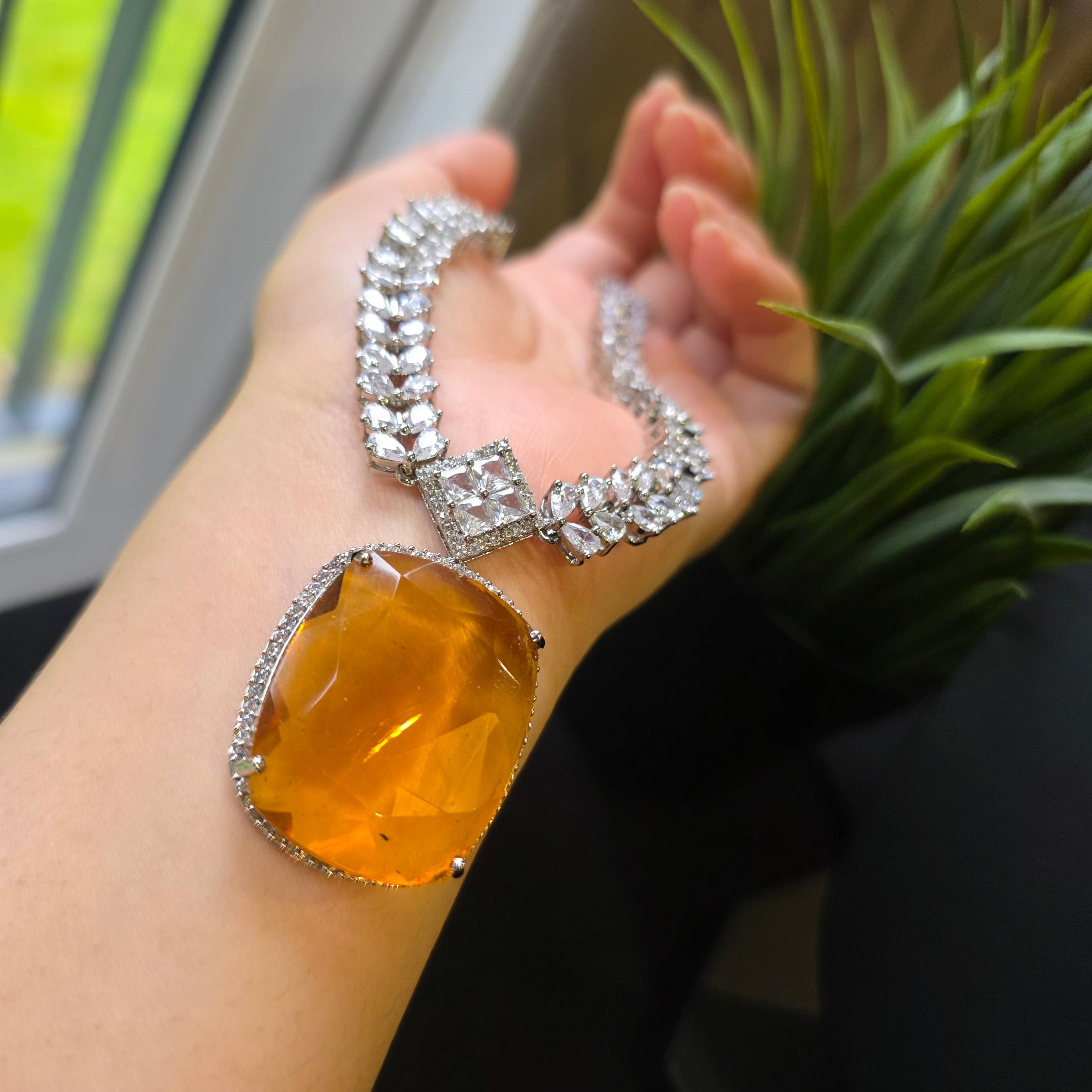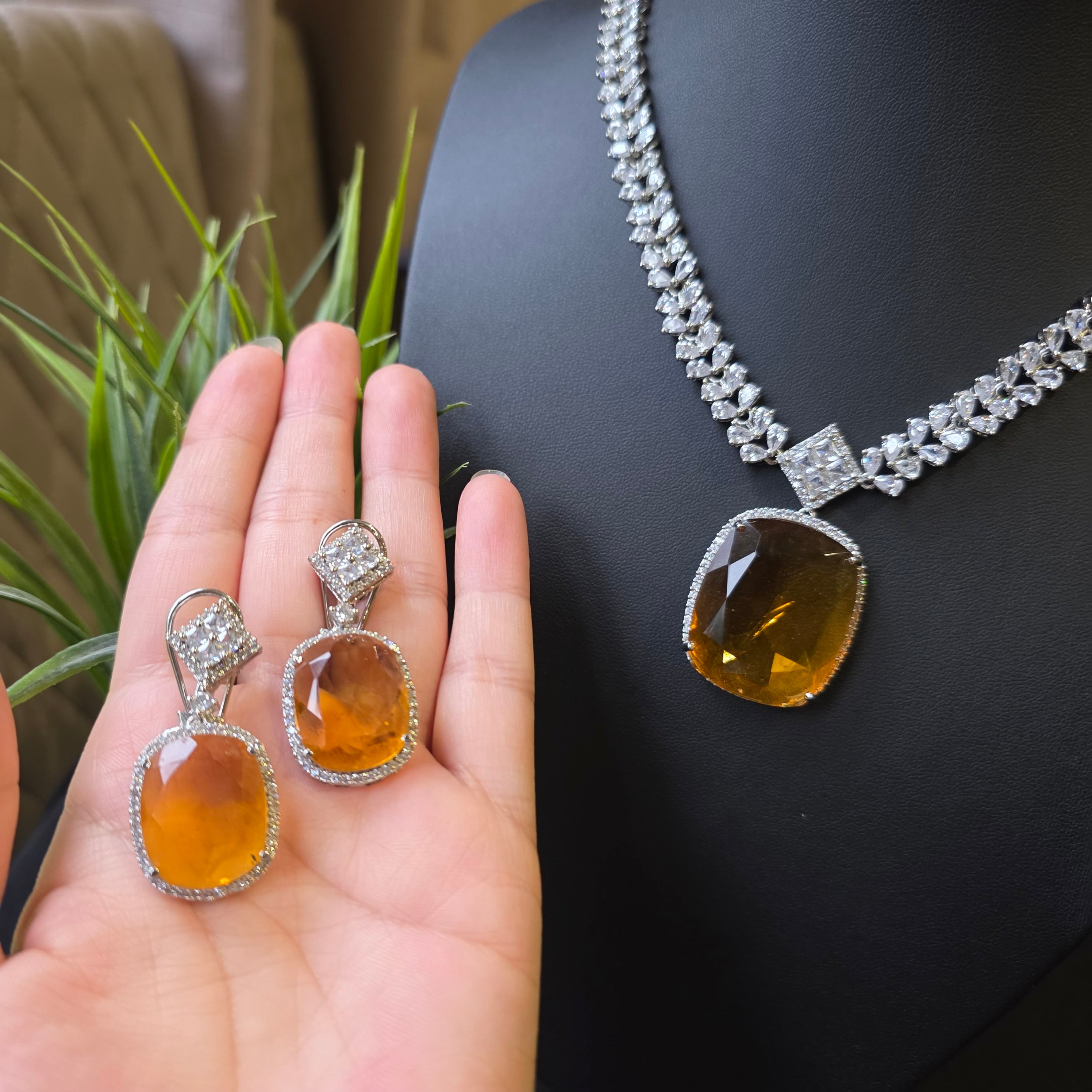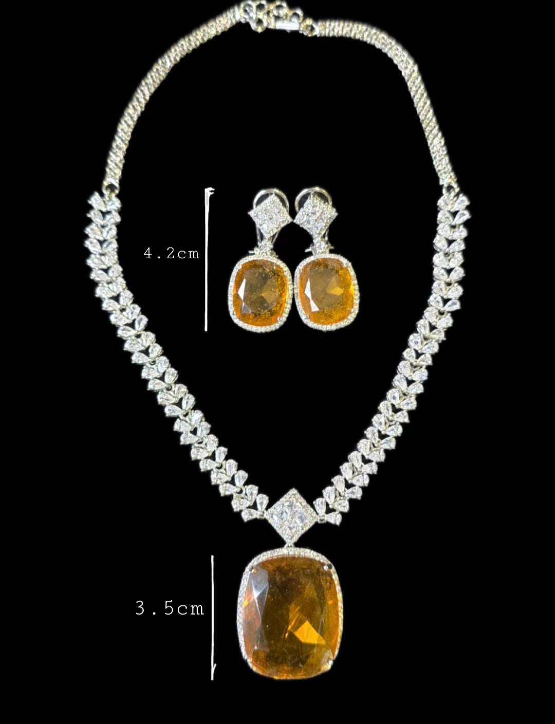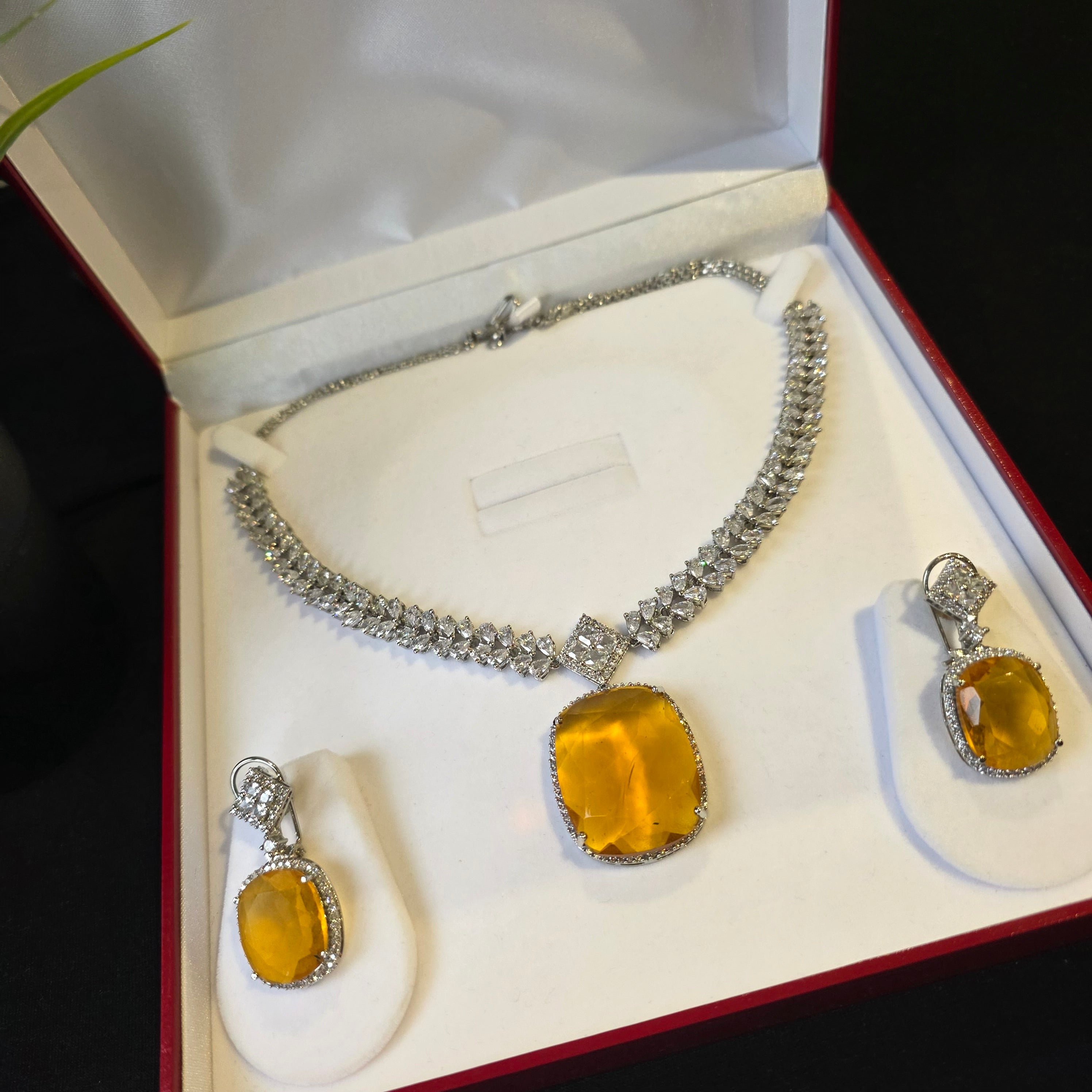 Introducing this exquisite Necklace Set that boasts a stunning Yellow Citrine (lab-made) centre stone, complemented by matching Earrings. Add a touch of elegance and sparkle to your look, perfect accessory to elevate any outfit!