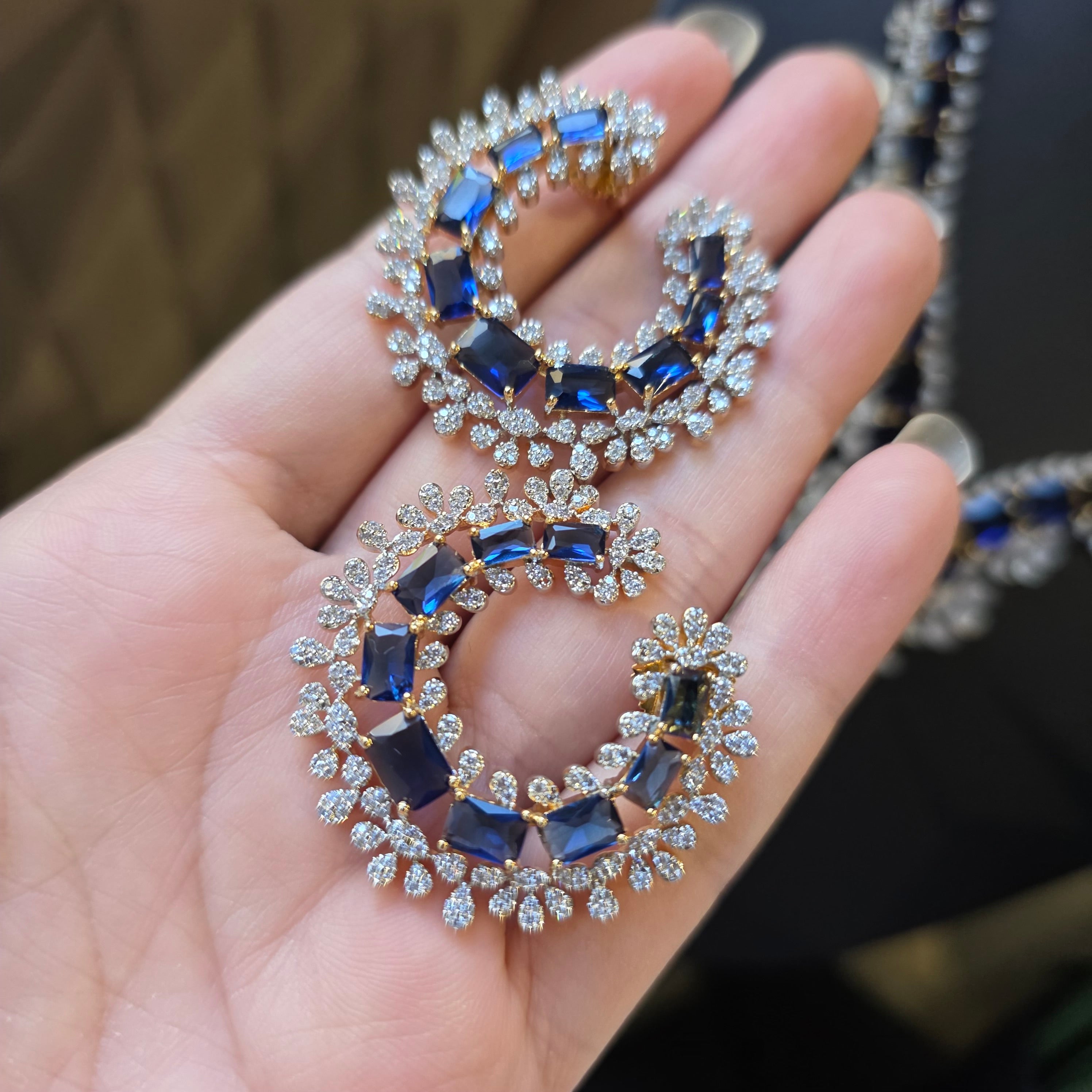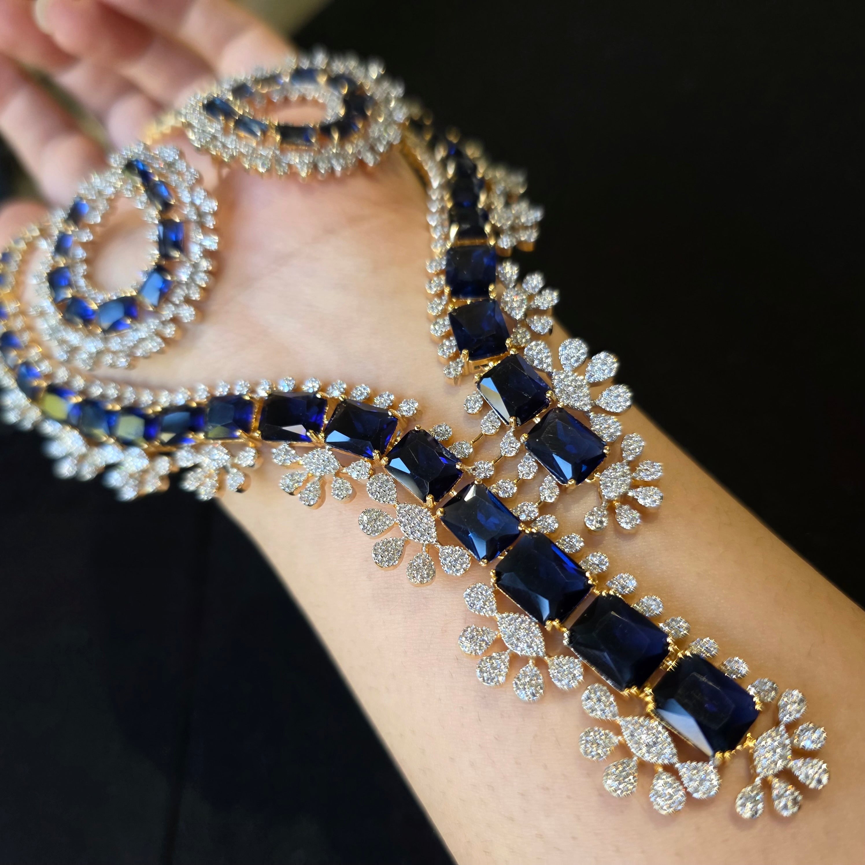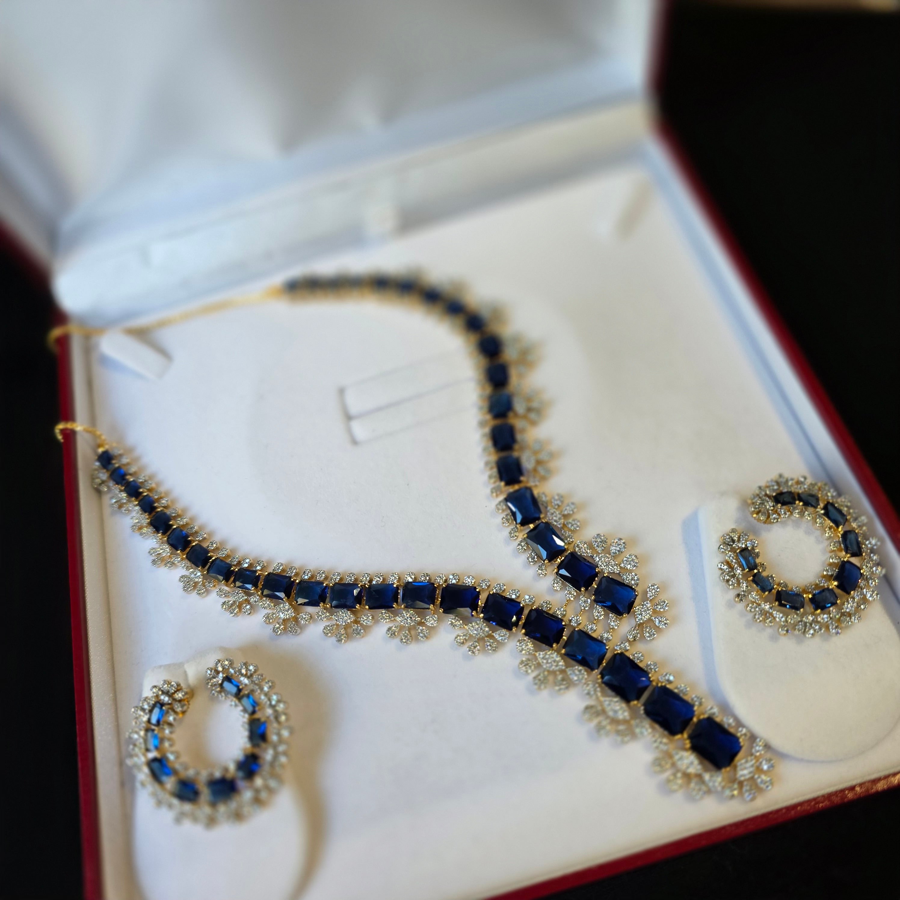 Introducing this Bespoke piece that boasts stunning Blue Sapphires (lab-made), complemented by matching Earrings. Add a touch of elegance and sparkle to your look, perfect accessory to elevate any outfit! Unique make by fine artisans.