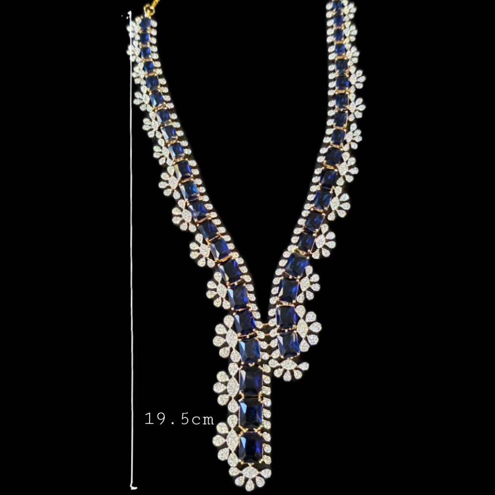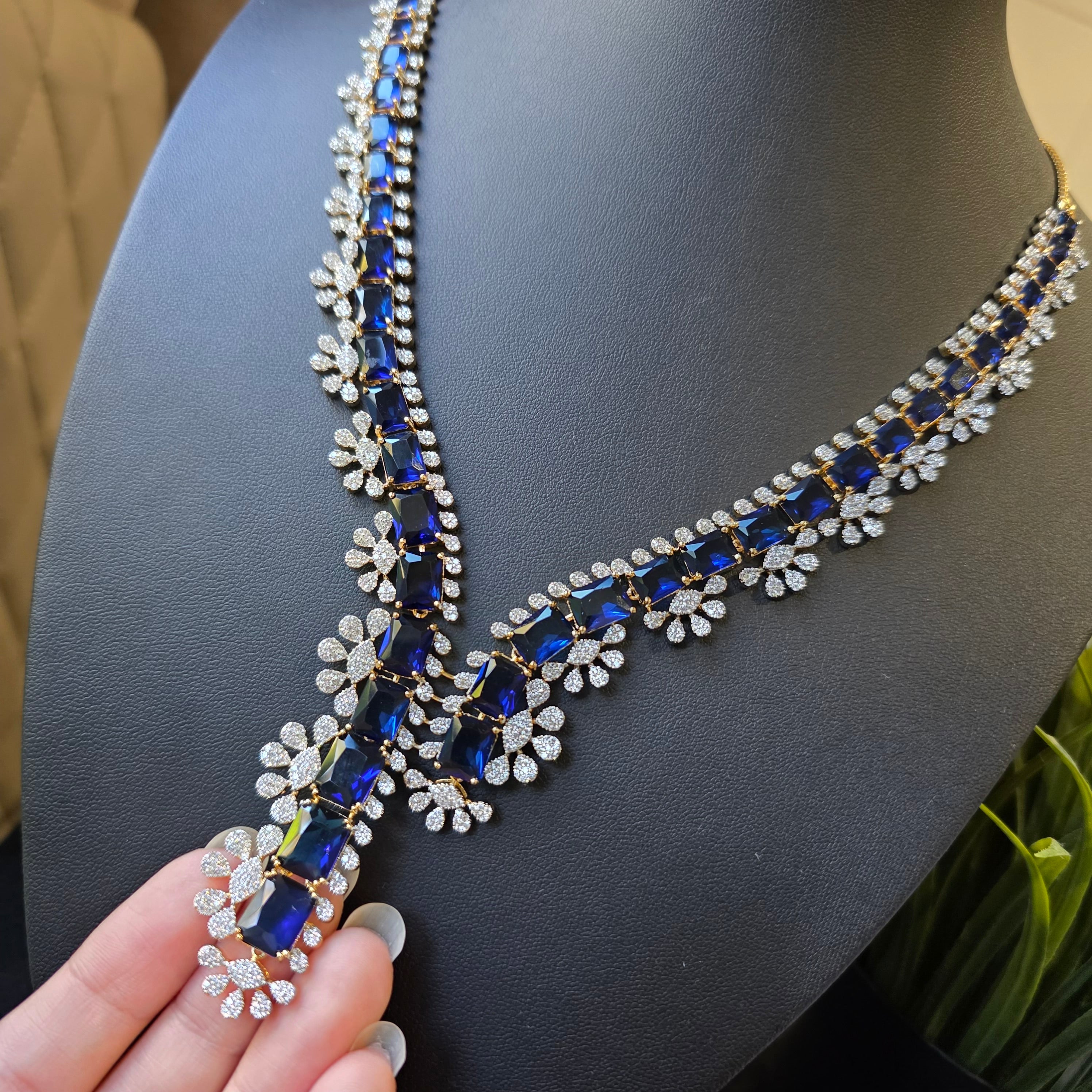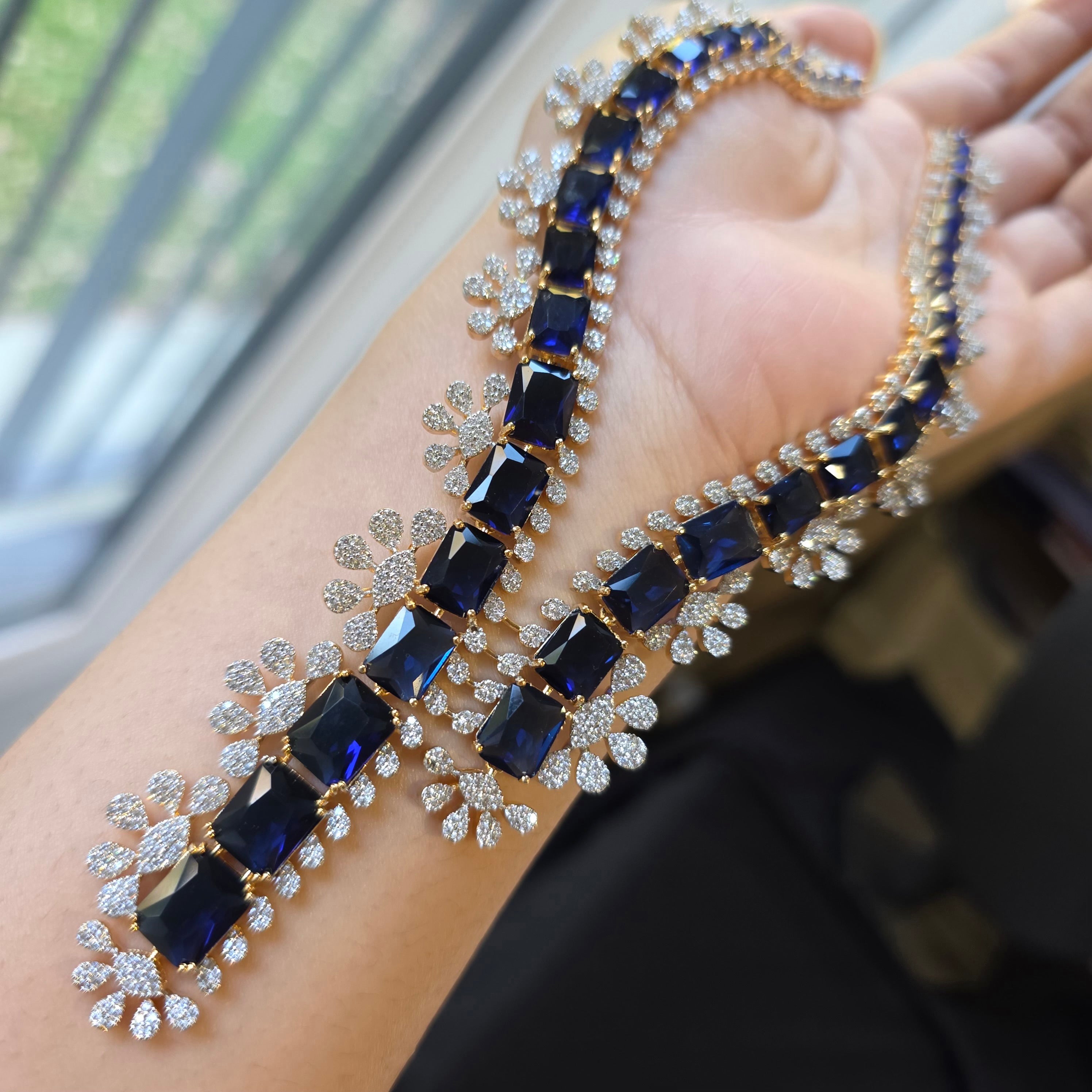 Introducing this Bespoke piece that boasts stunning Blue Sapphires (lab-made), complemented by matching Earrings. Add a touch of elegance and sparkle to your look, perfect accessory to elevate any outfit! Unique make by fine artisans.