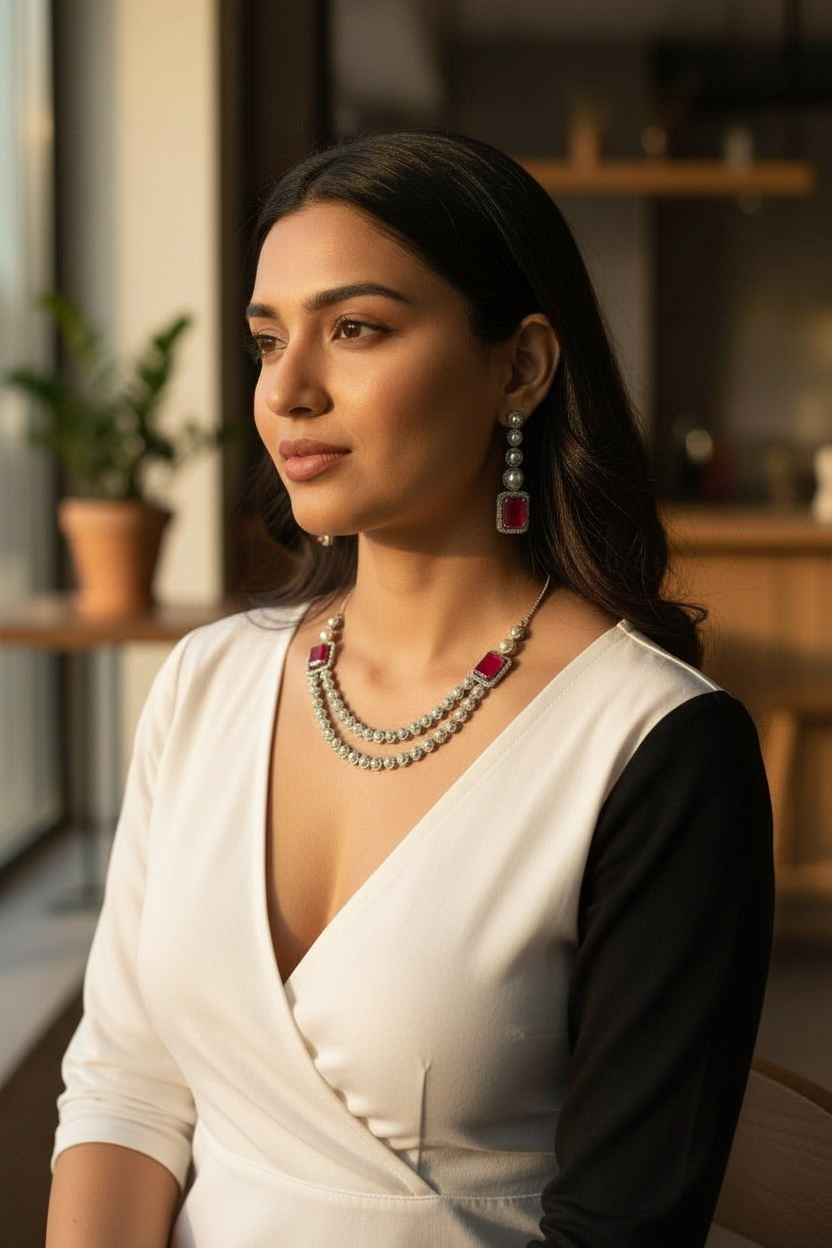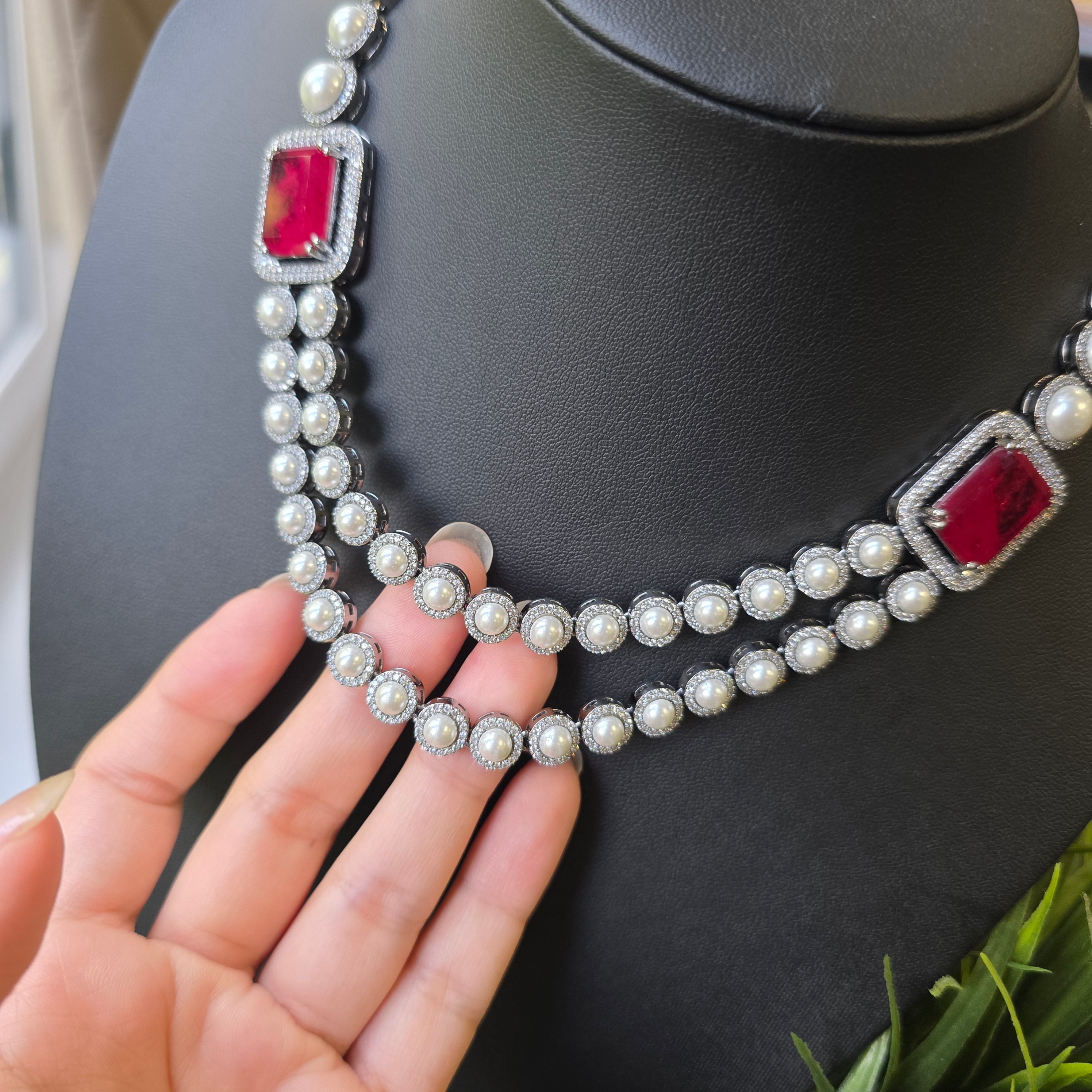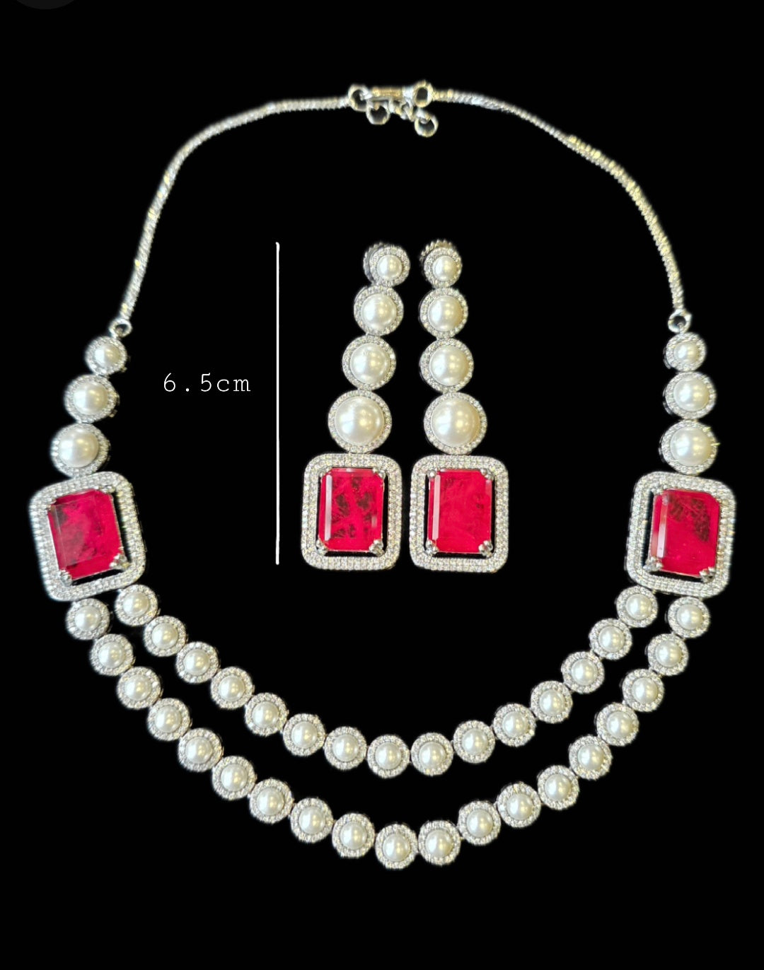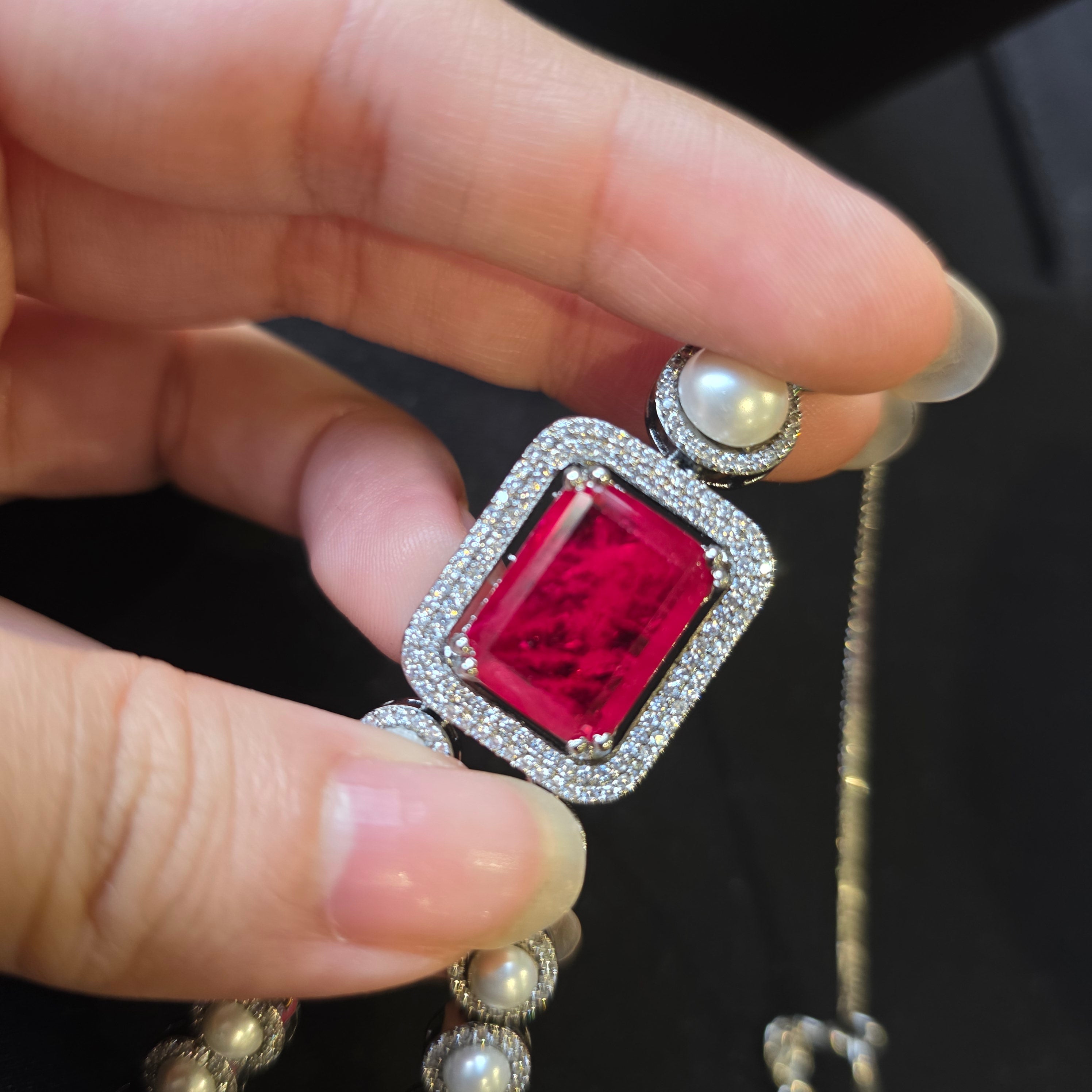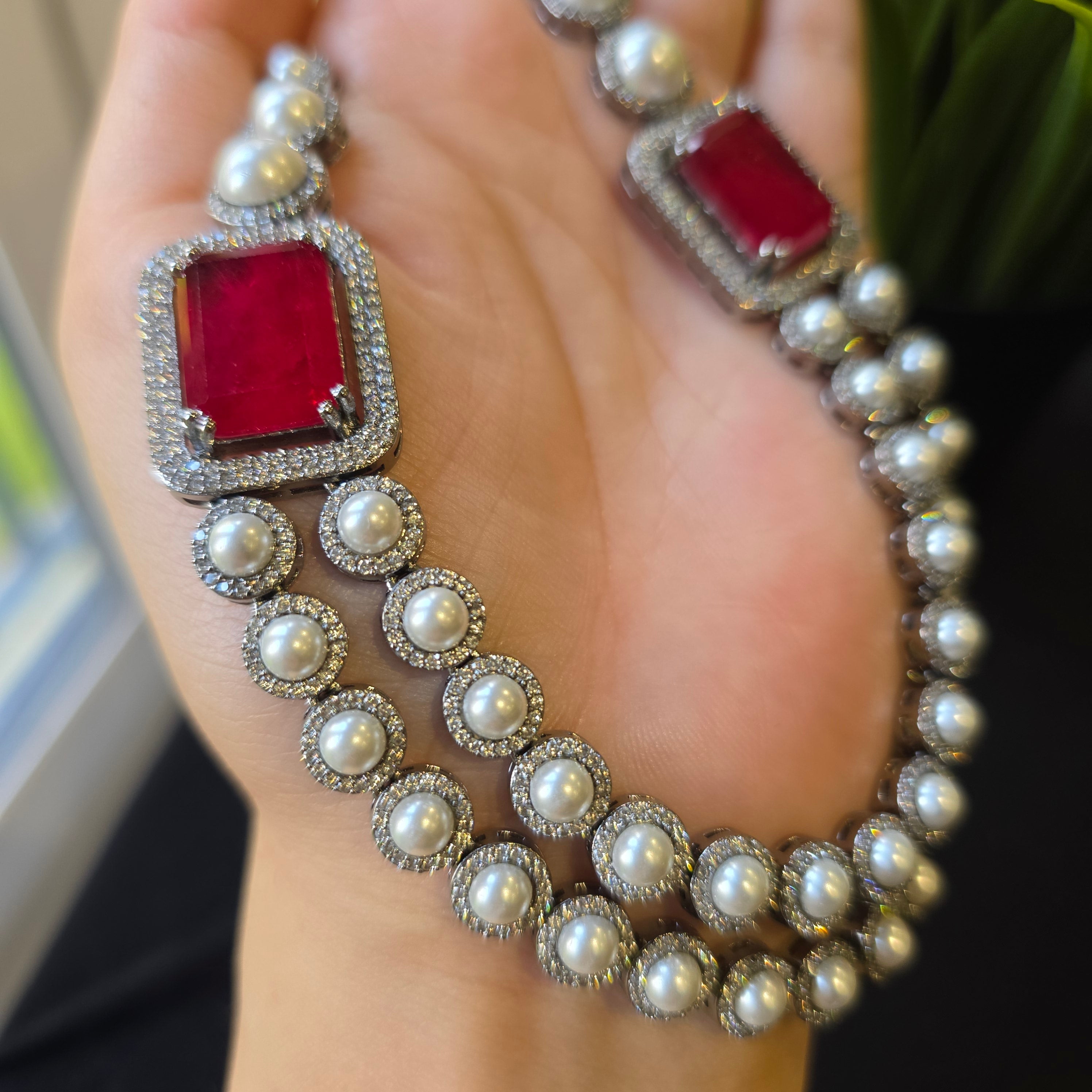Brand new Timeless piece featuring Red Ruby (lab-made) and luxurious Pearls studded Necklace paired with matching Earrings.