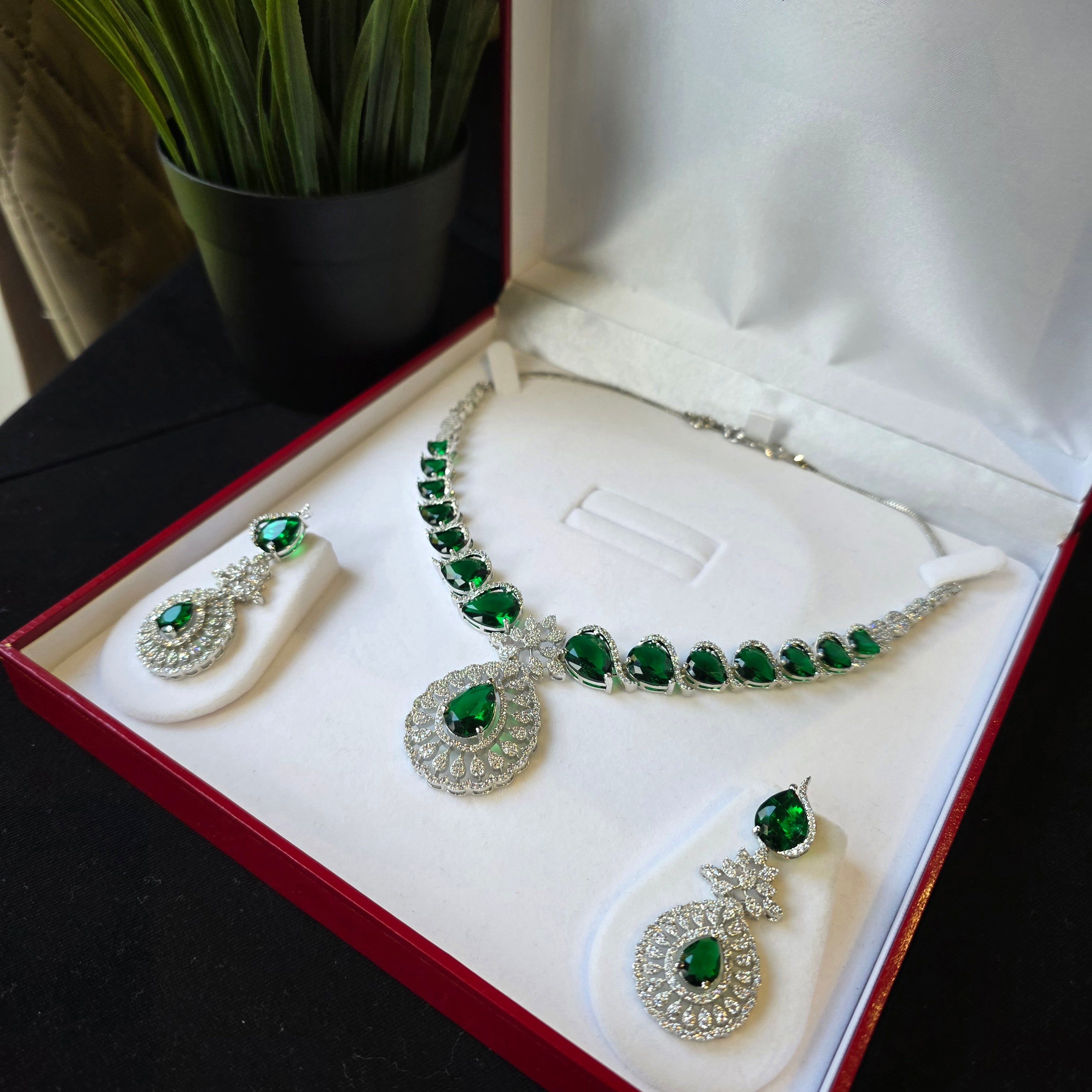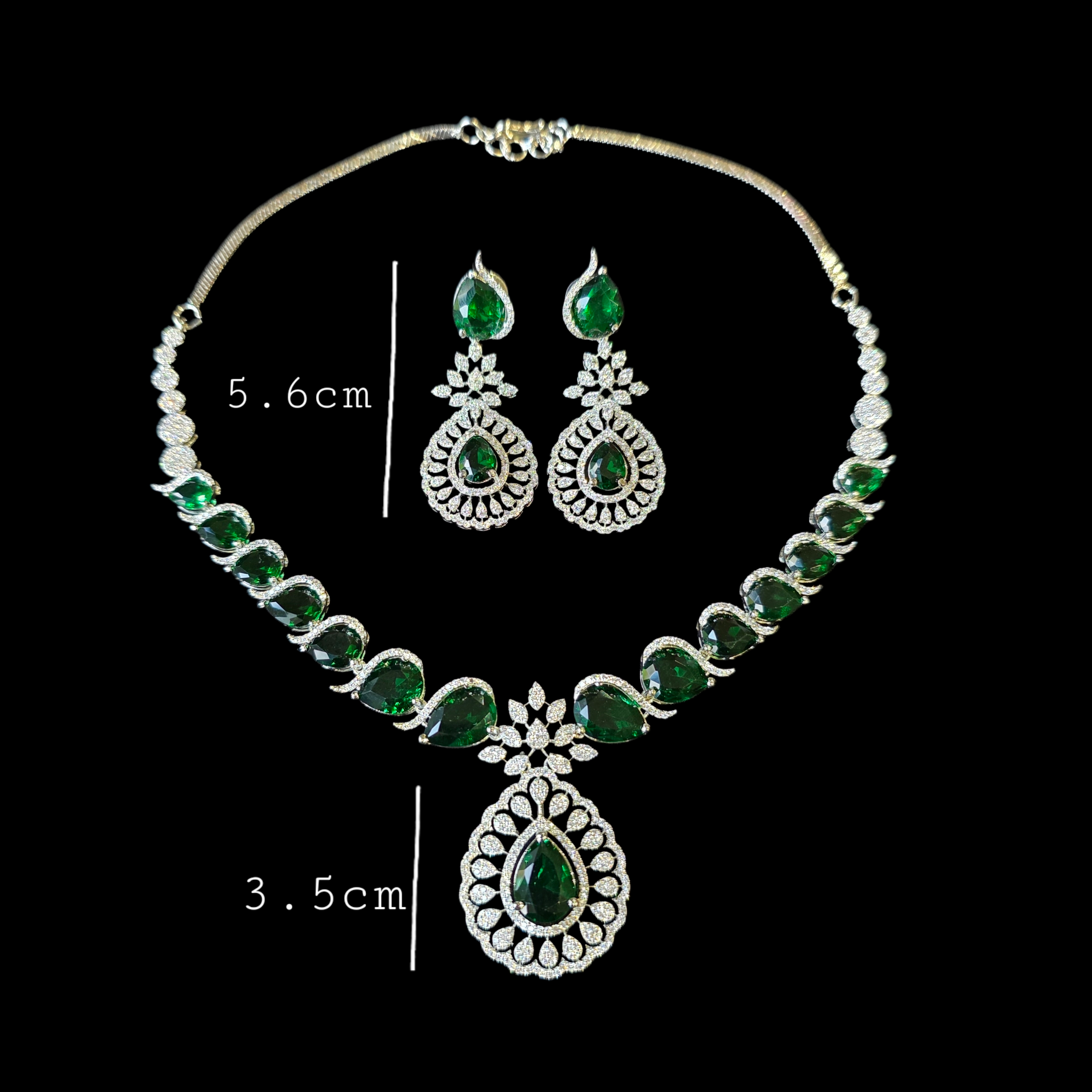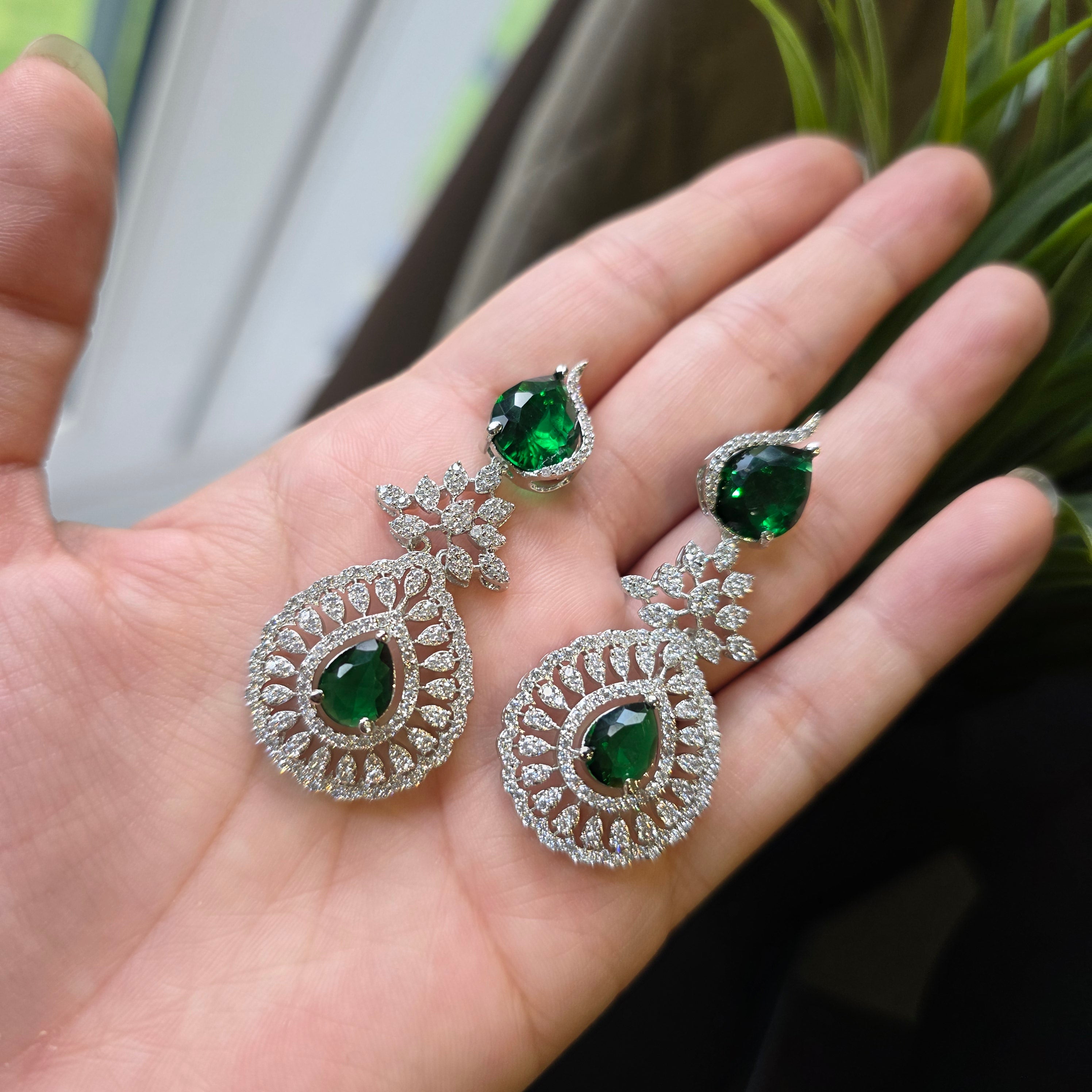 This Brand new exquisite piece featuring Vivid Emeralds (lab-made) and Cubic Zirconia studded Necklace paired with matching Earrings.