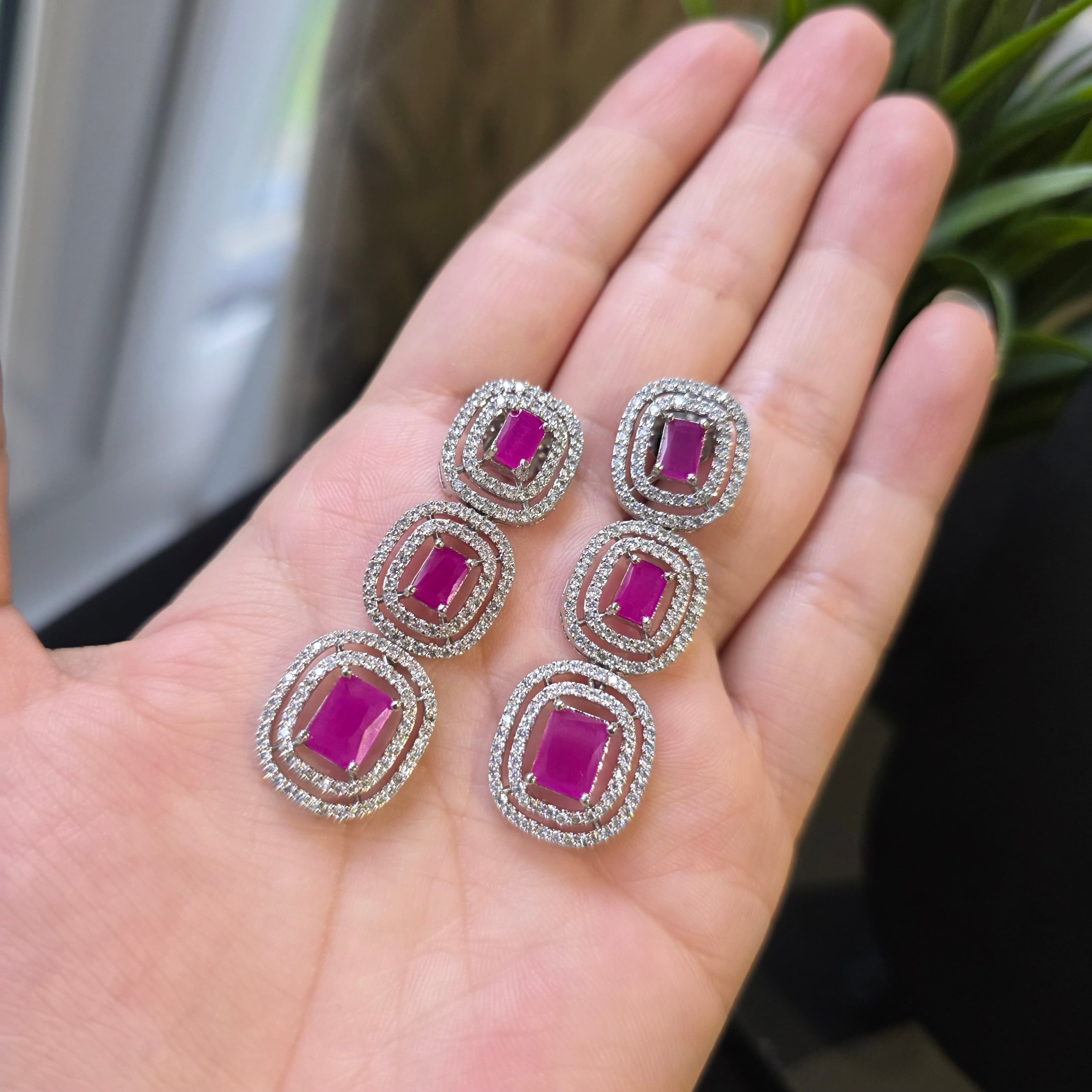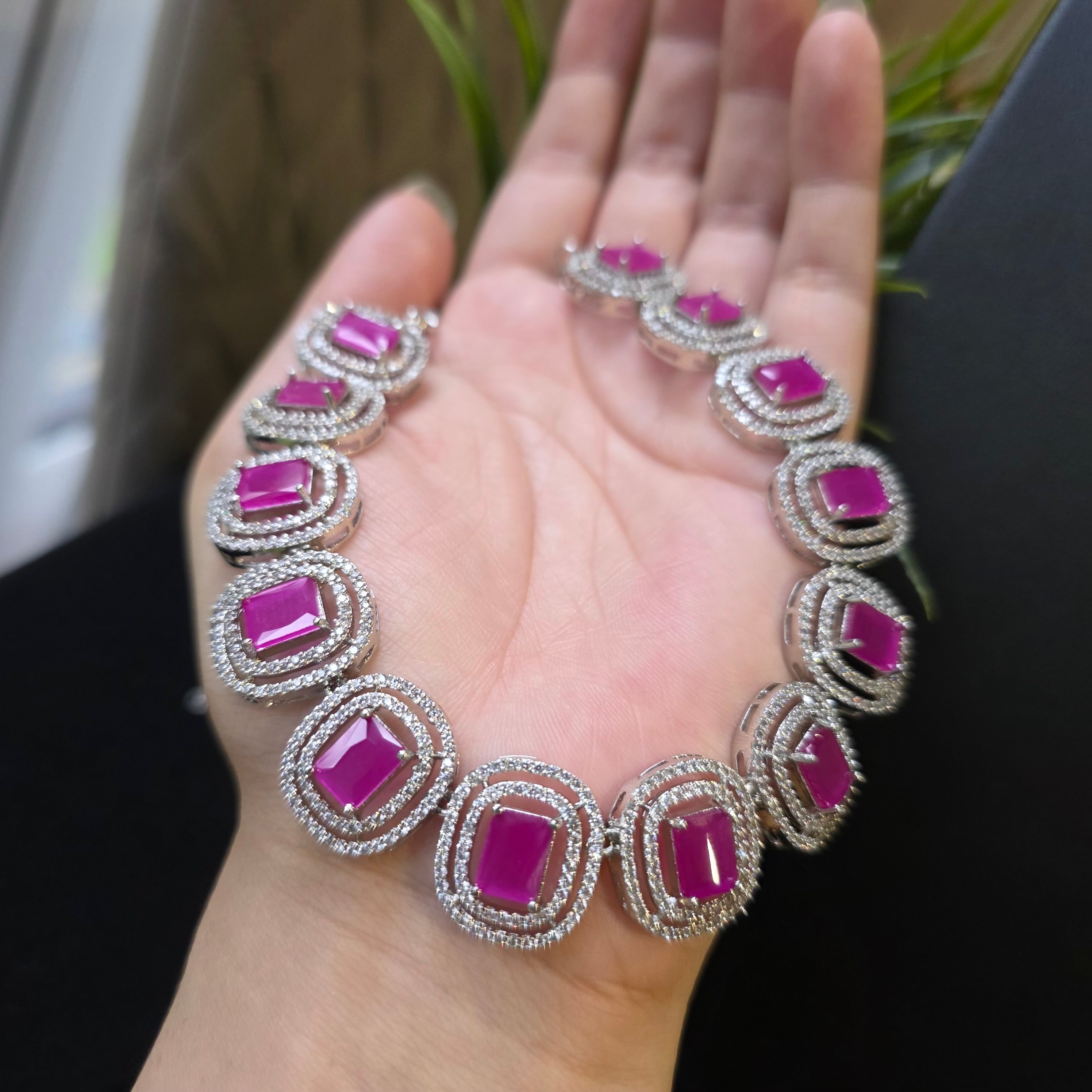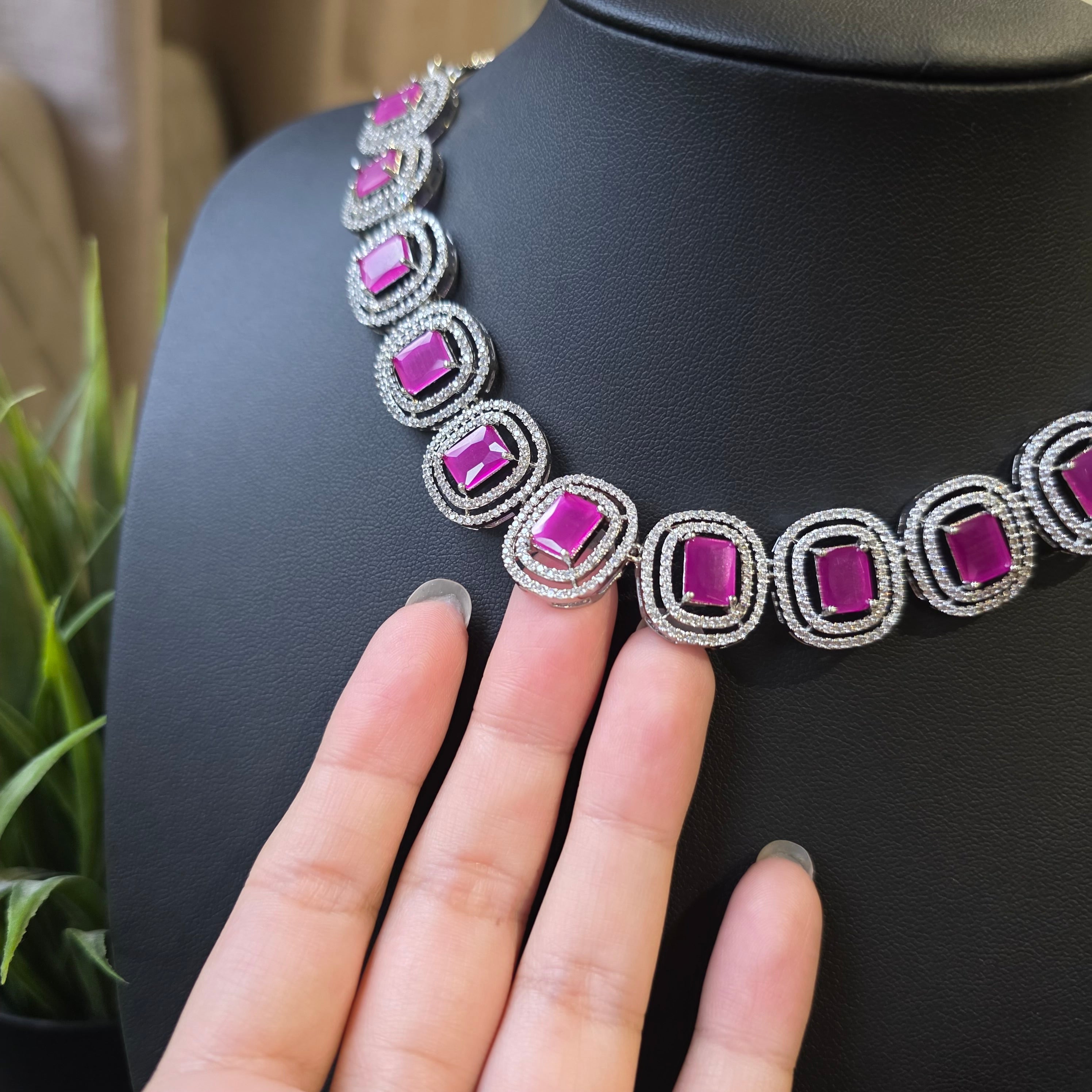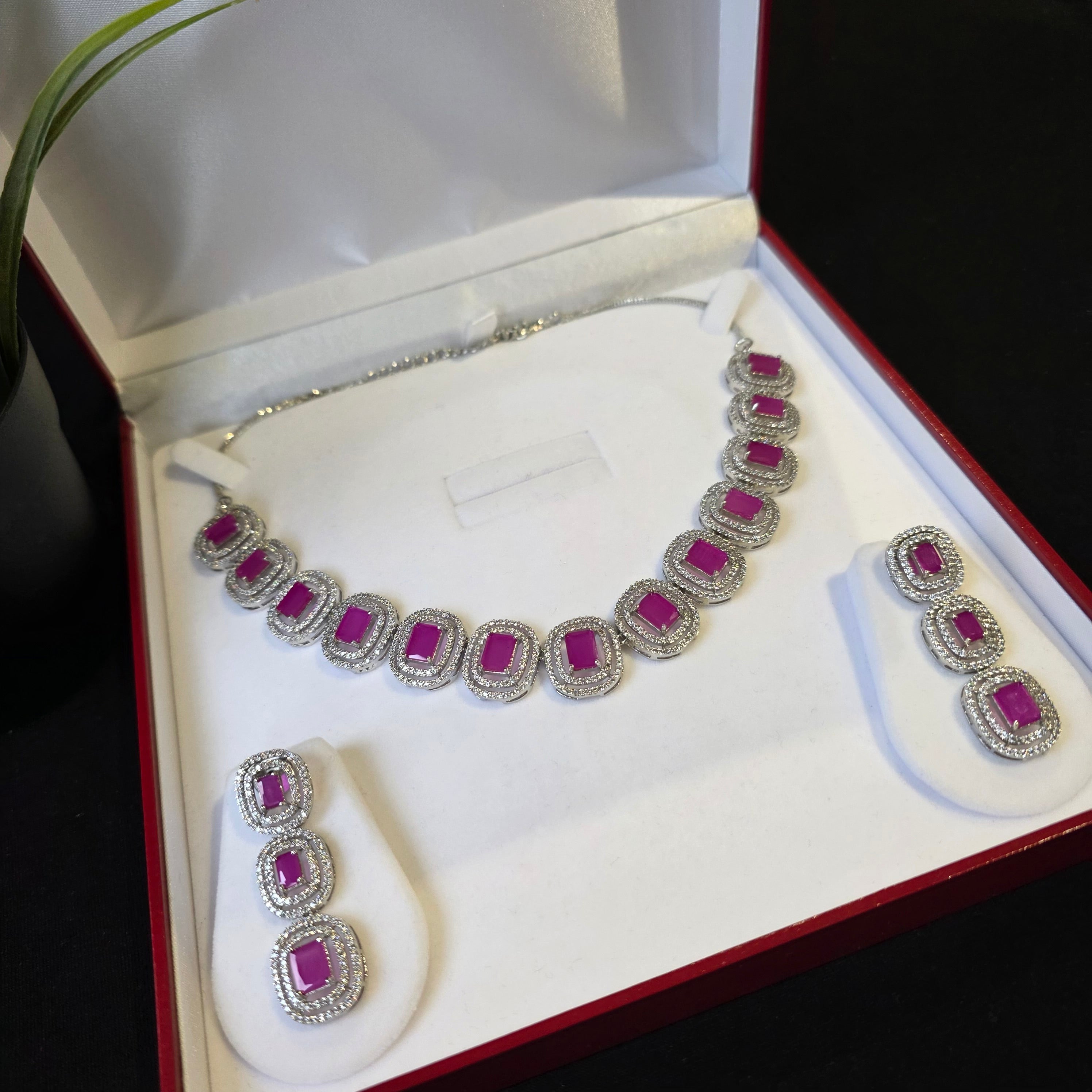 This exquisite piece featuring Deep Pink Rubies (lab-made) and Cubic Zirconia studded Necklace paired with matching Earrings.