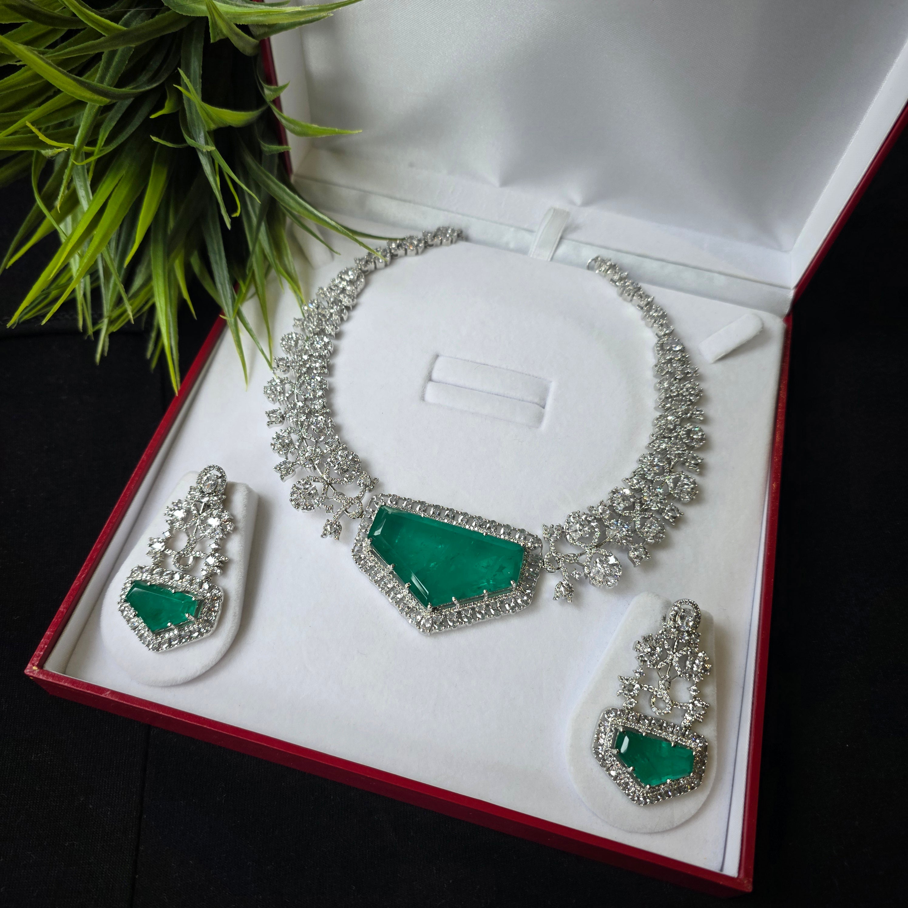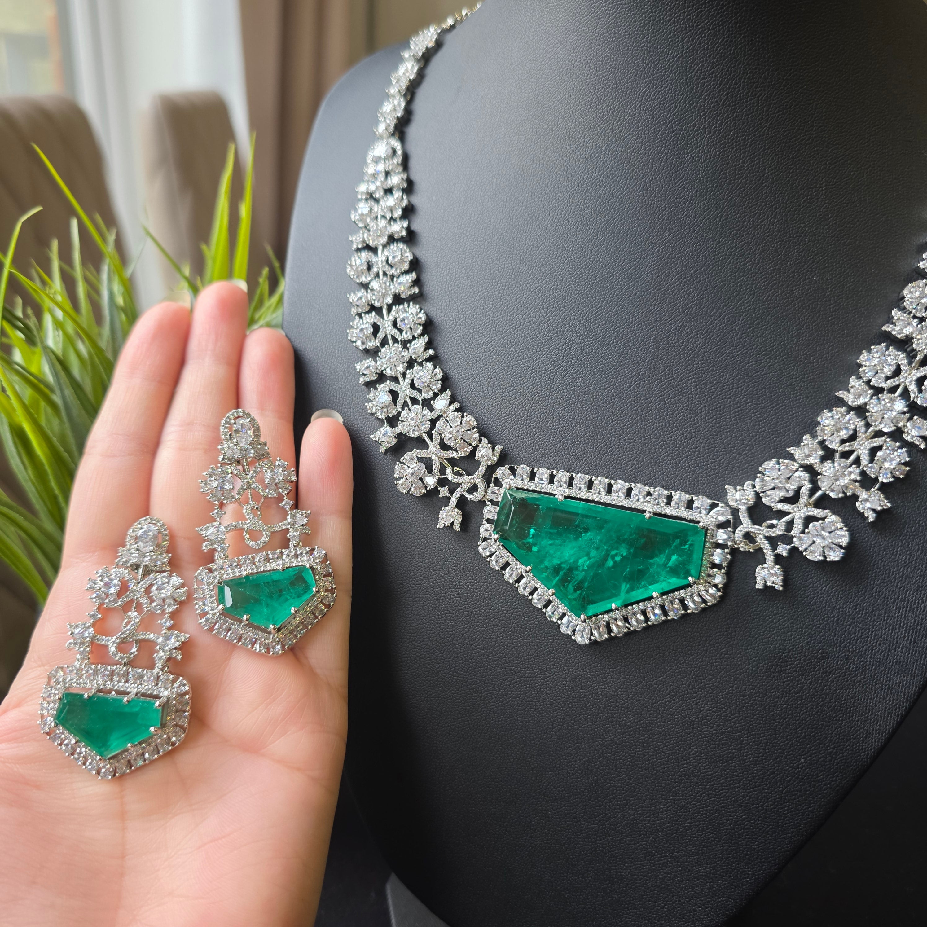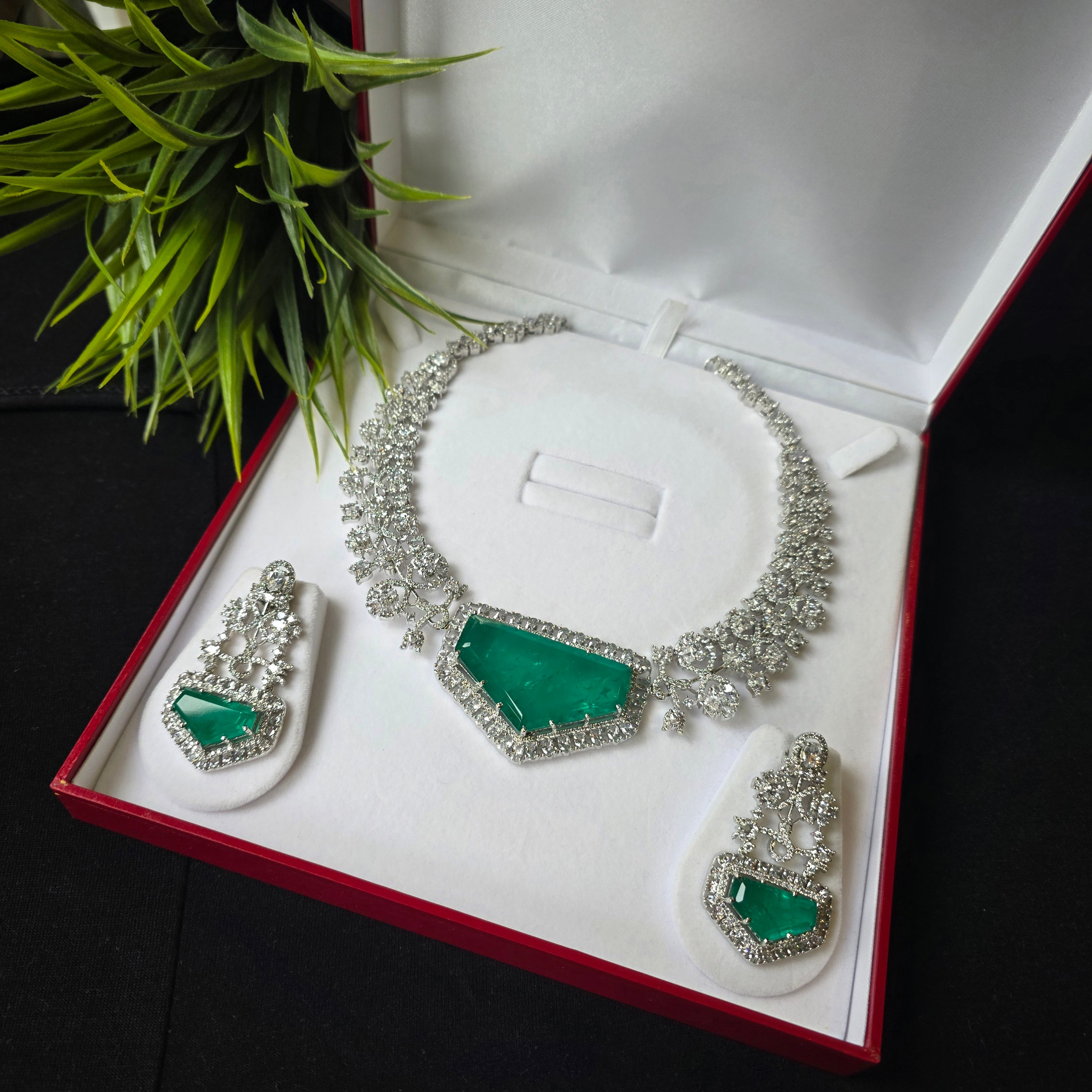 Introducing this Statement piece that boasts a stunning Emerald Doublet centre stone, complemented by matching Earrings. Add a touch of elegance and sparkle to your look, perfect accessory to elevate any outfit!