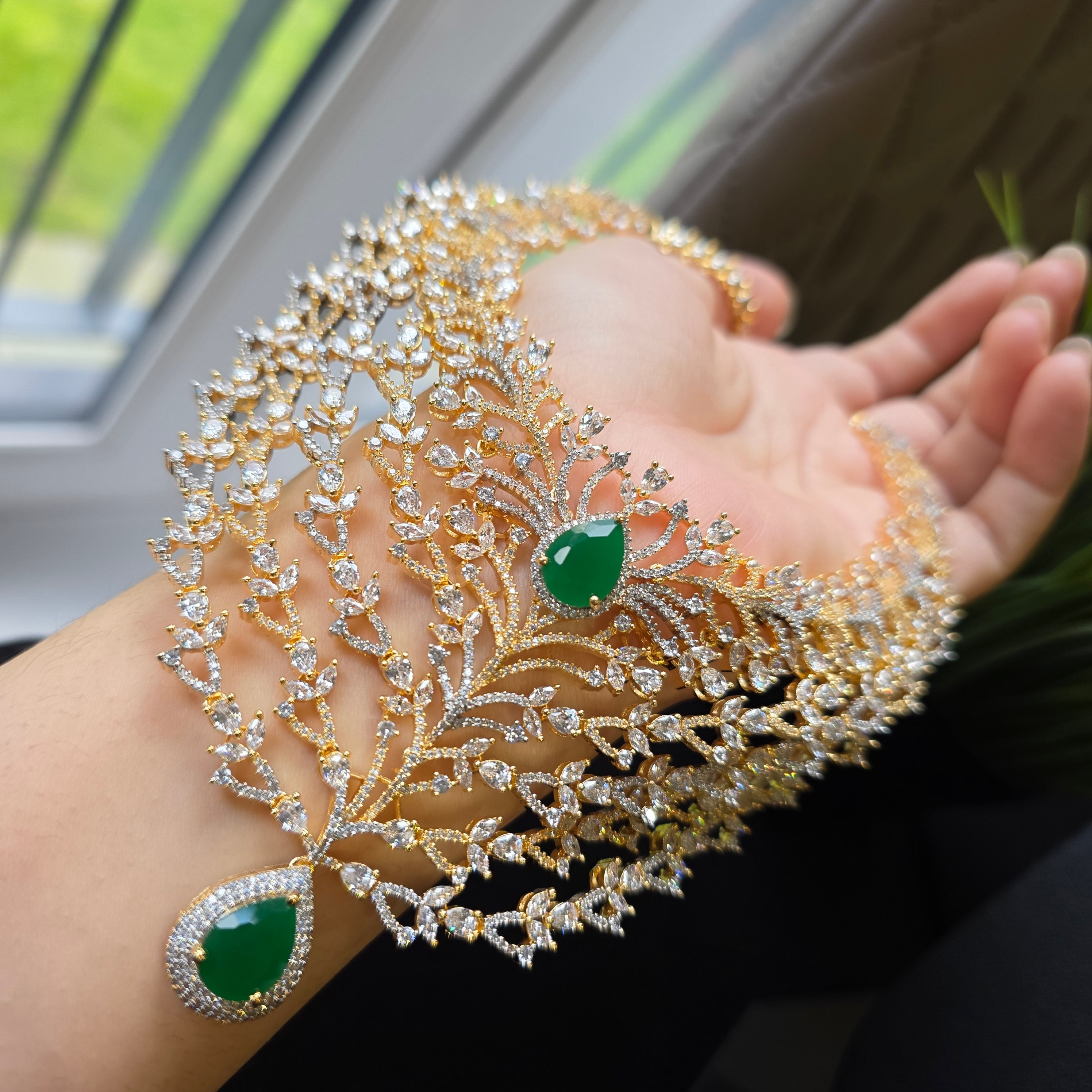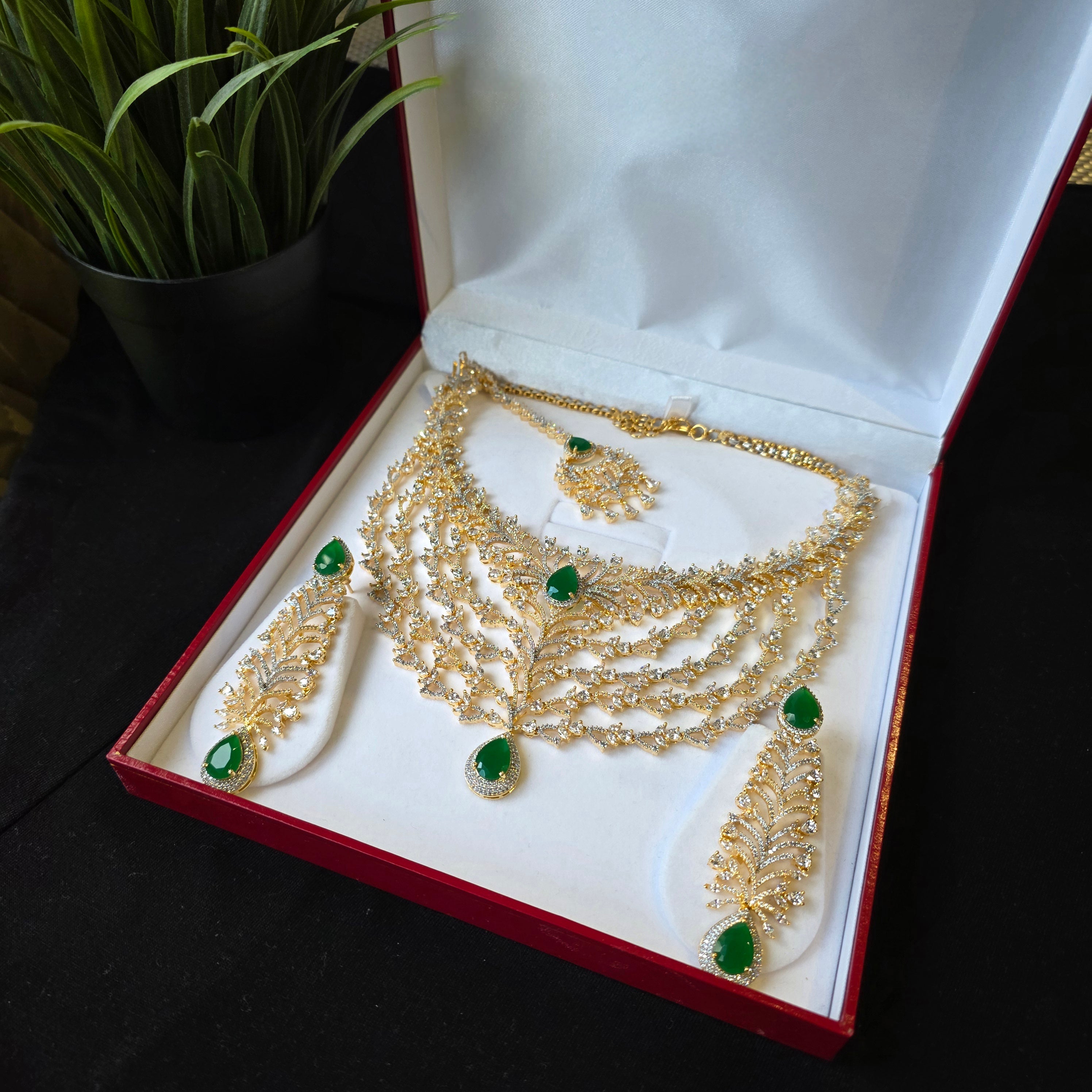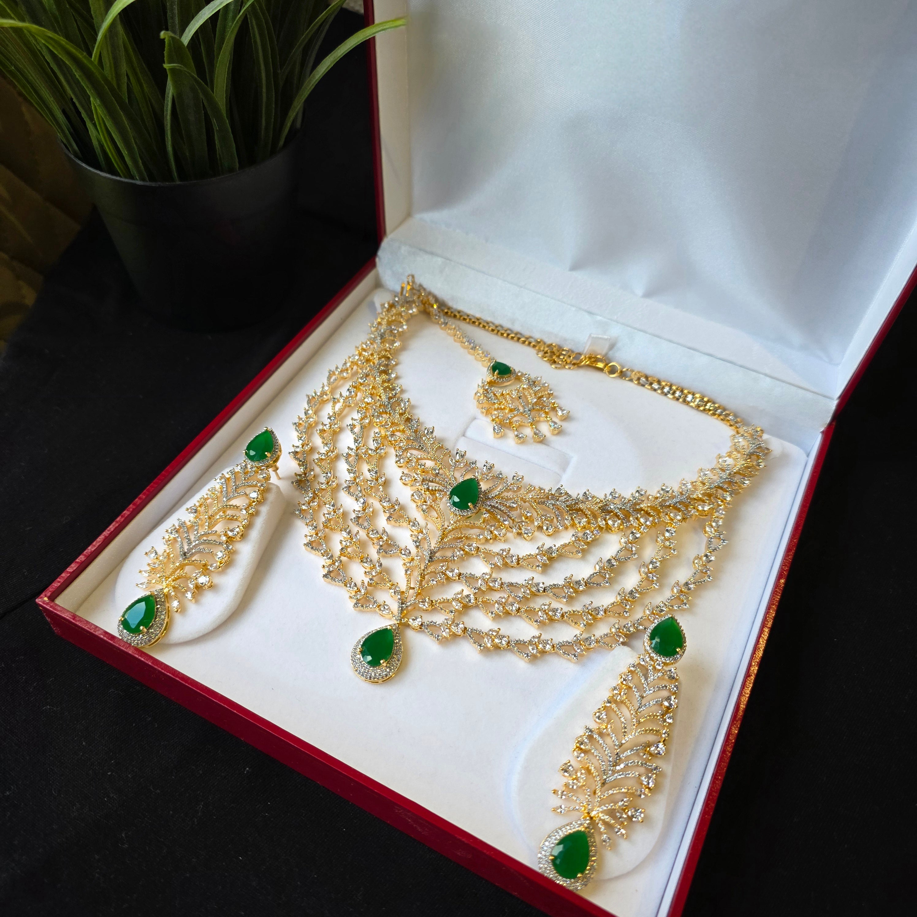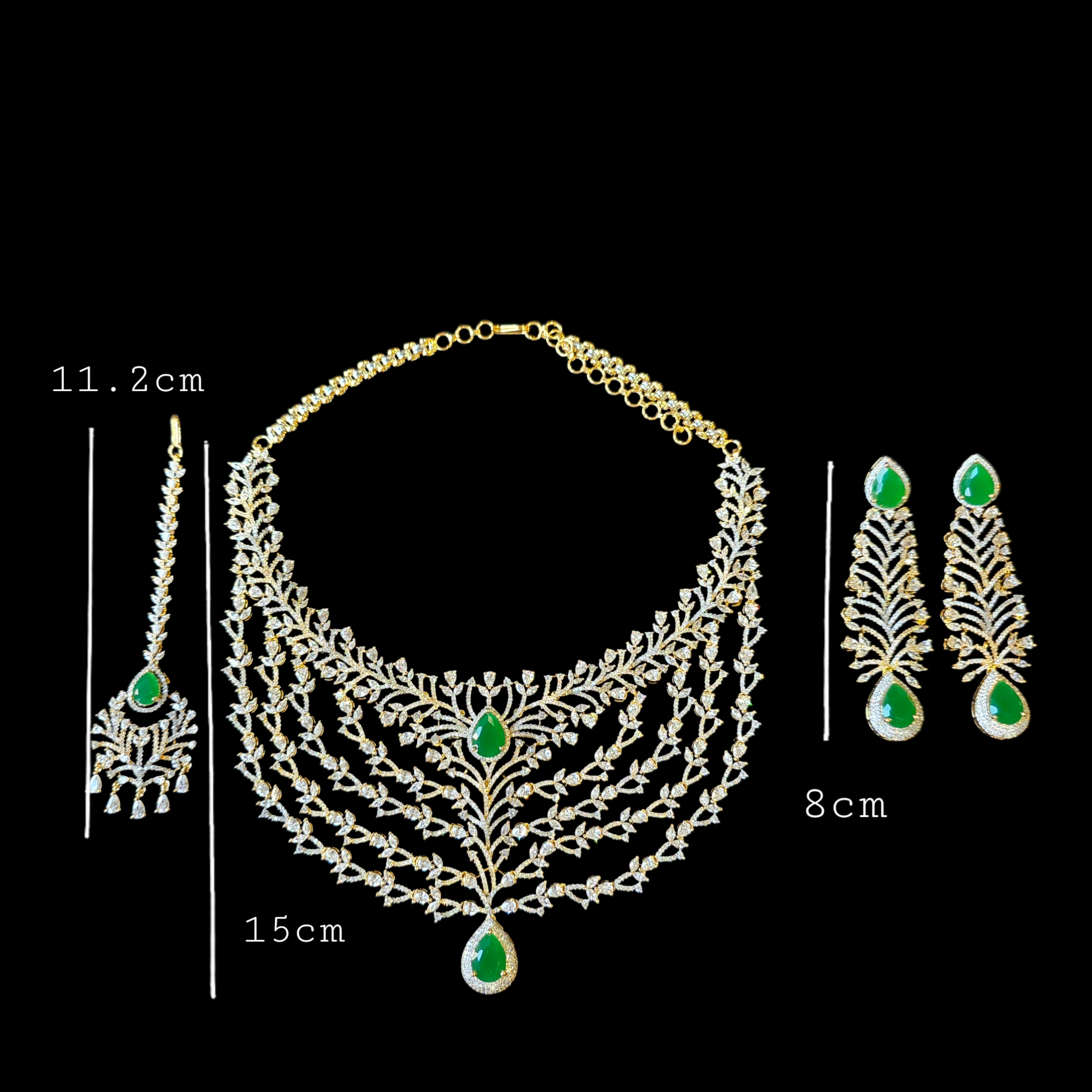 Introducing Bespoke piece featuring Stunning Emeralds (lab-made) and Cubic Zirconia studded Necklace paired with matching Earrings & Tika.