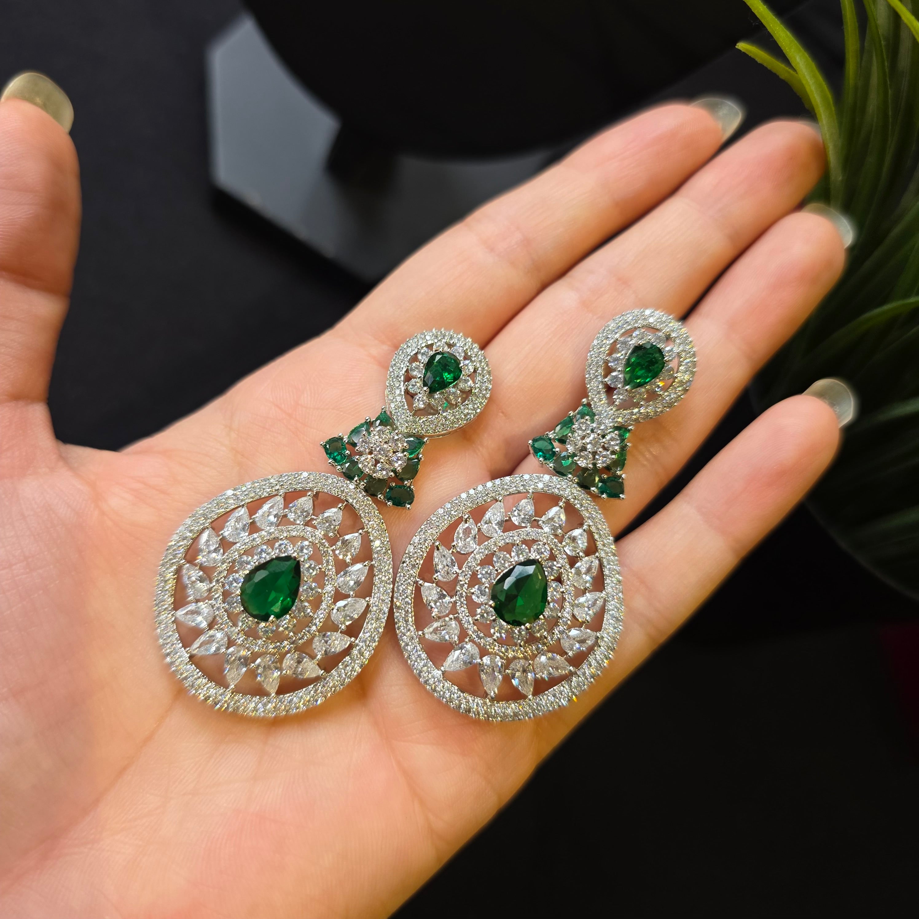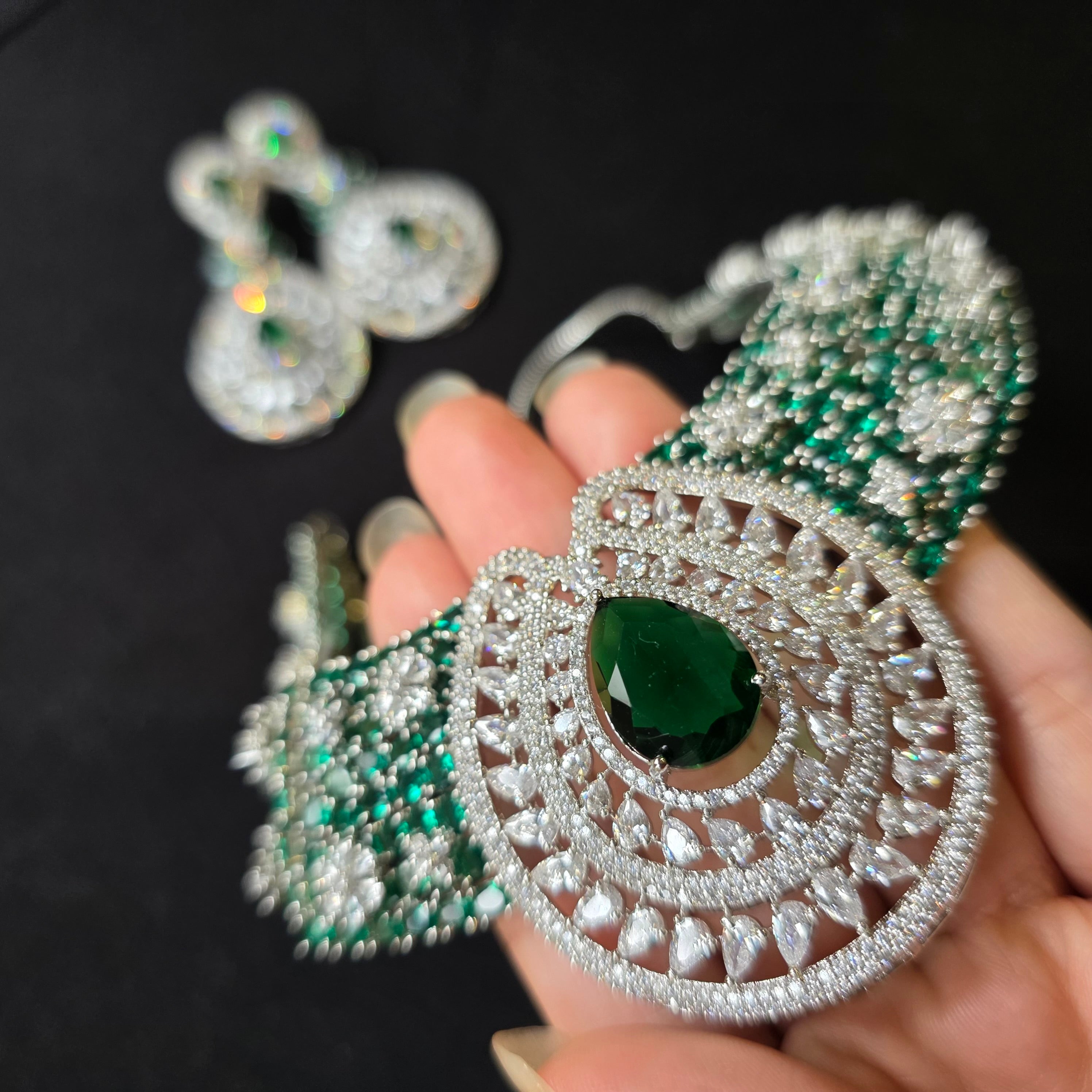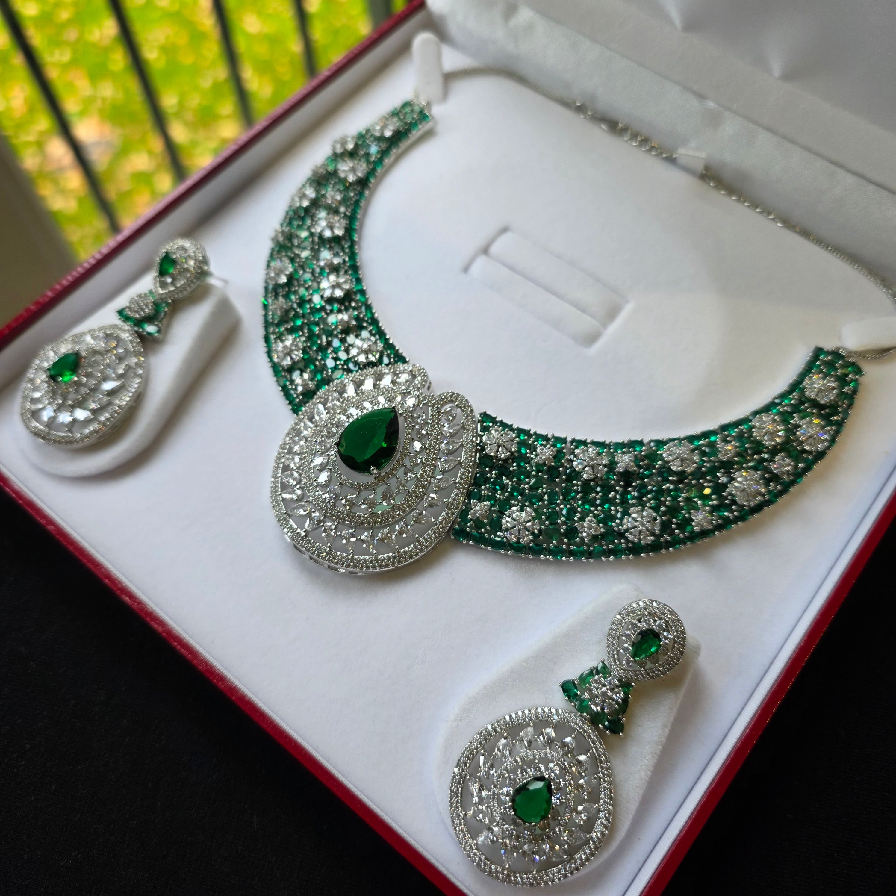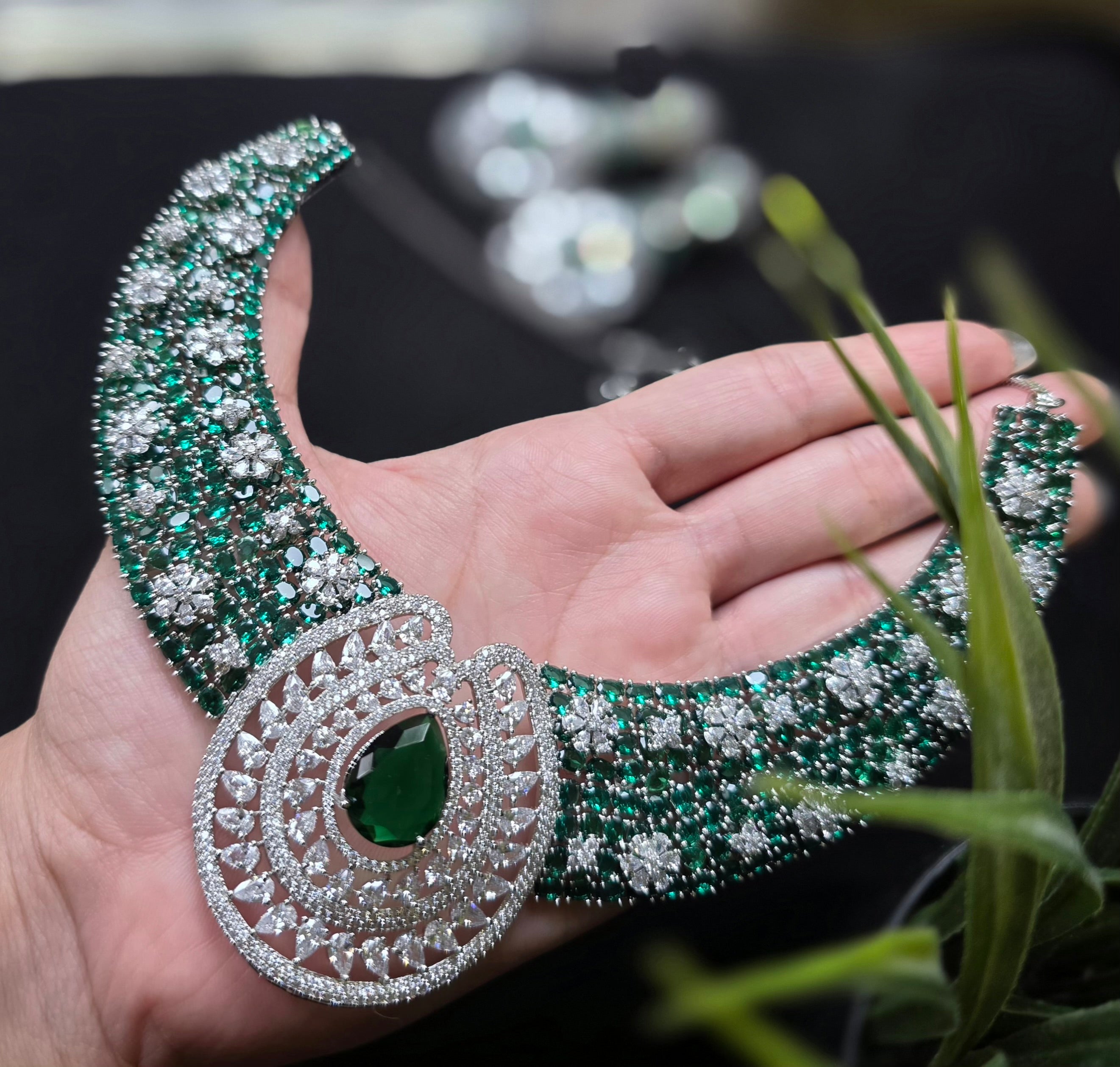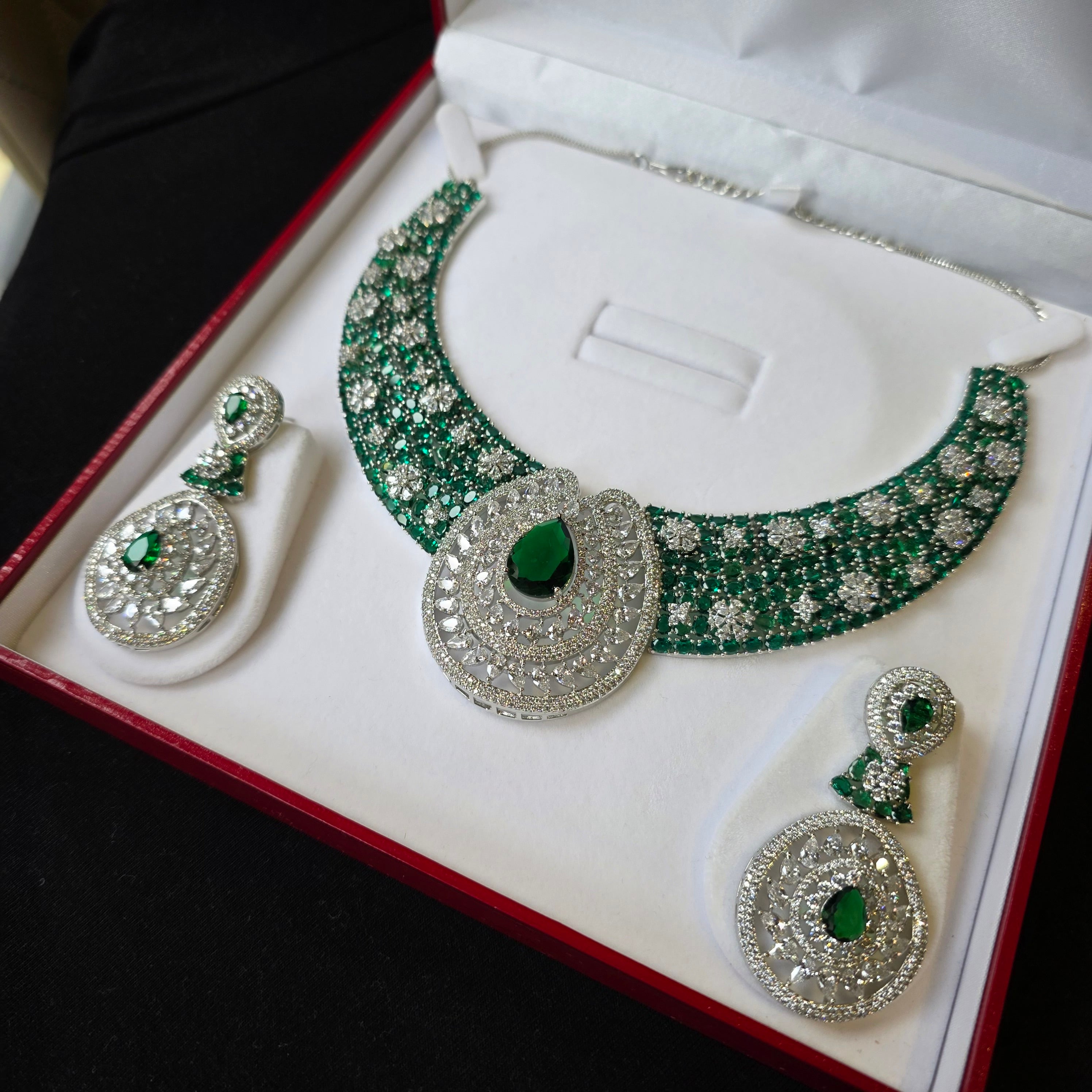 Bespoke Statement piece with Emeralds (lab-made) by finest artisan, complemented by matching Earrings. Add a touch of elegance and sparkle to your look, perfect accessory to elevate any outfit!