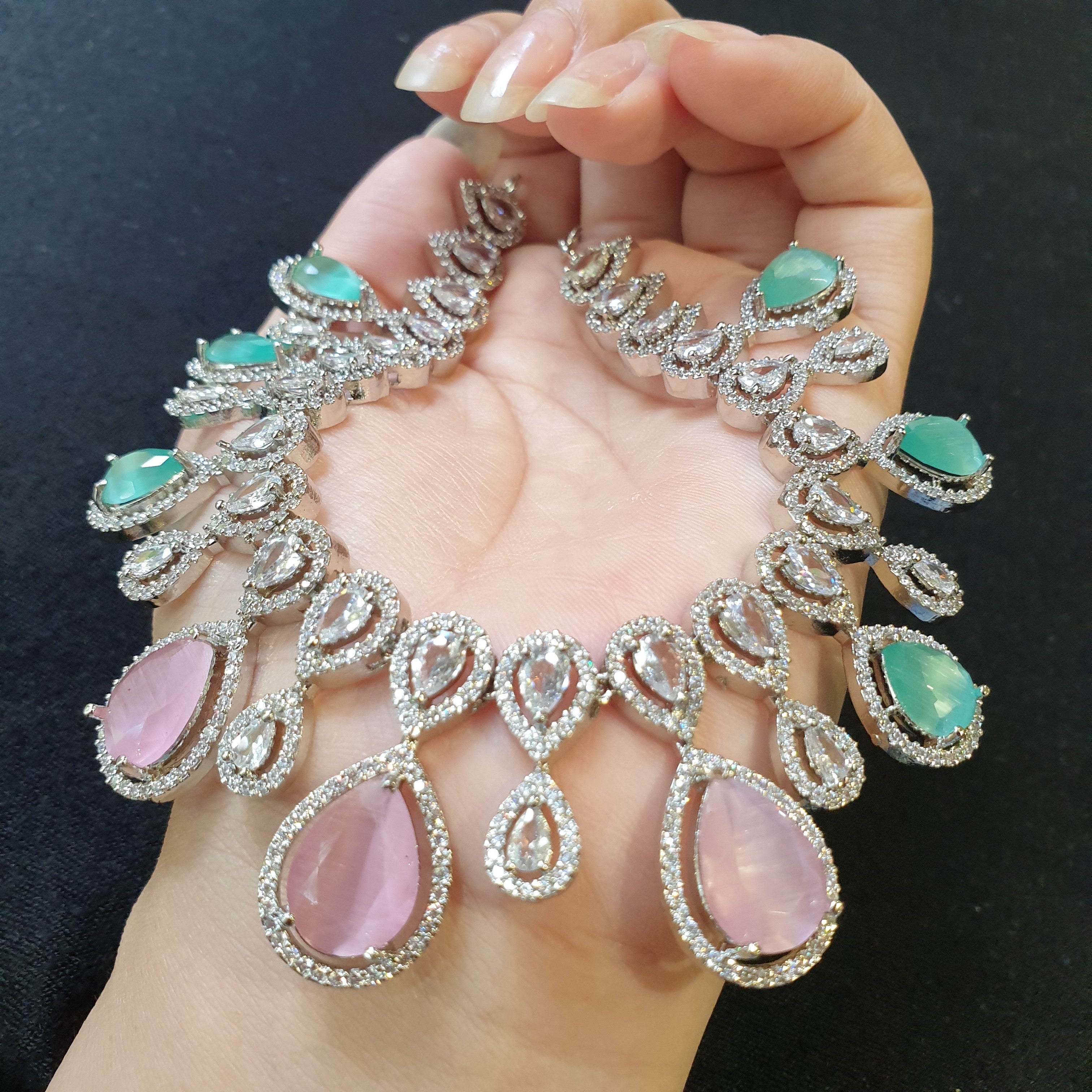 This Lab-Made Mint and Pink Quartz Necklace Set is a stunning fusion of soft, pastel elegance and sparkling brilliance. Featuring delicate mint-green and blush-pink quartz stones, this set is beautifully complemented by brilliant-cut cubic zirconia accents for added radiance. The white gold plating enhances its luxurious appeal while ensuring durability. The necklace showcases a harmonious blend of mint and pink quartz, creating a graceful and romantic look, with matching earrings to complete the set. Perfect for weddings, formal events, or special occasions, this set is hypoallergenic and lightweight, offering both comfort and long-lasting shine. A perfect choice for those who love a unique yet timeless jewelry piece.