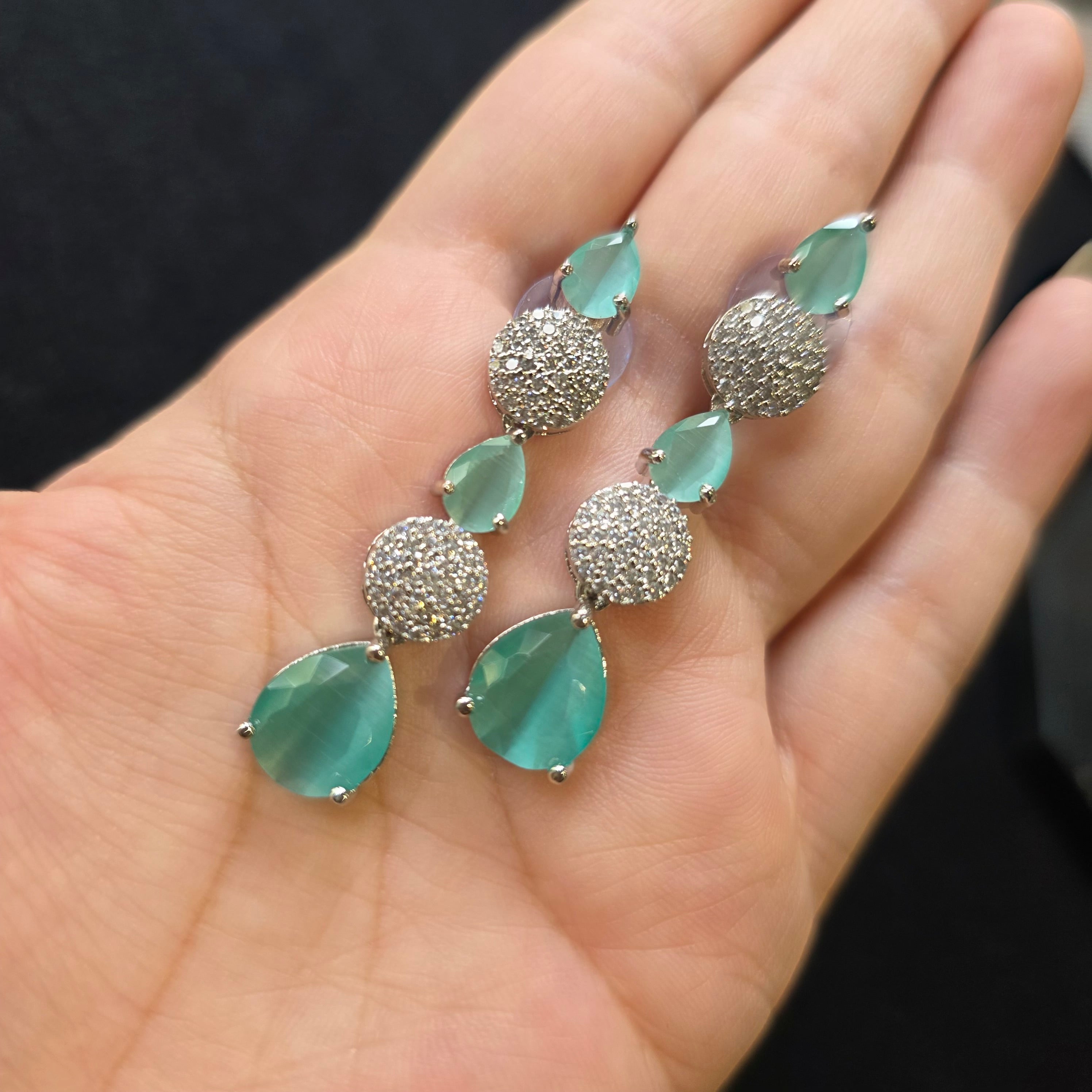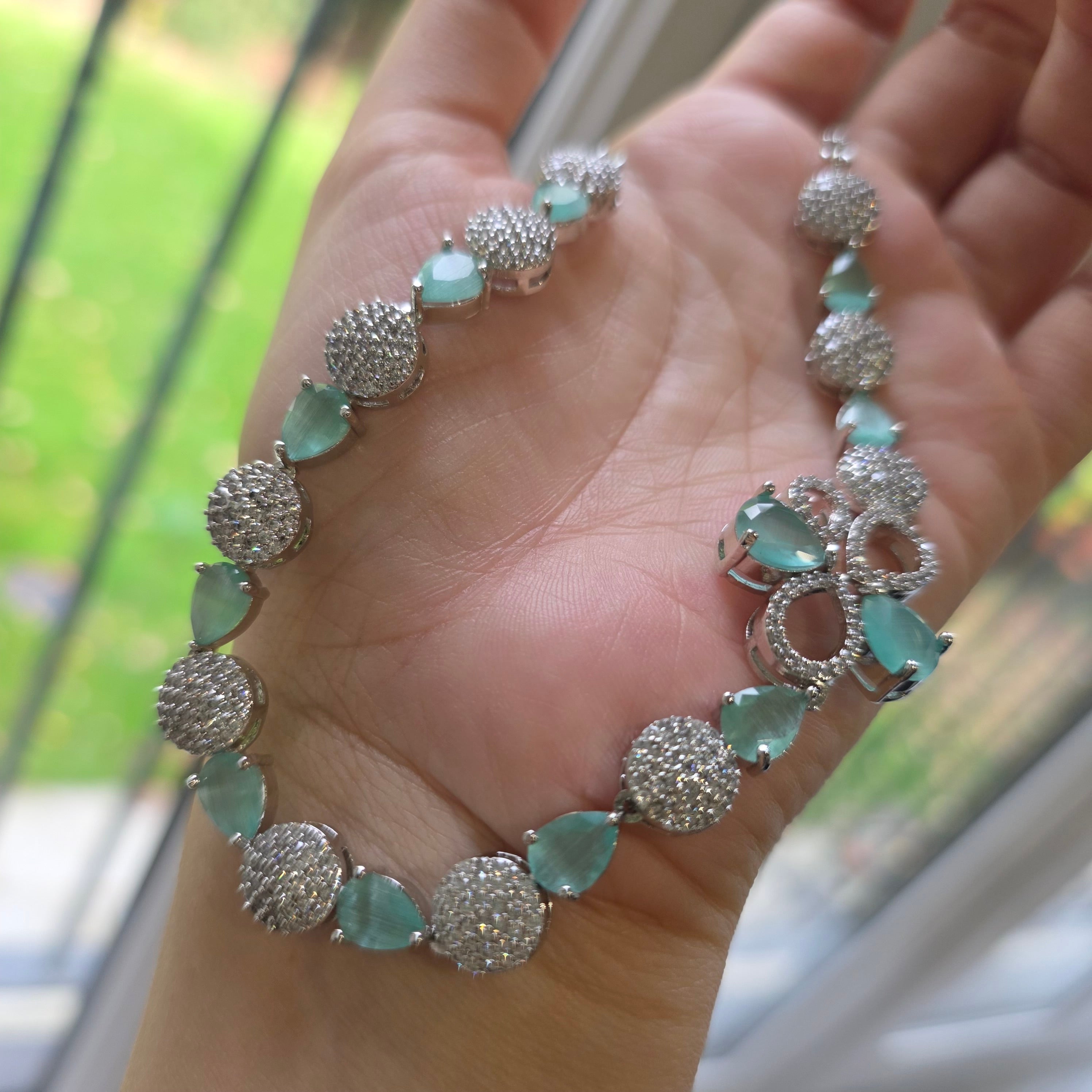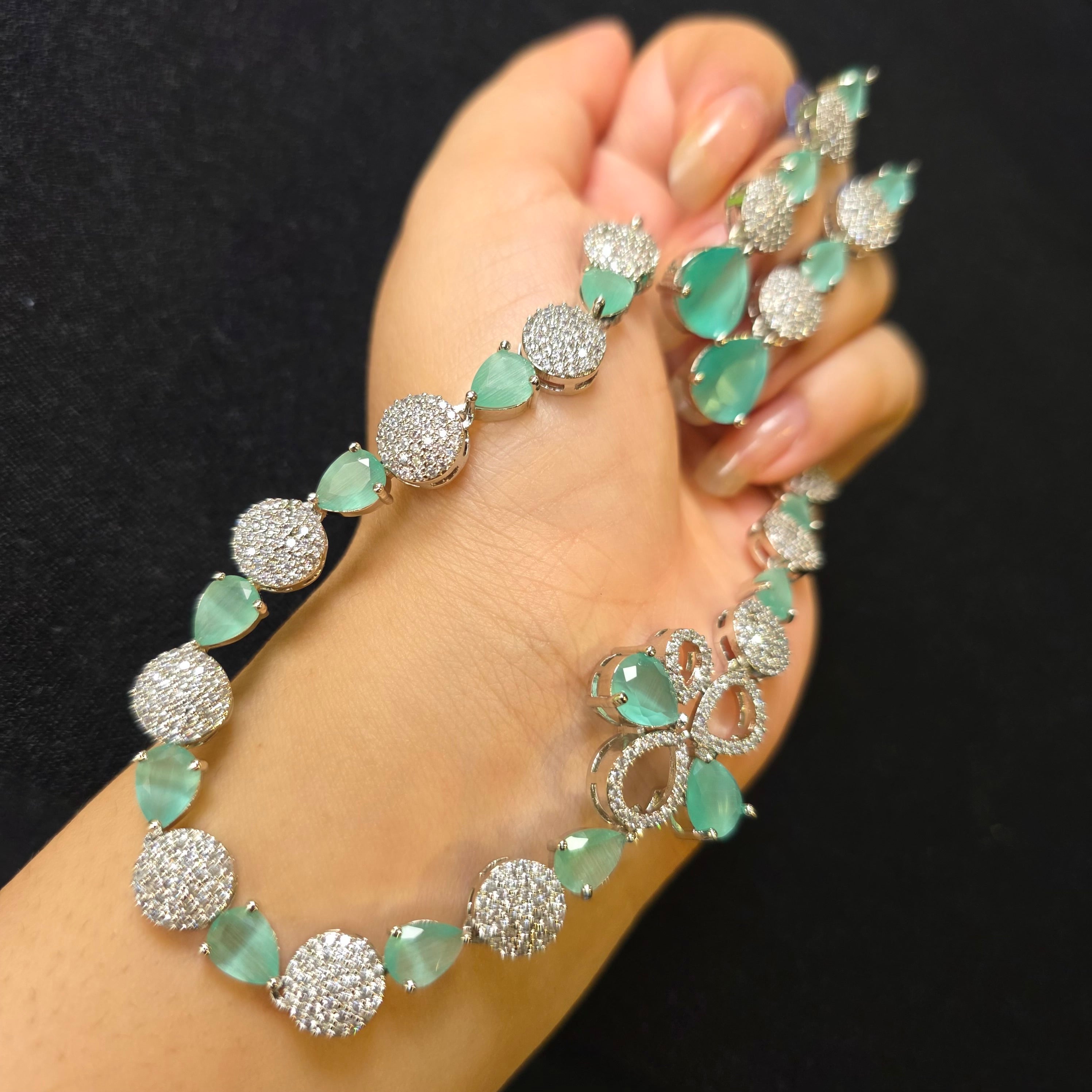 • Earrings: Matching earrings adorned with mint quartz stones, beautifully framed by cubic zirconia for added brilliance and elegance.