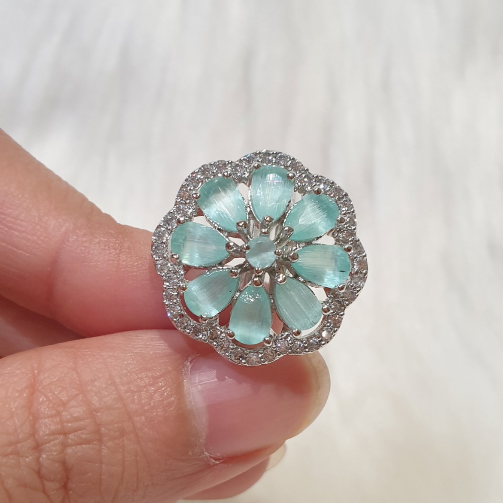 White Gold and Rhodium Plated Size Adjustable Ring with Mint Quartz and Cubic Zirconia.