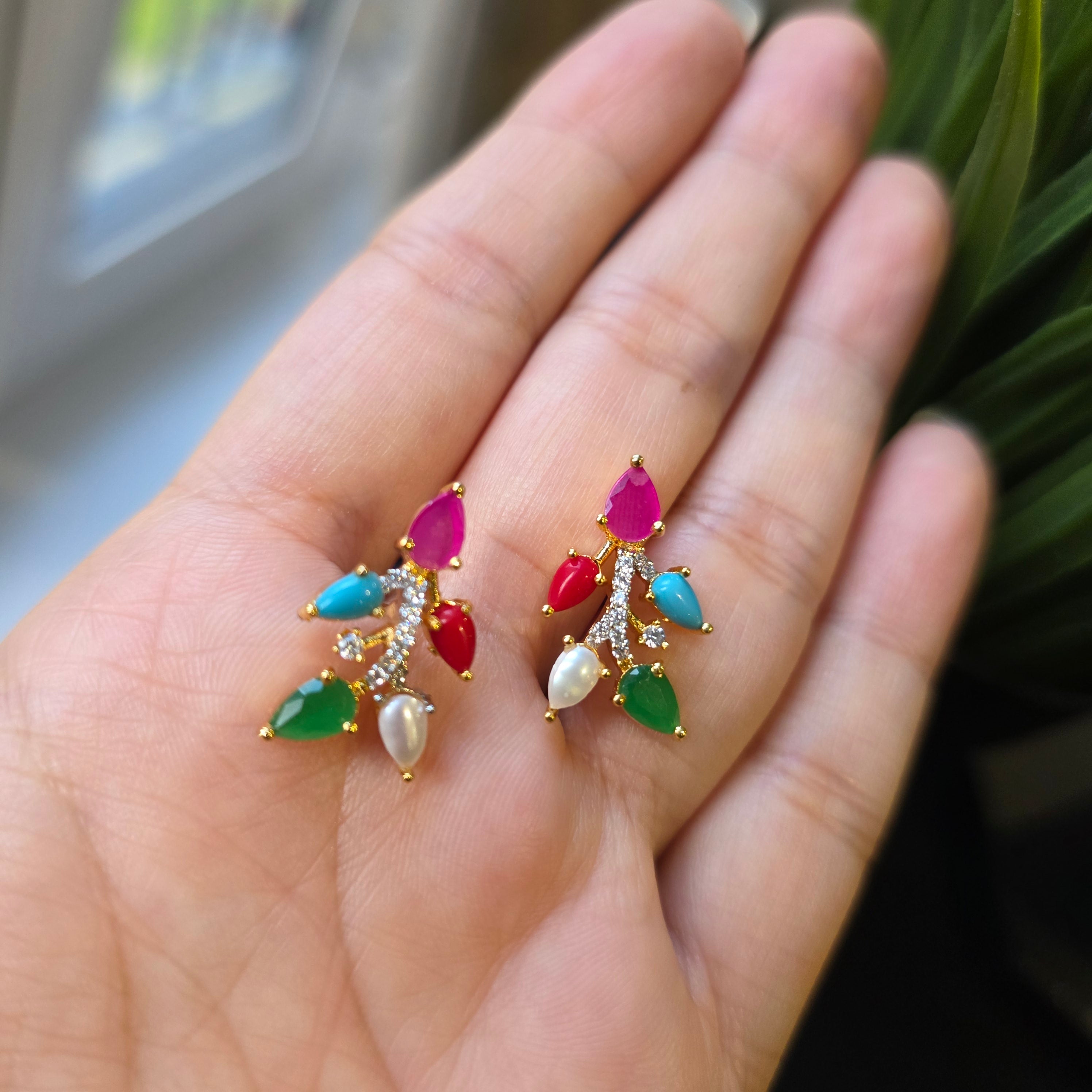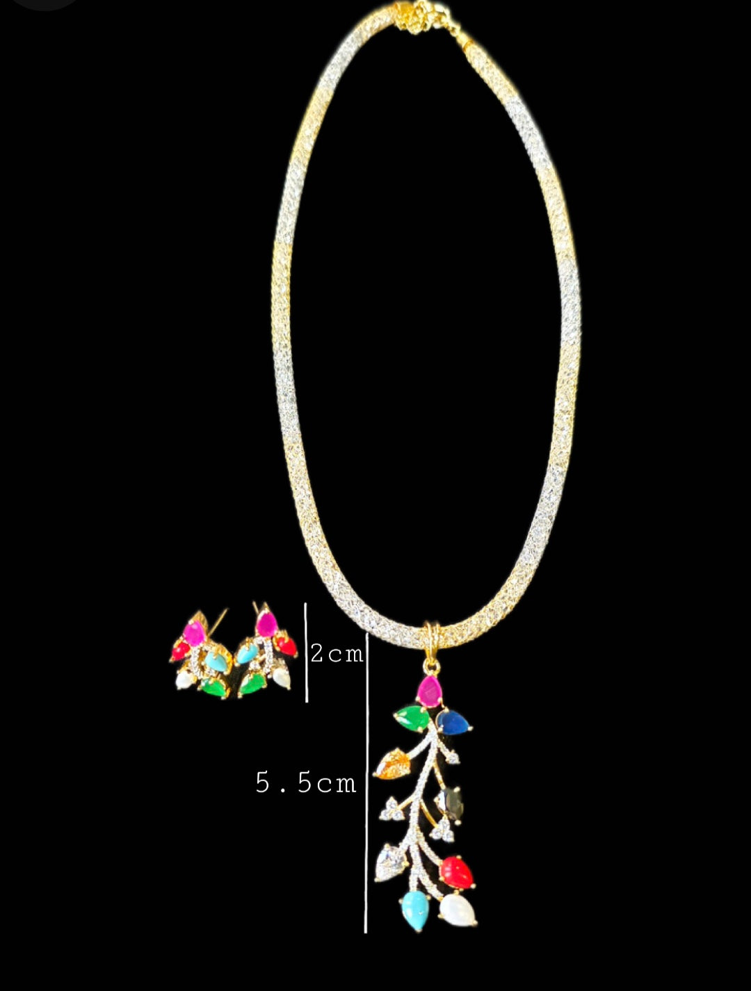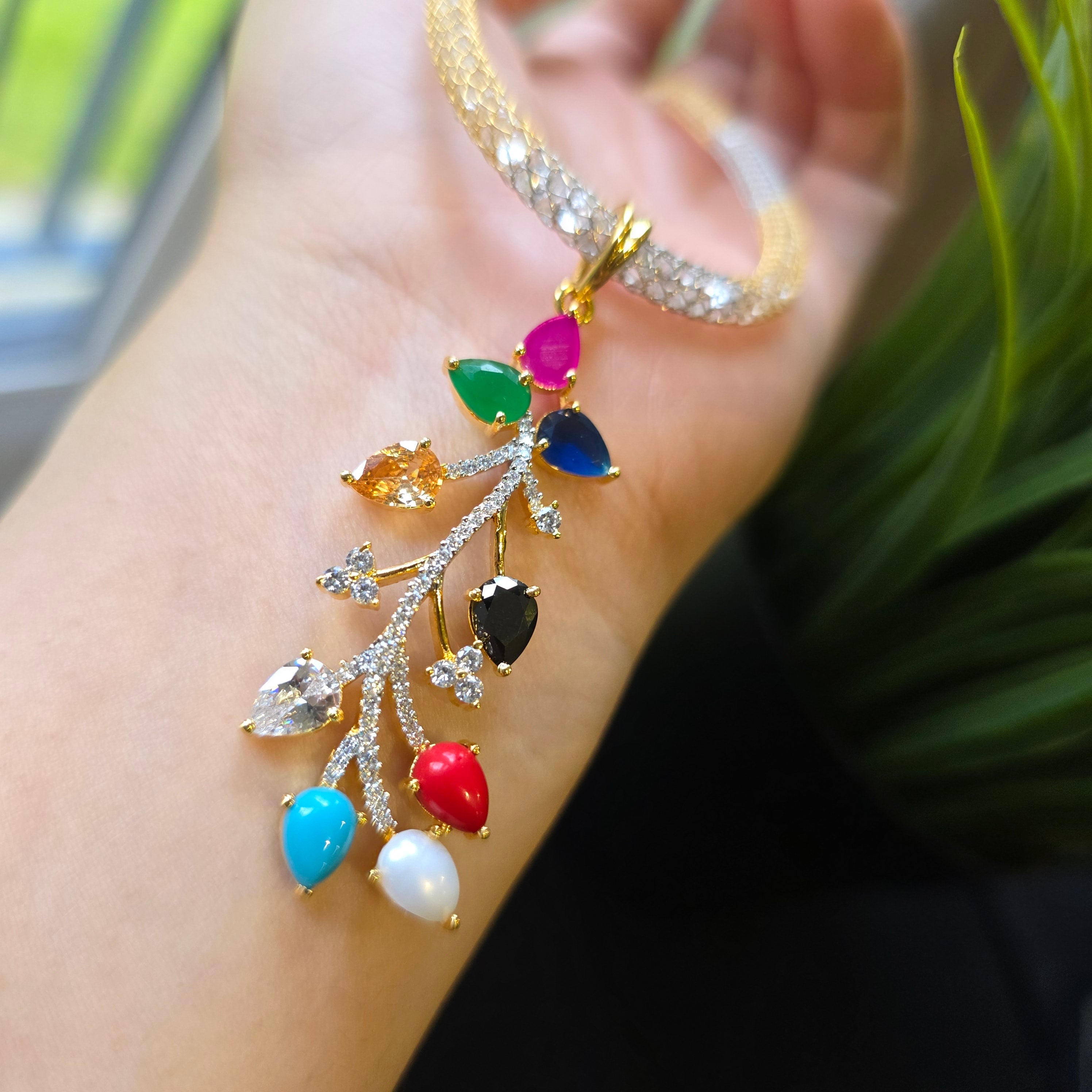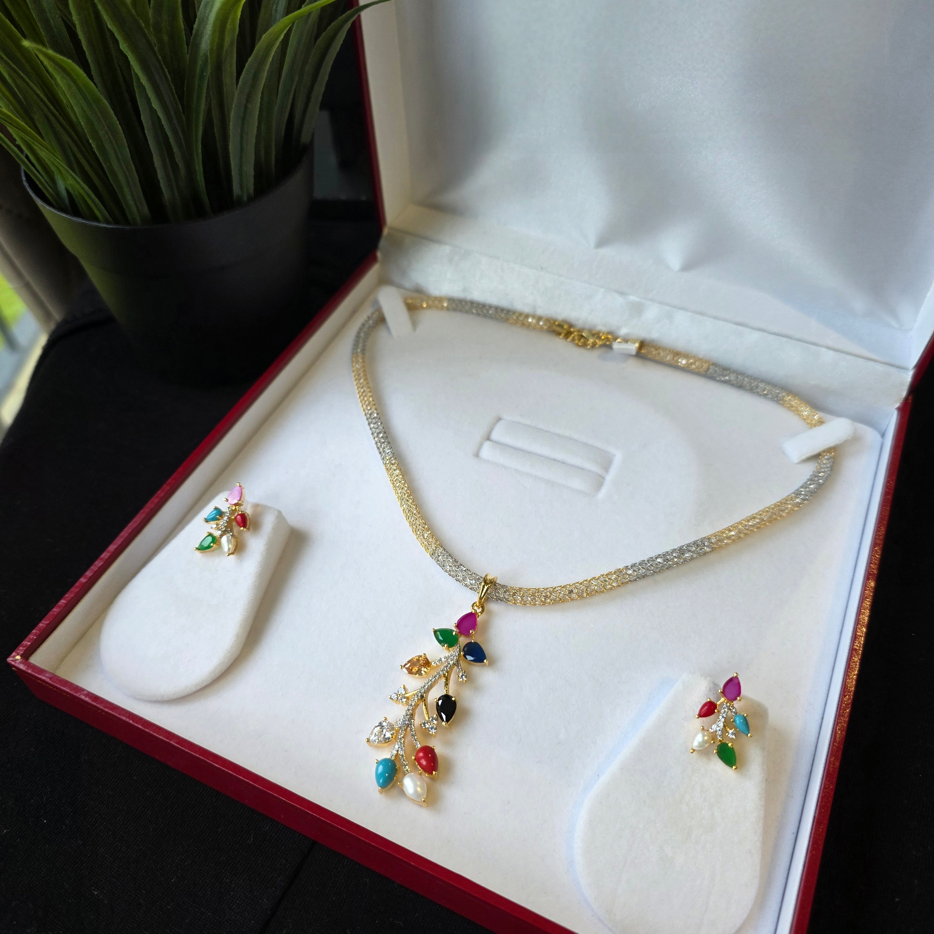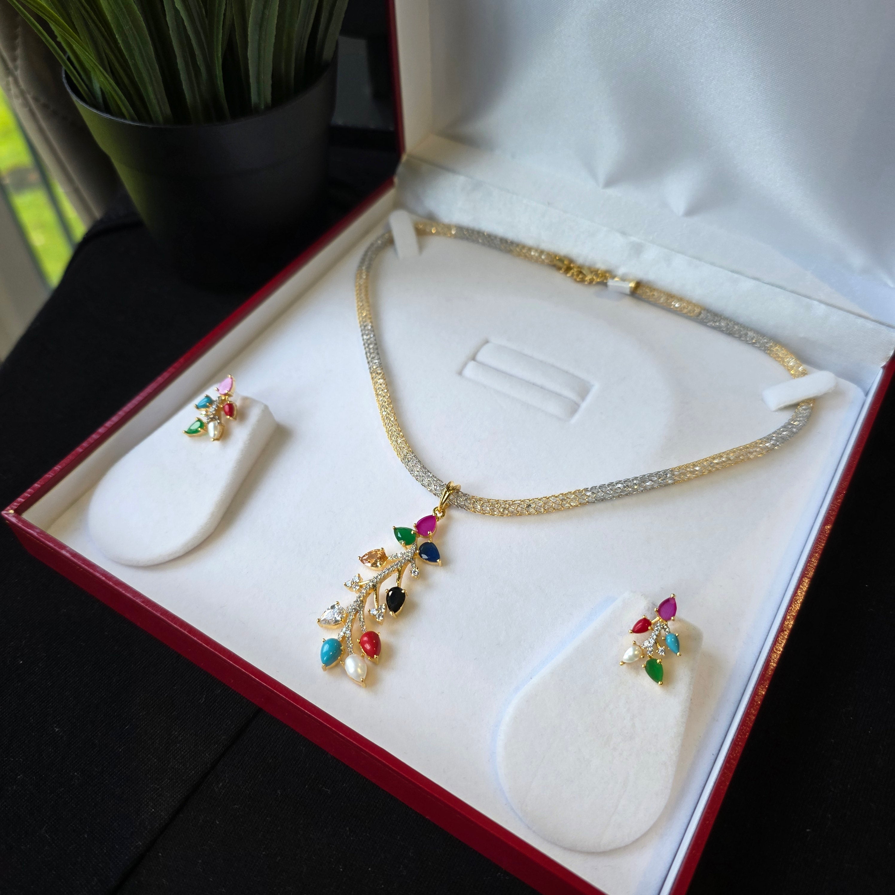 The Stunning piece featuring Multi Gemstones (lab-made) and Cubic Zirconia studded Pendant paired with matching Earrings.