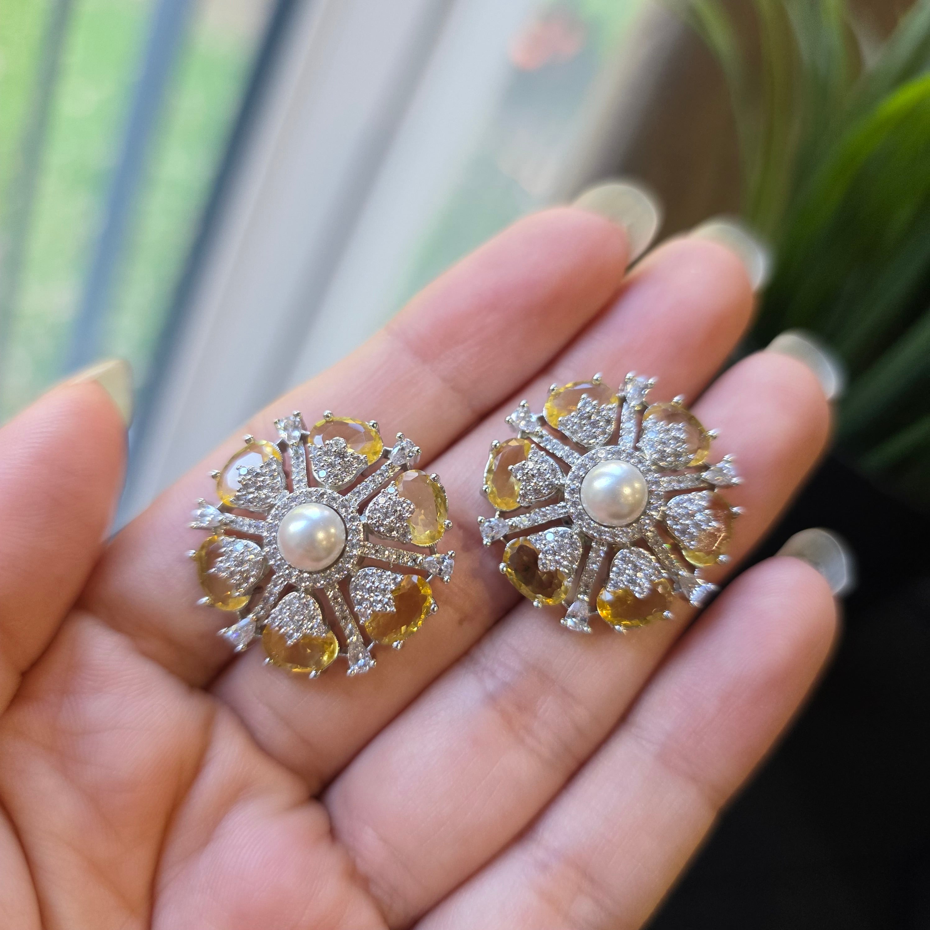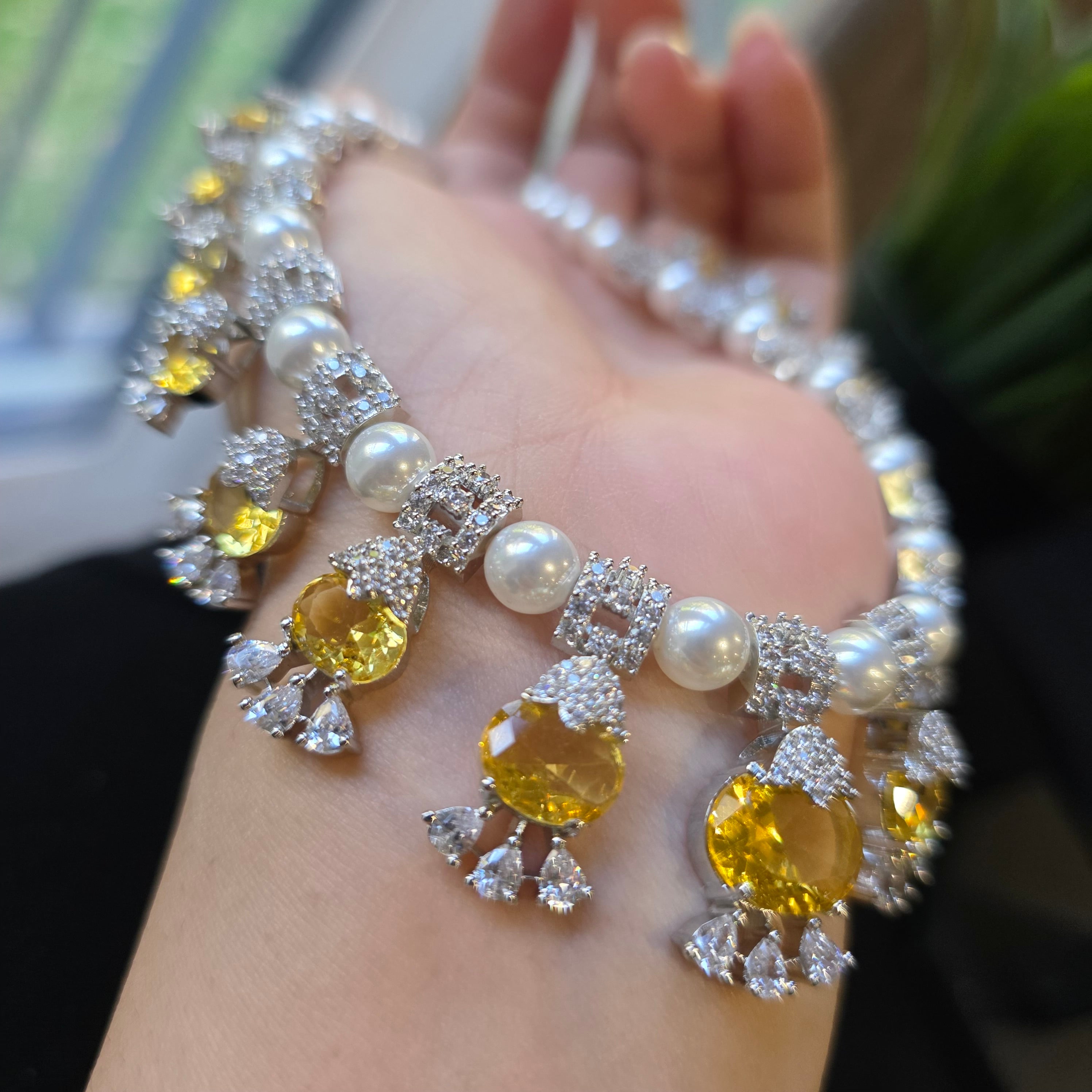 Timeless piece featuring stunning Yellow Citrine (lab-made) and luxurious Pearls studded Necklace paired with matching Earrings (Studs).