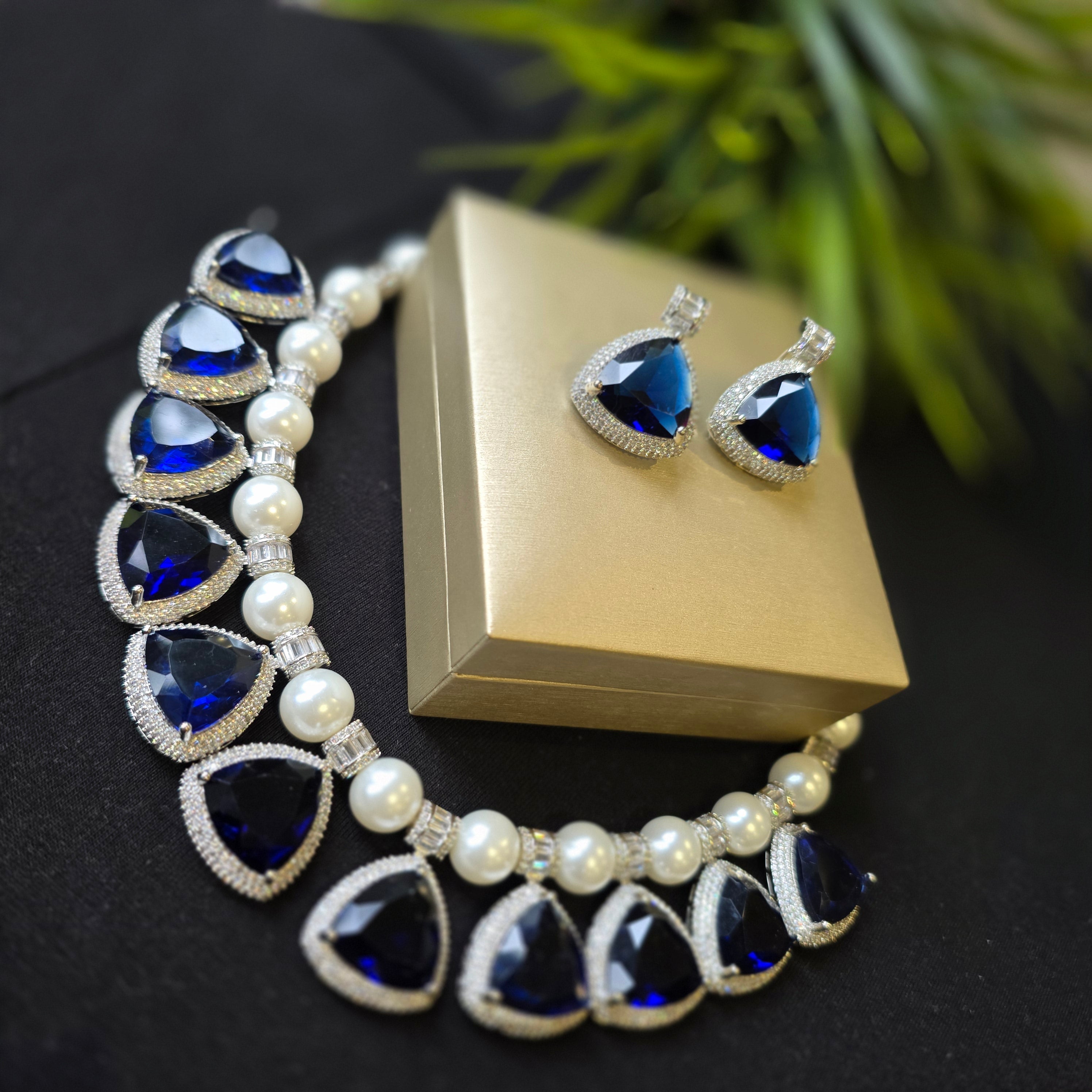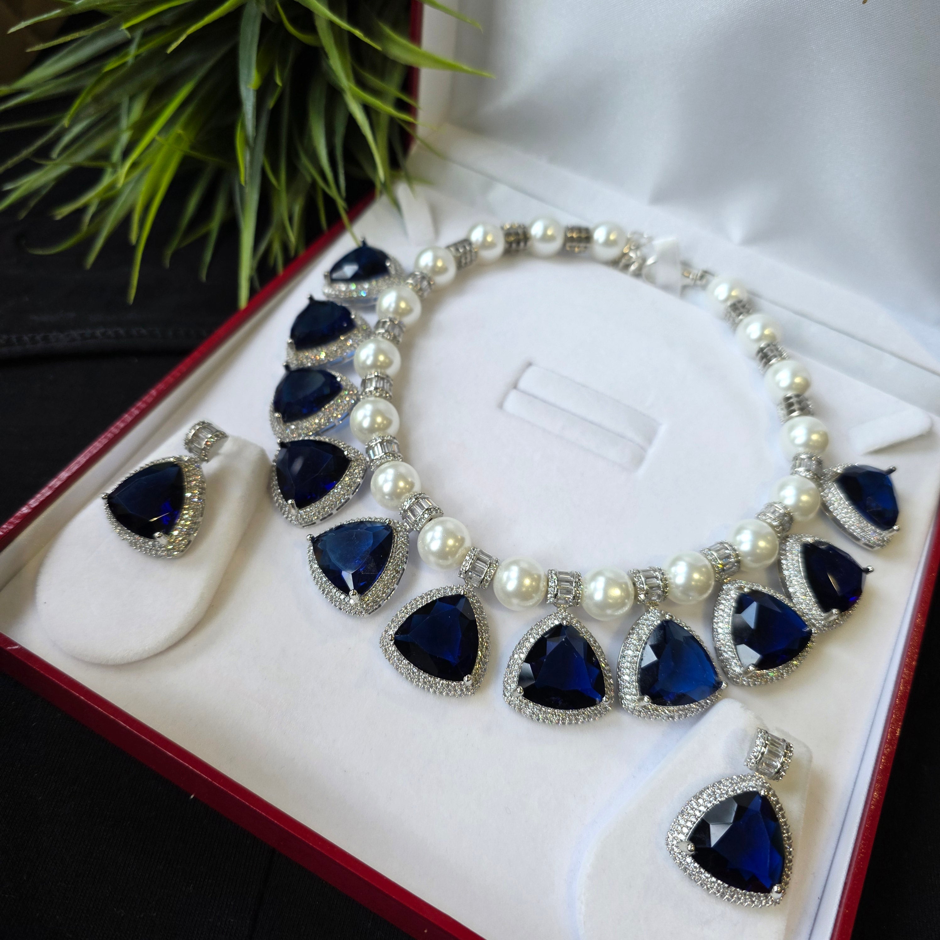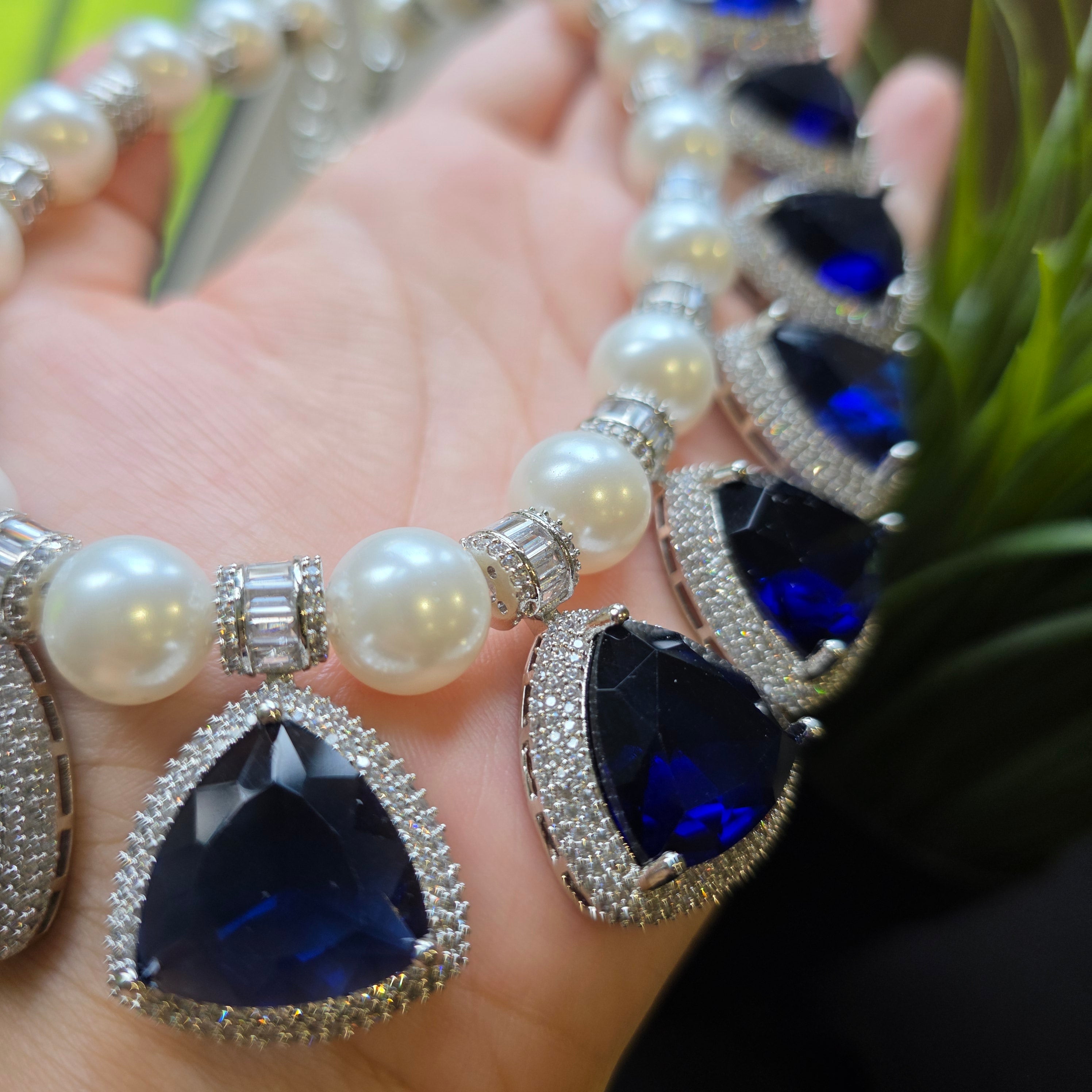 Introducing Timeless piece featuring stunning Blue Sapphires (lab-made) and luxurious Pearls studded Necklace paired with matching Earrings (Studs).