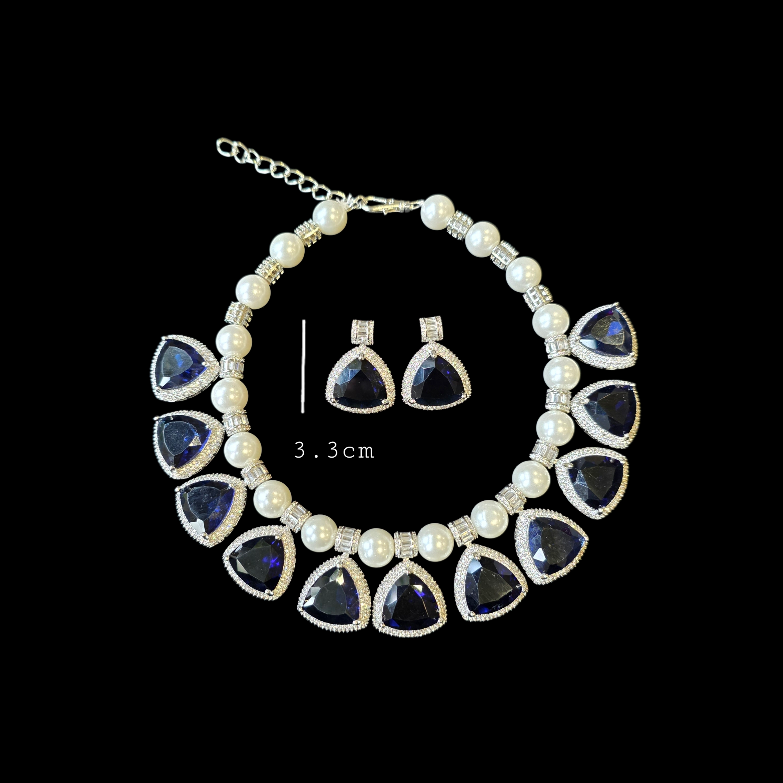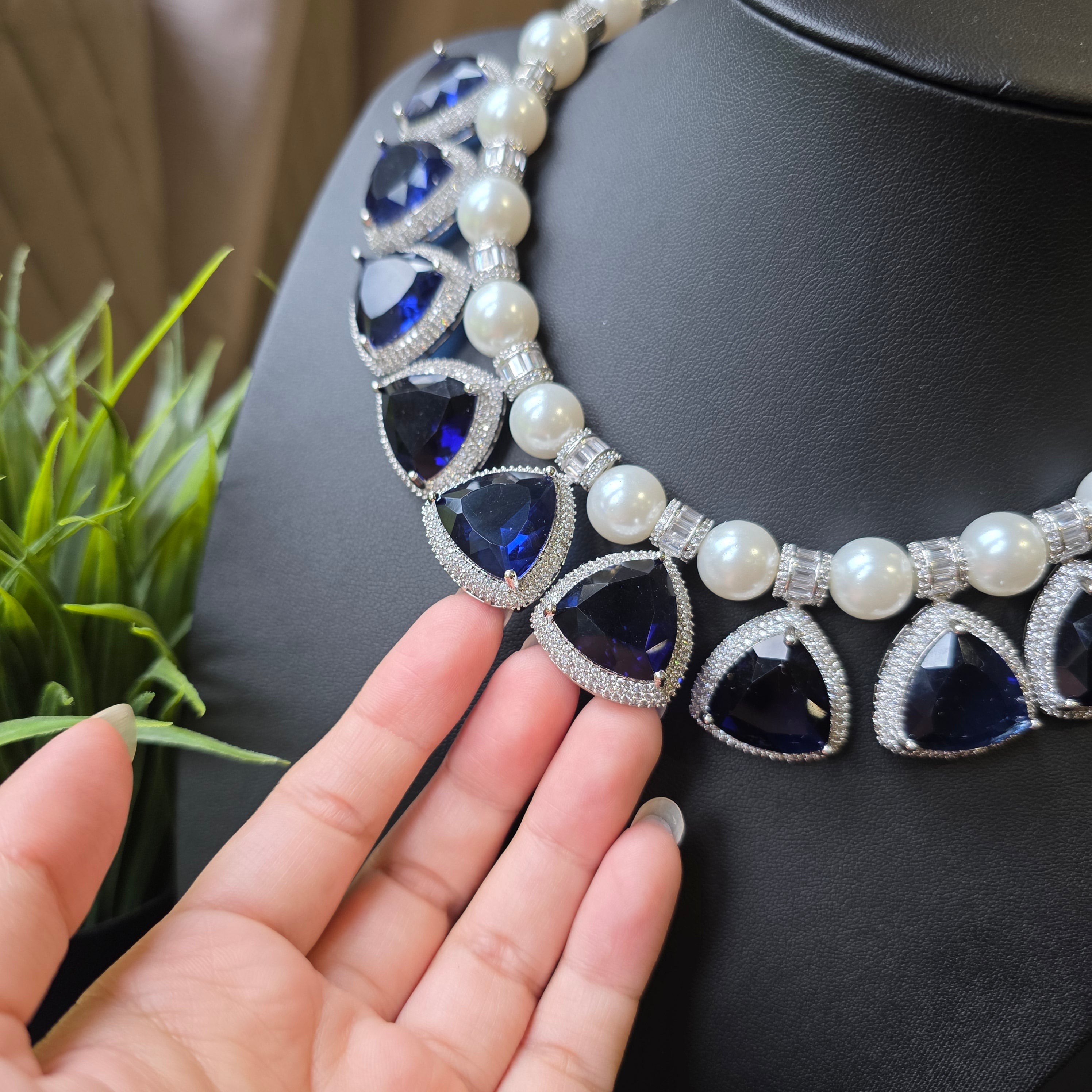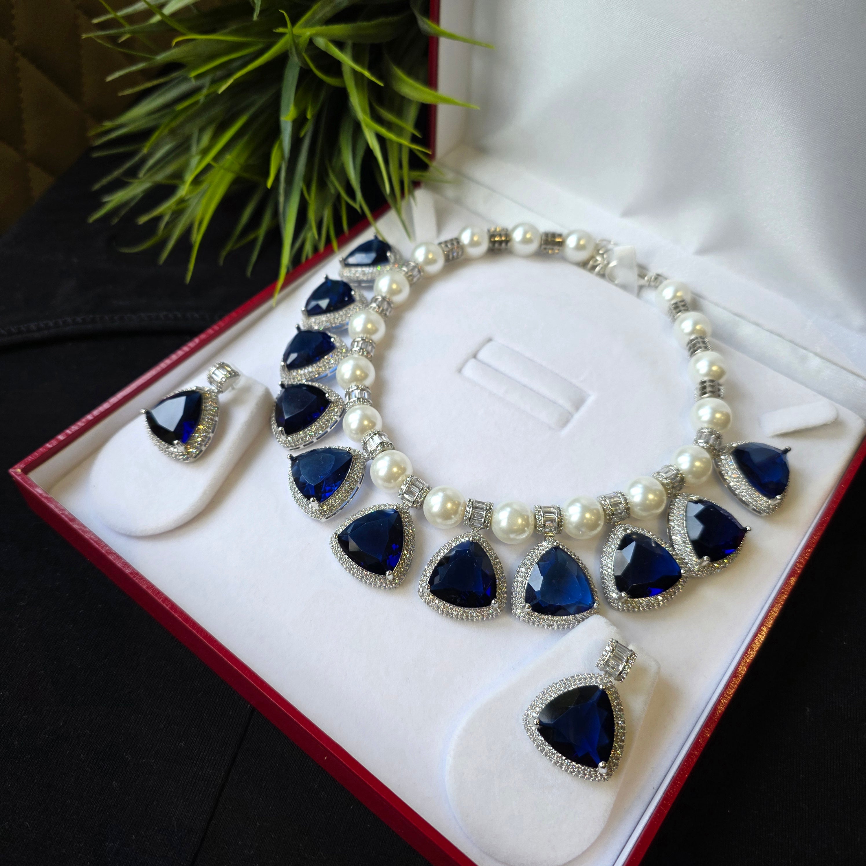 Introducing Timeless piece featuring stunning Blue Sapphires (lab-made) and luxurious Pearls studded Necklace paired with matching Earrings (Studs).