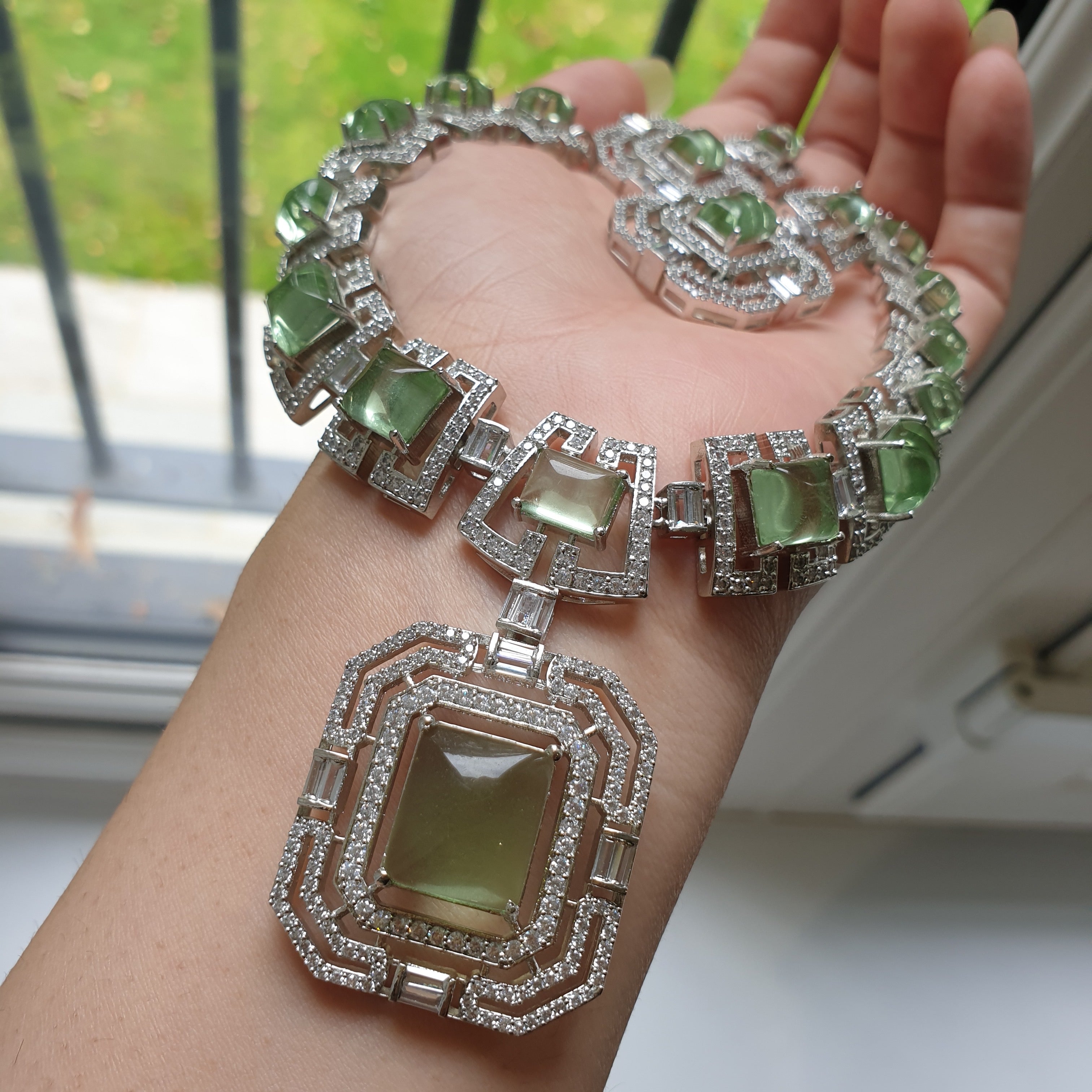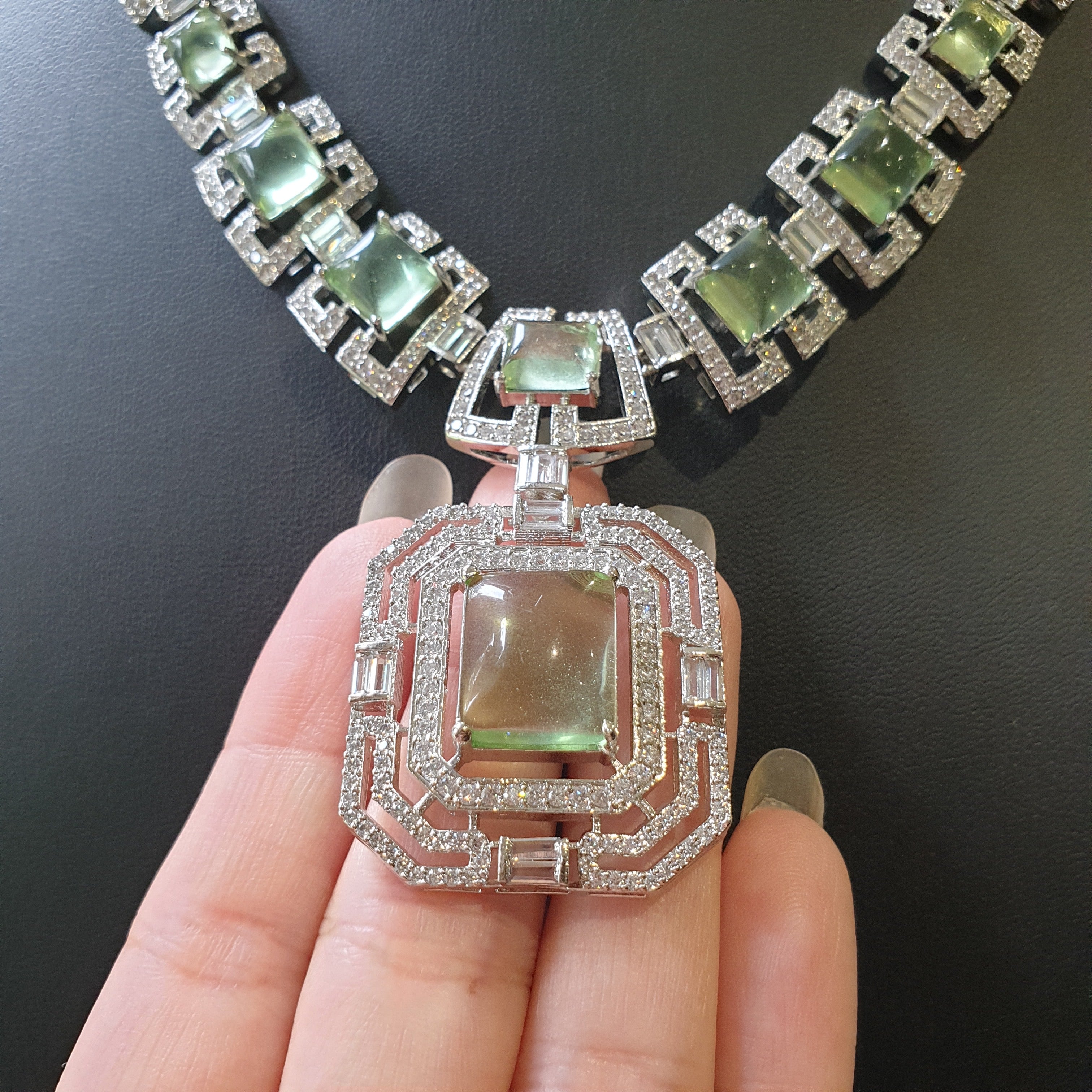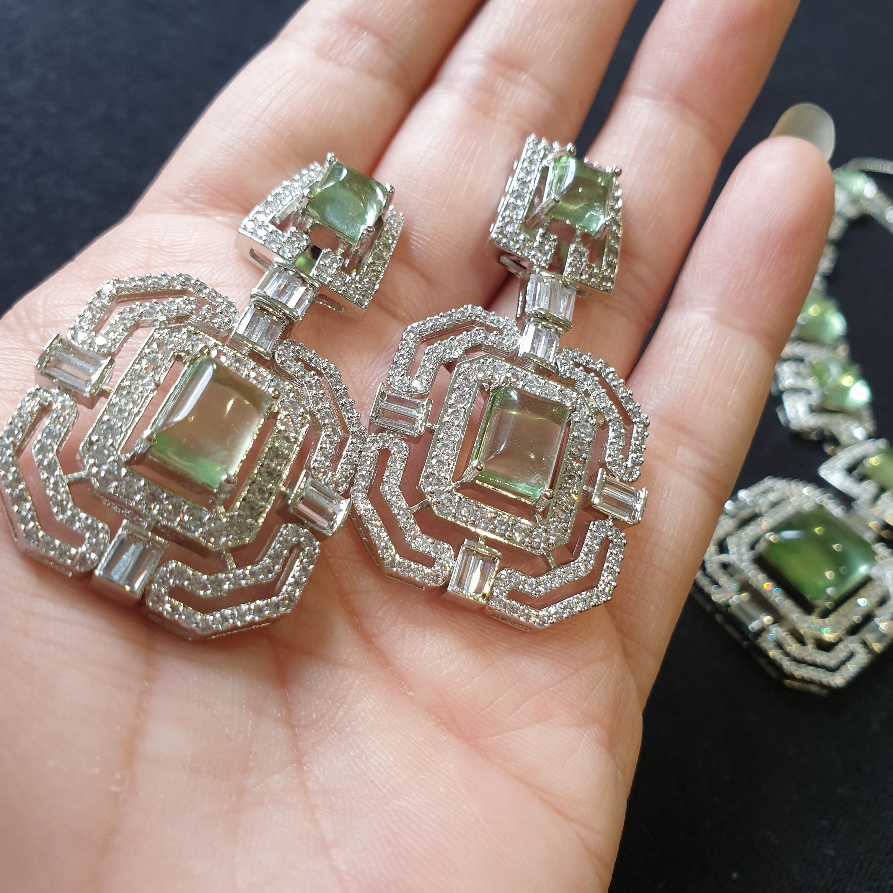 Accentuating the olive quartz are sparkling cubic zirconia, meticulously set to add extra brilliance and enhance the overall elegance of the piece. The set is white gold plated, providing a sleek, modern finish that beautifully complements the rich green tones of the quartz.