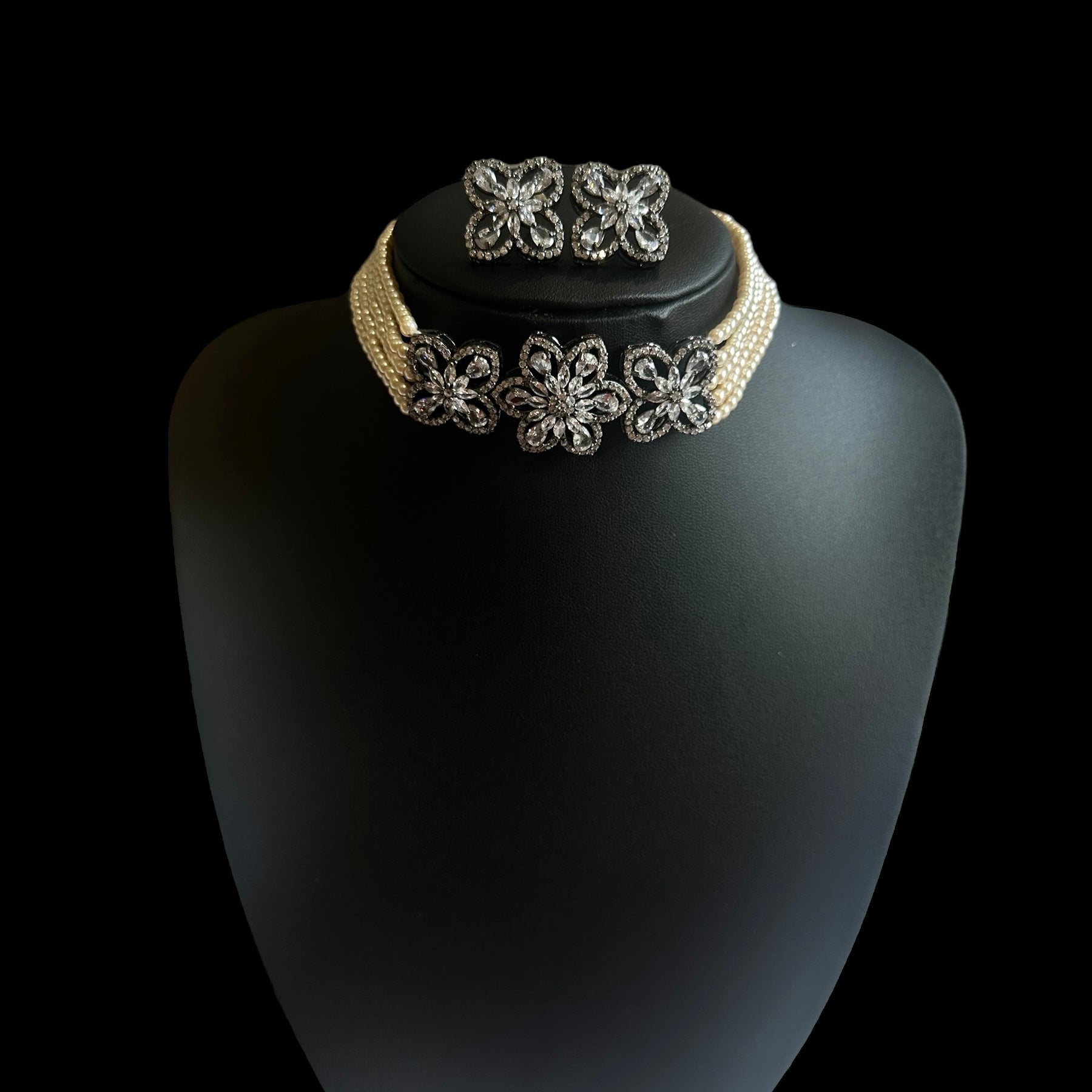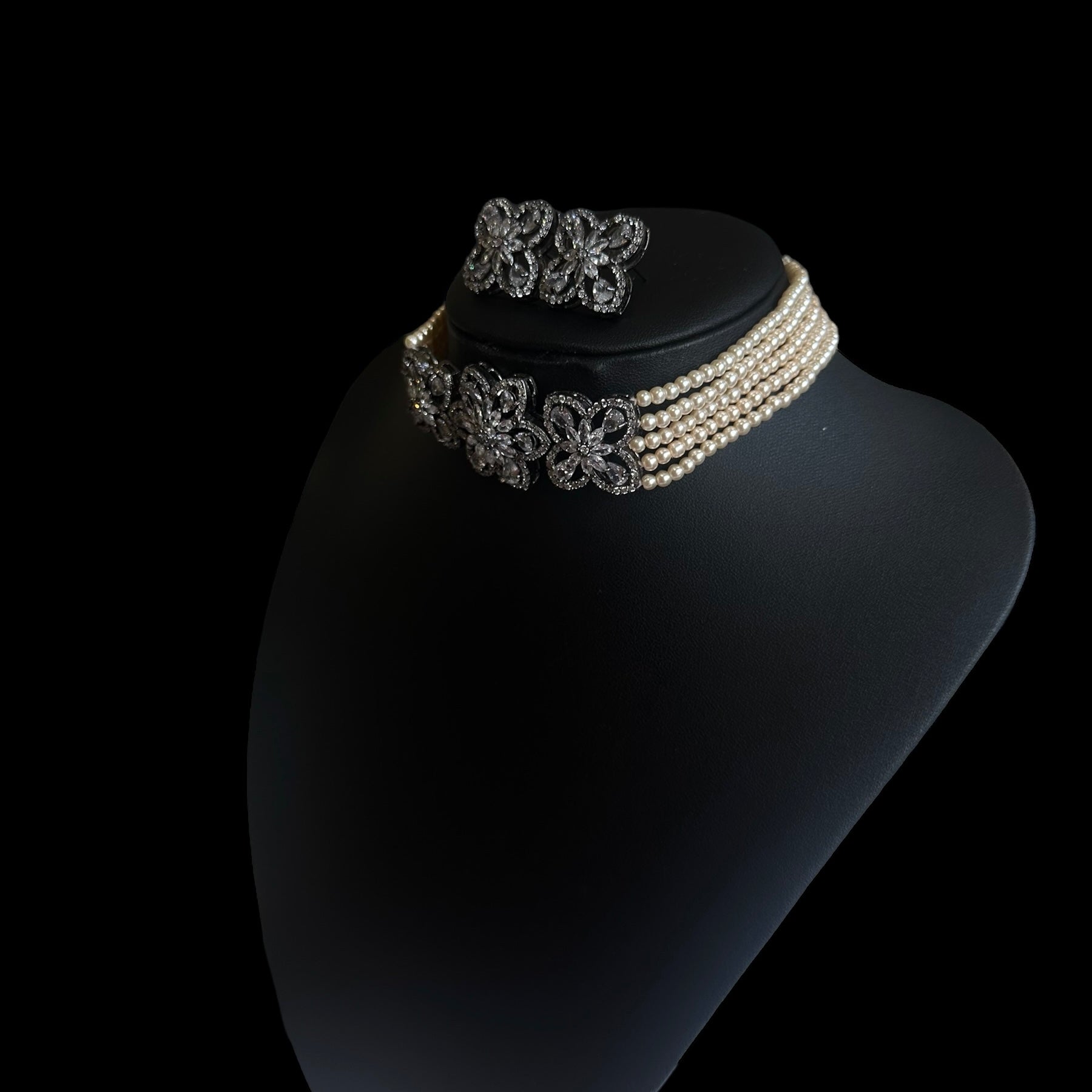 This stunning oxidized choker set features a unique blend of vintage charm and contemporary elegance. The choker is intricately designed with an oxidized finish, giving it a rich, antique look. The centerpiece of the choker is adorned with lustrous pearls, providing a soft contrast to the darkened metal. Surrounding the pearls are brilliant cubic zirconia stones, carefully set to add a touch of sparkle. The set includes matching earrings, each echoing the choker’s design with pearls and cubic zirconia set in oxidized metal. This set is perfect for making a bold yet sophisticated statement.
