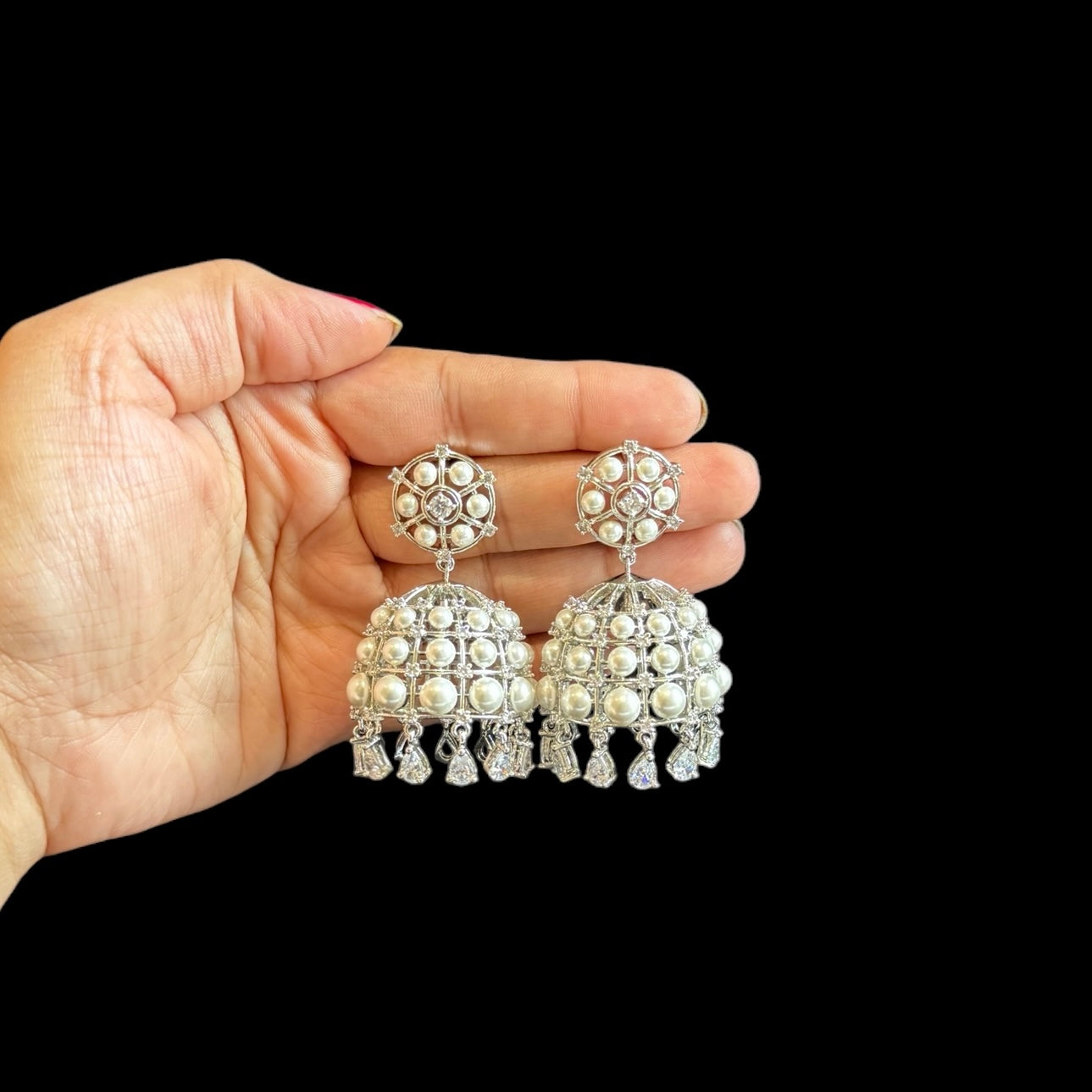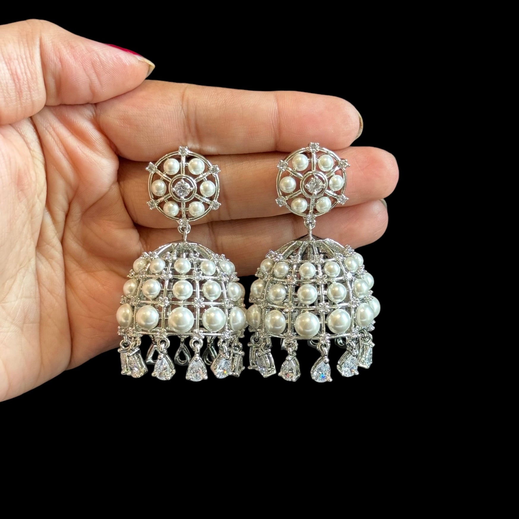 These elegant jhumka earrings feature a sophisticated design that combines the timeless beauty of pearls with the sparkle of cubic zirconia. The earrings showcase stunning lab-made pearls. The jhumka, adorned with intricate detailing and embellished with sparkling cubic zirconia stones, adds a touch of glamour and sophistication.