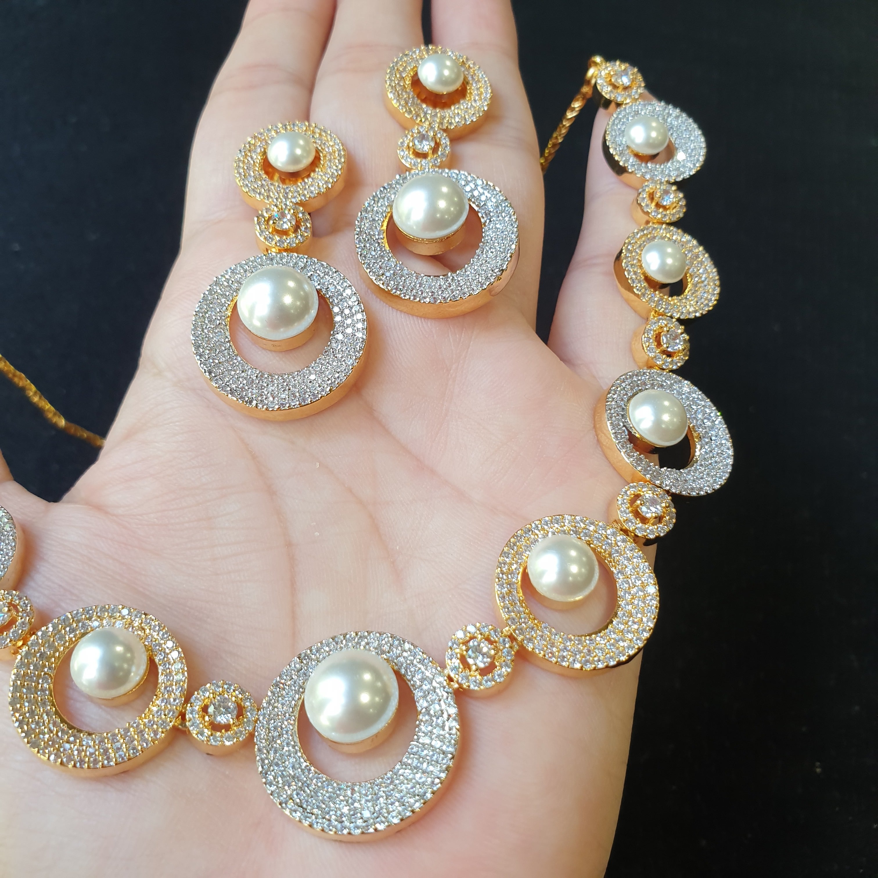 Elegant and versatile, this pearl necklace and earring set blends classic charm with contemporary style. Featuring luminous pearls at the center, each piece is delicately accented with sparkling cubic zirconia for refined brilliance. The unique two-tone plating in white and yellow gold adds a luxurious contrast, making this set a perfect complement to any outfit.