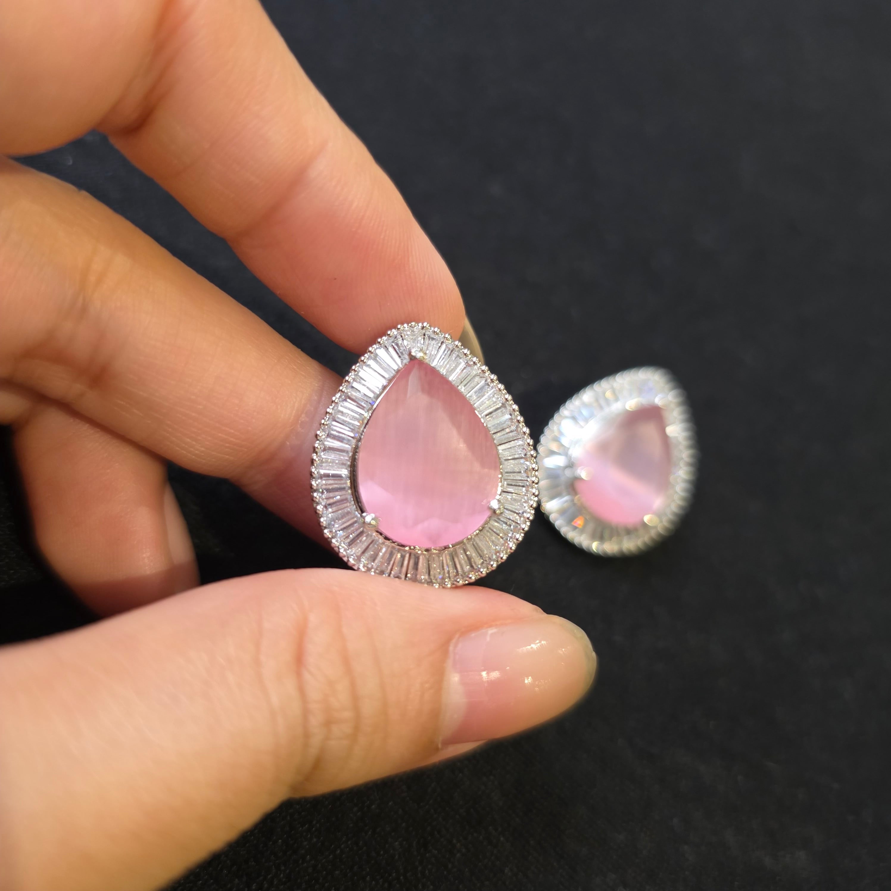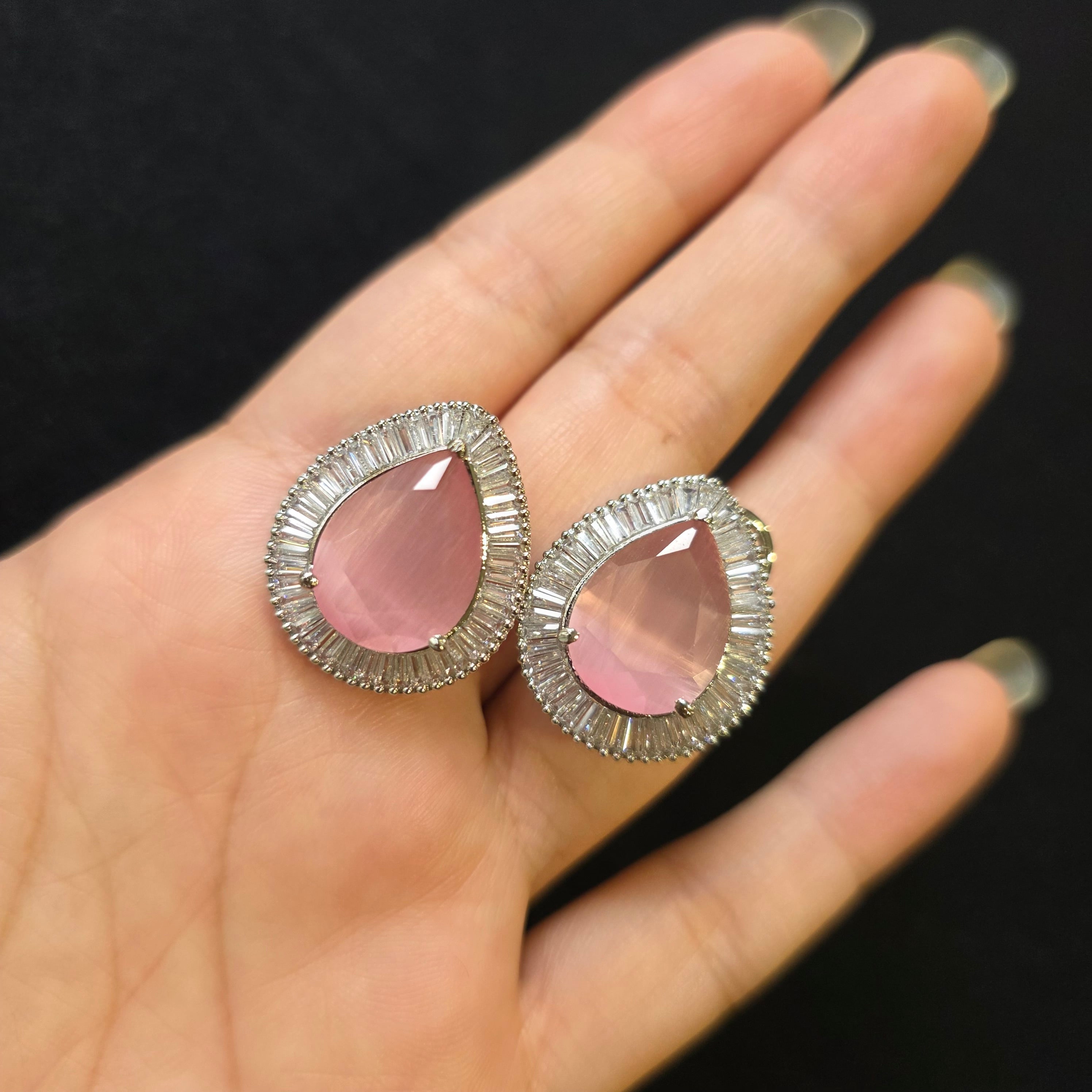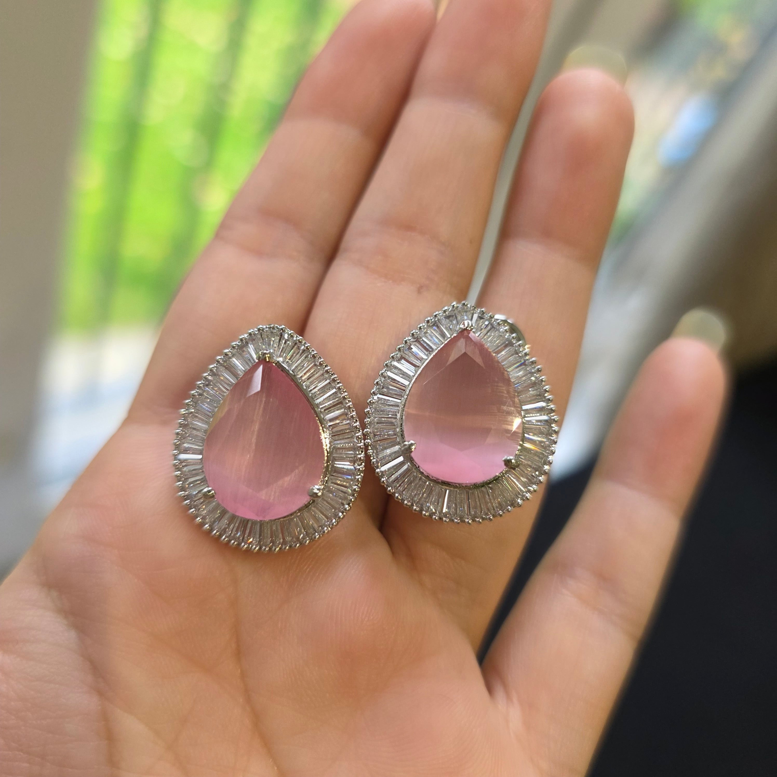 White Gold and Rhodium plated earrings with Pink Quartz and Cubic Zirconia.