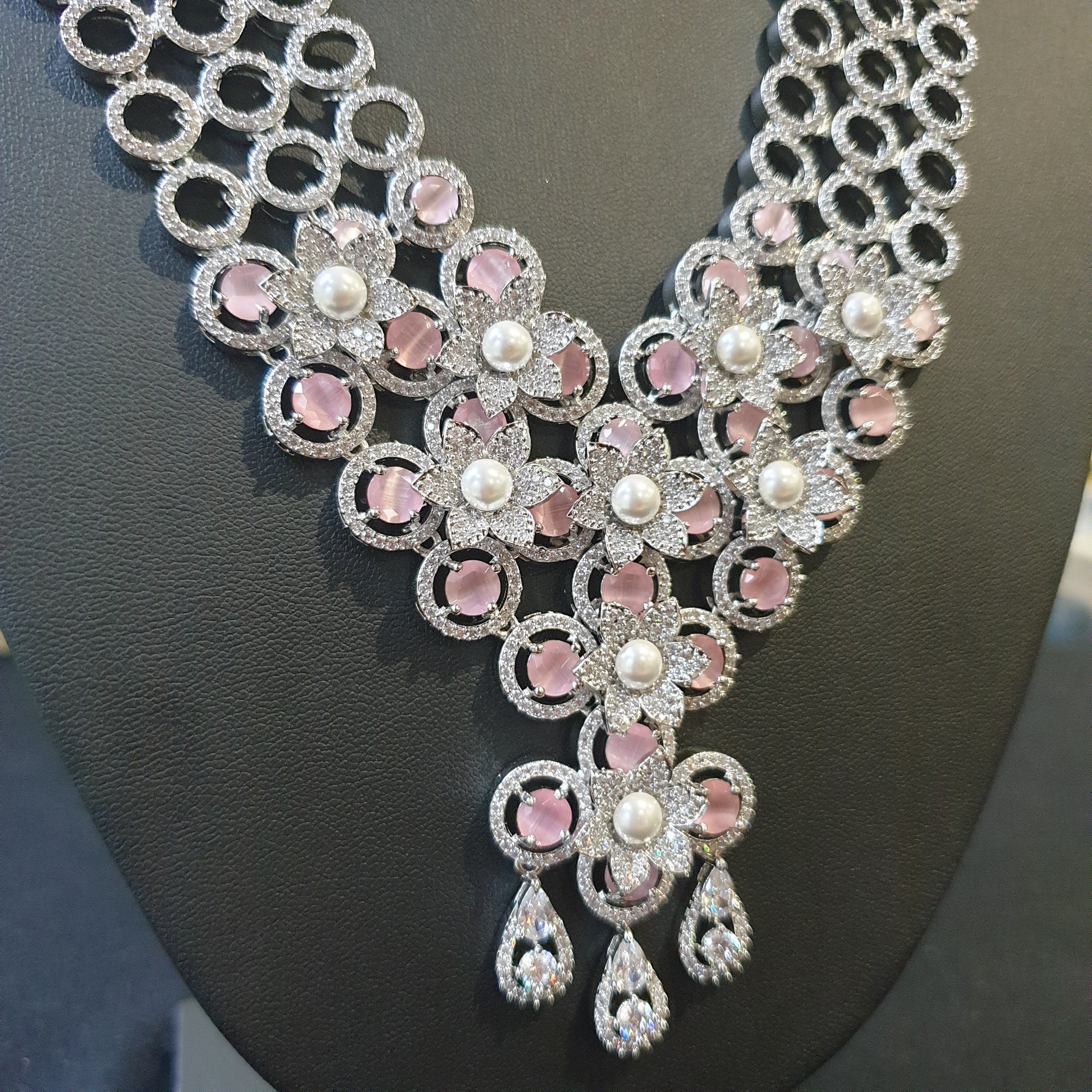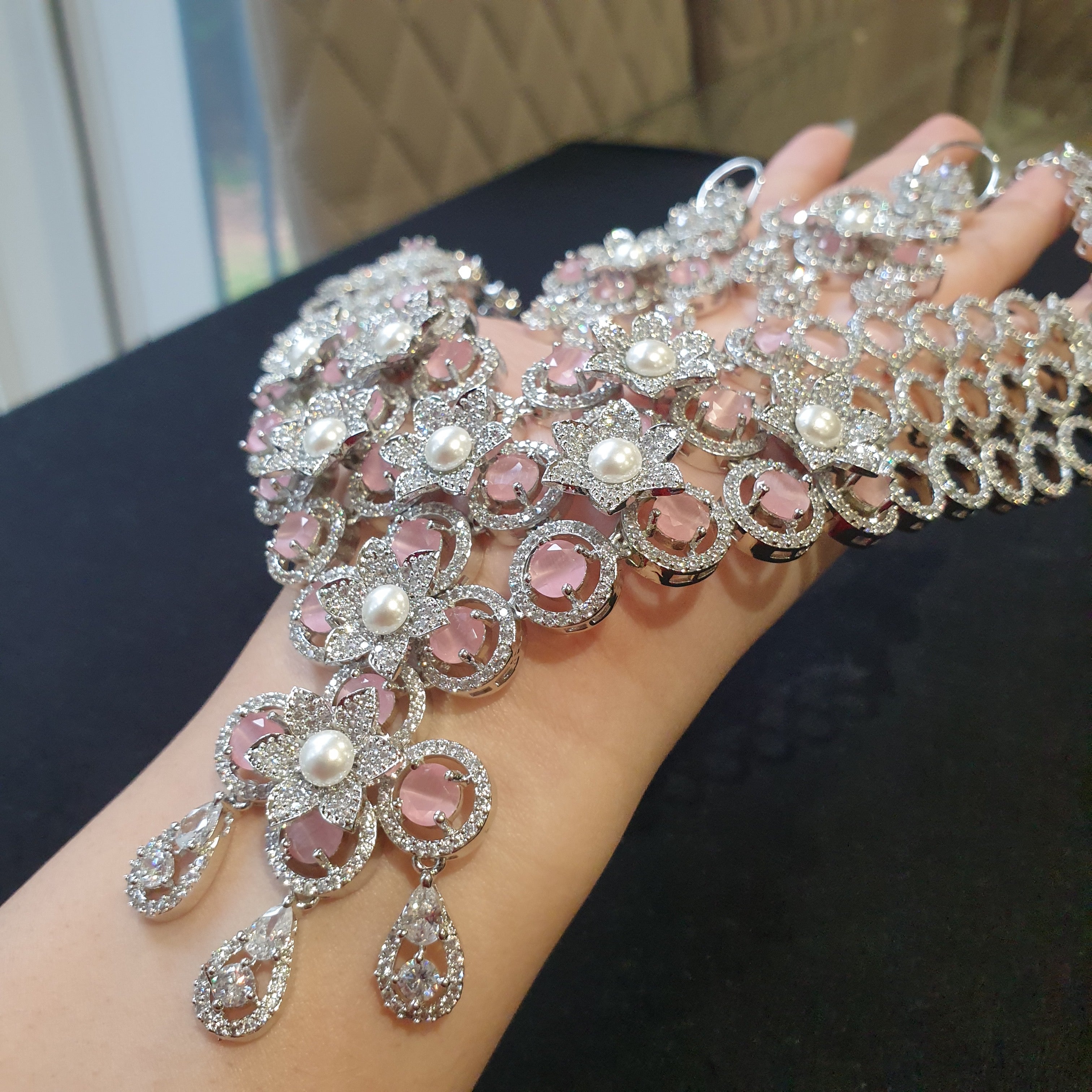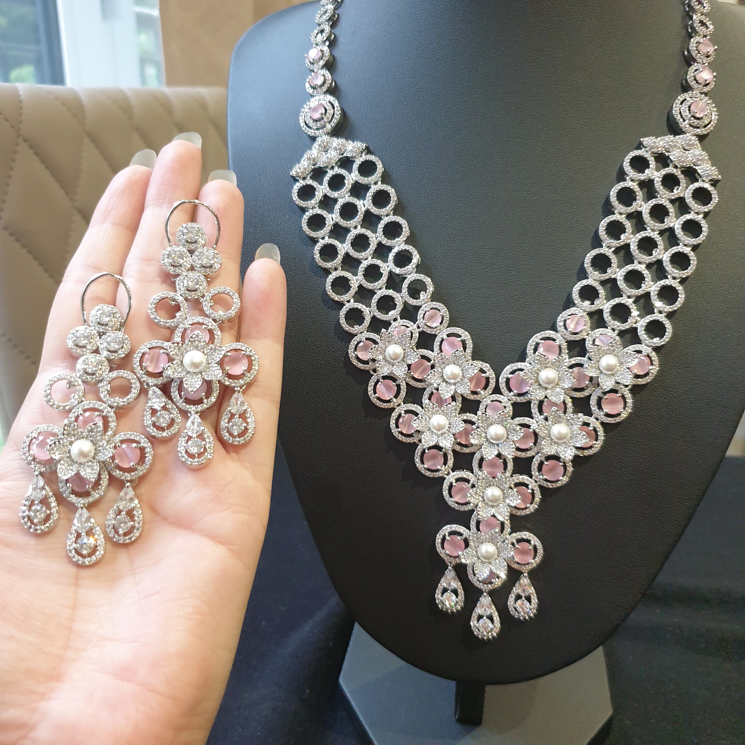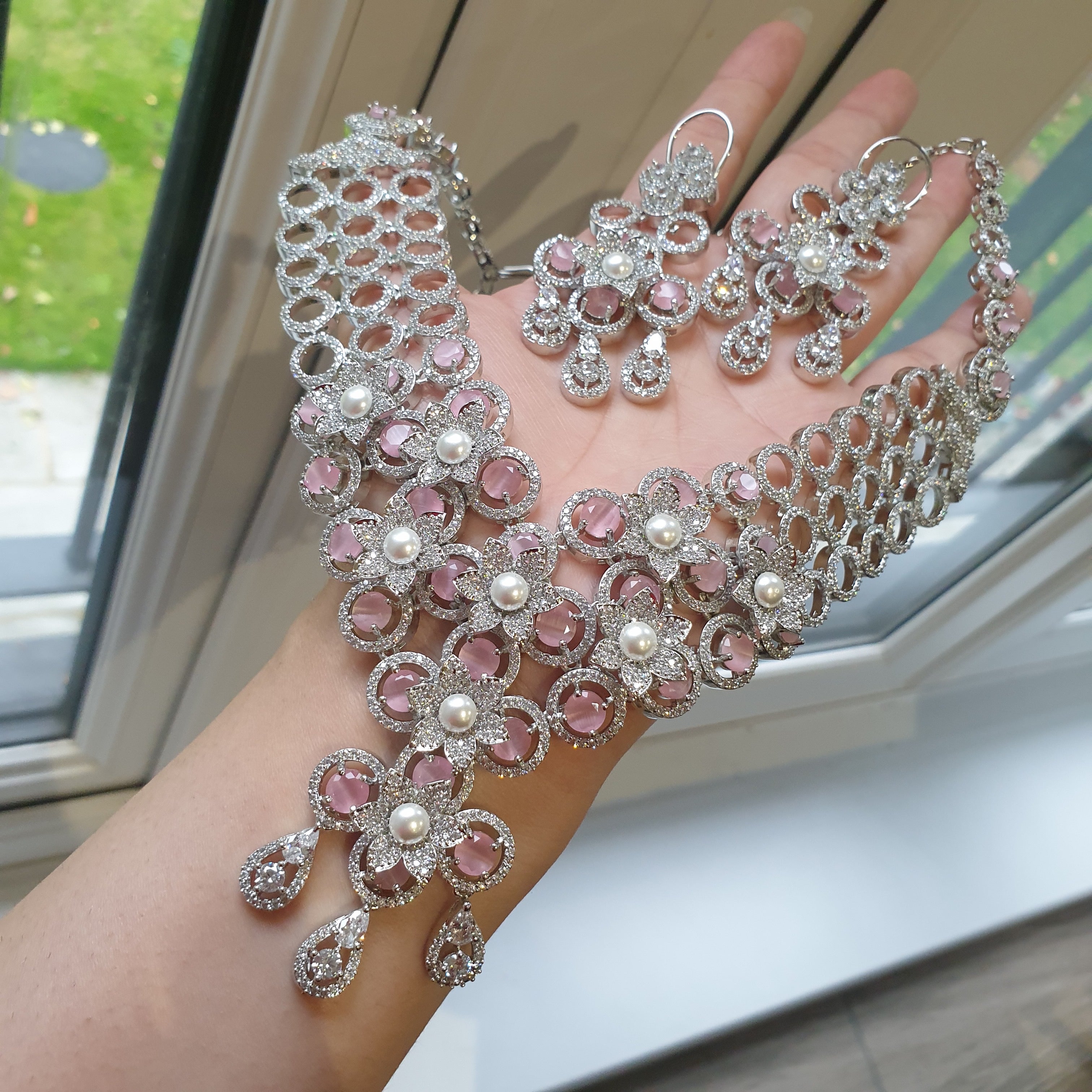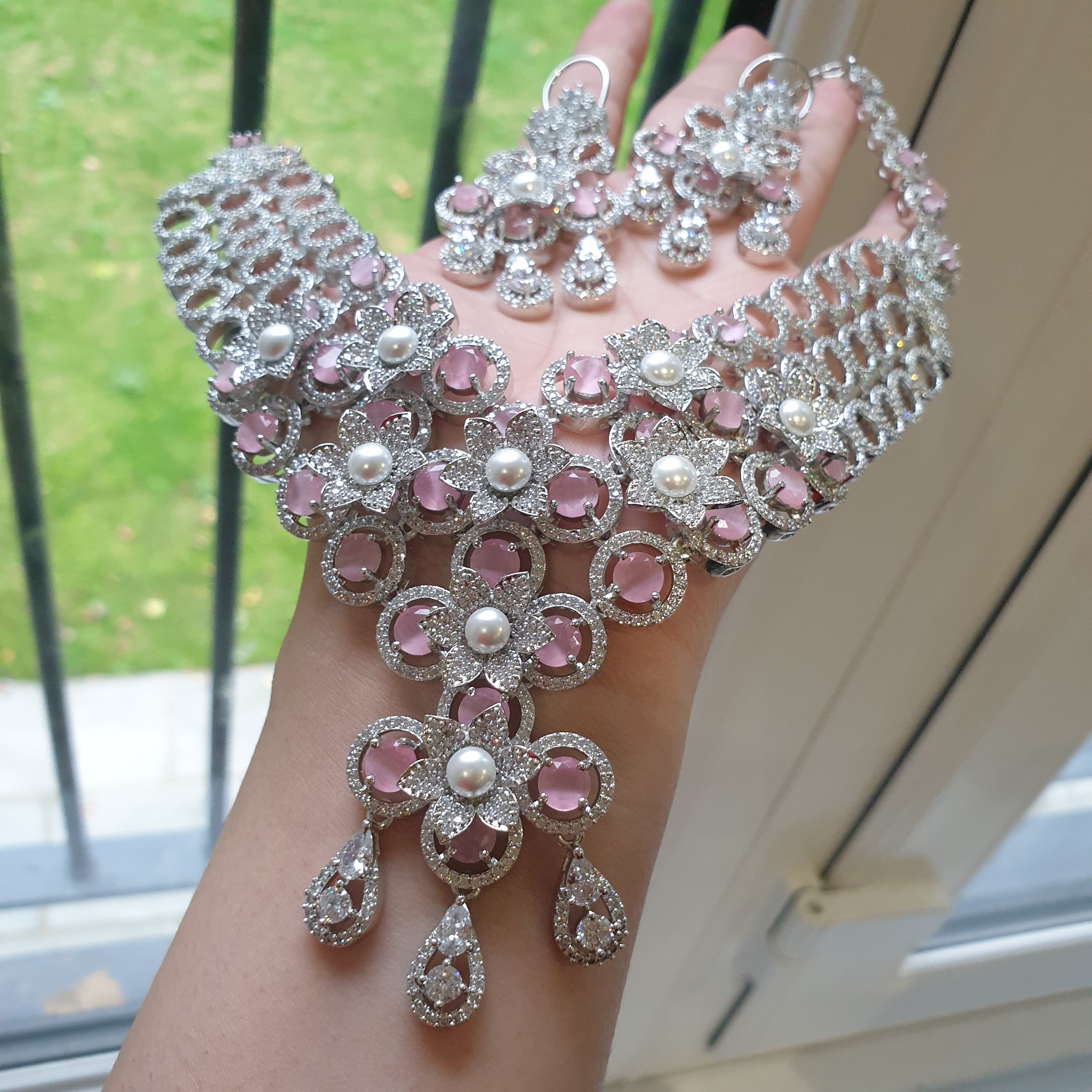 Graceful and feminine, this pink necklace and earring set blends the soft beauty of blush-toned stones with the timeless elegance of pearls. Accented with sparkling cubic zirconia and finished in radiant white gold plating, this set offers a delicate yet luxurious look. The classic combination of pearls and pink makes it perfect for weddings, romantic occasions, or elevating your everyday style.