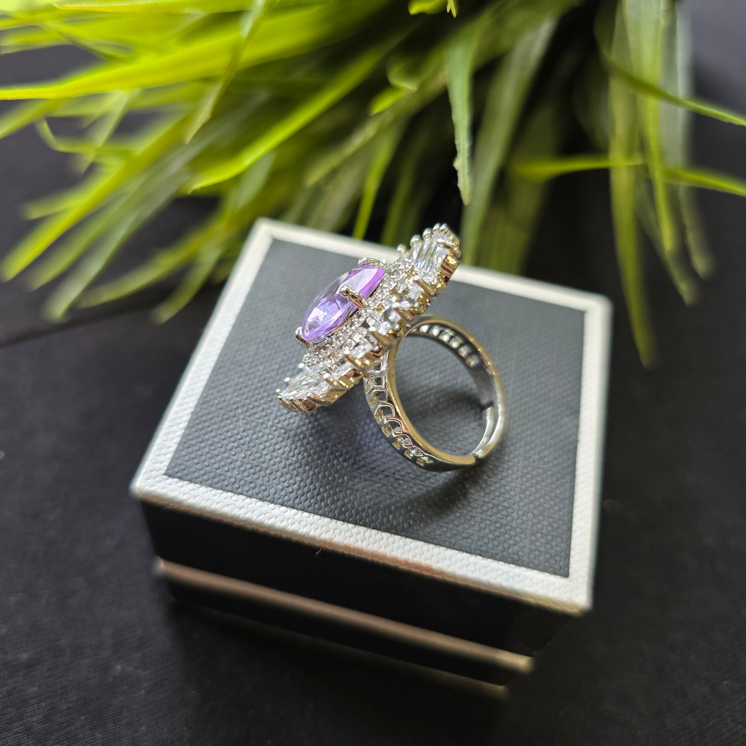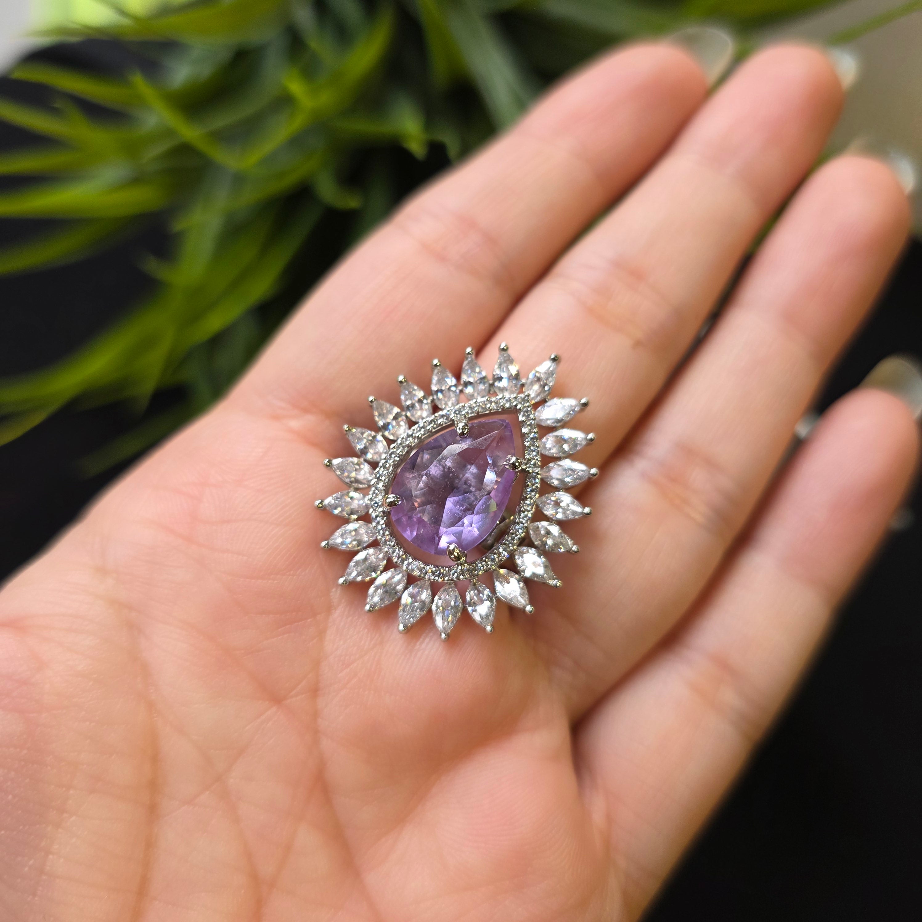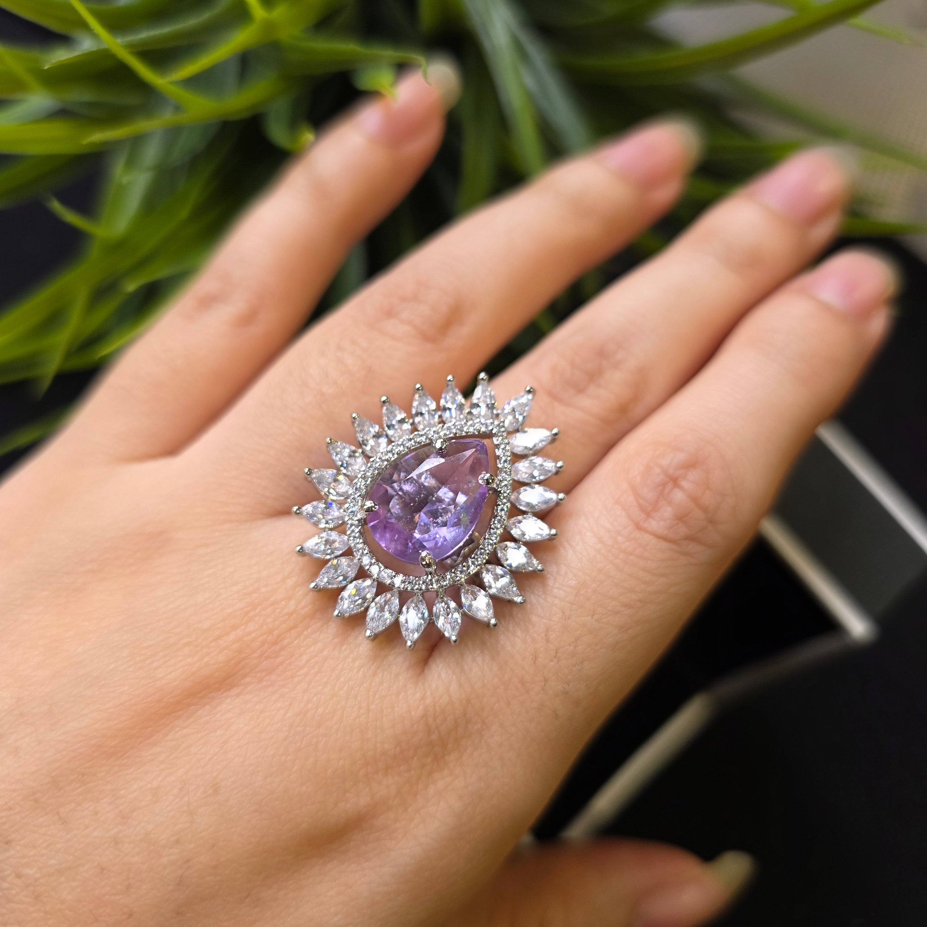 White Gold and Rhodium Plated Size Adjustable Ring with Purple Amethyst and Cubic Zirconia.