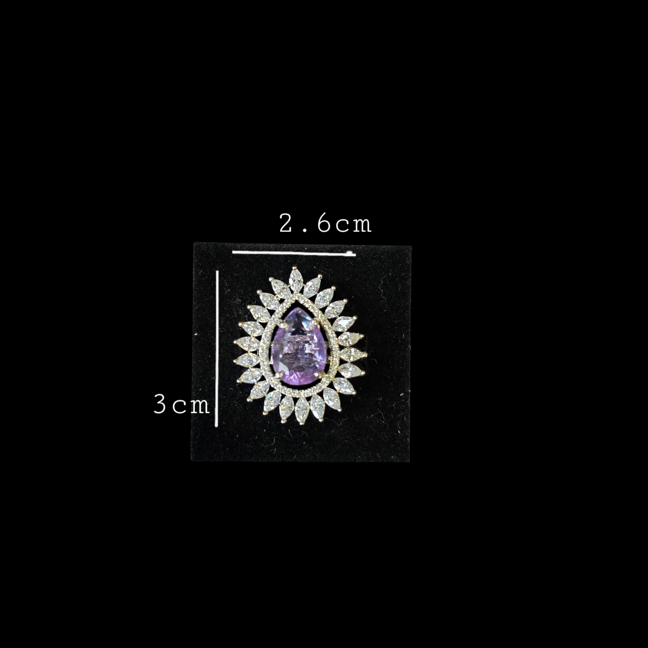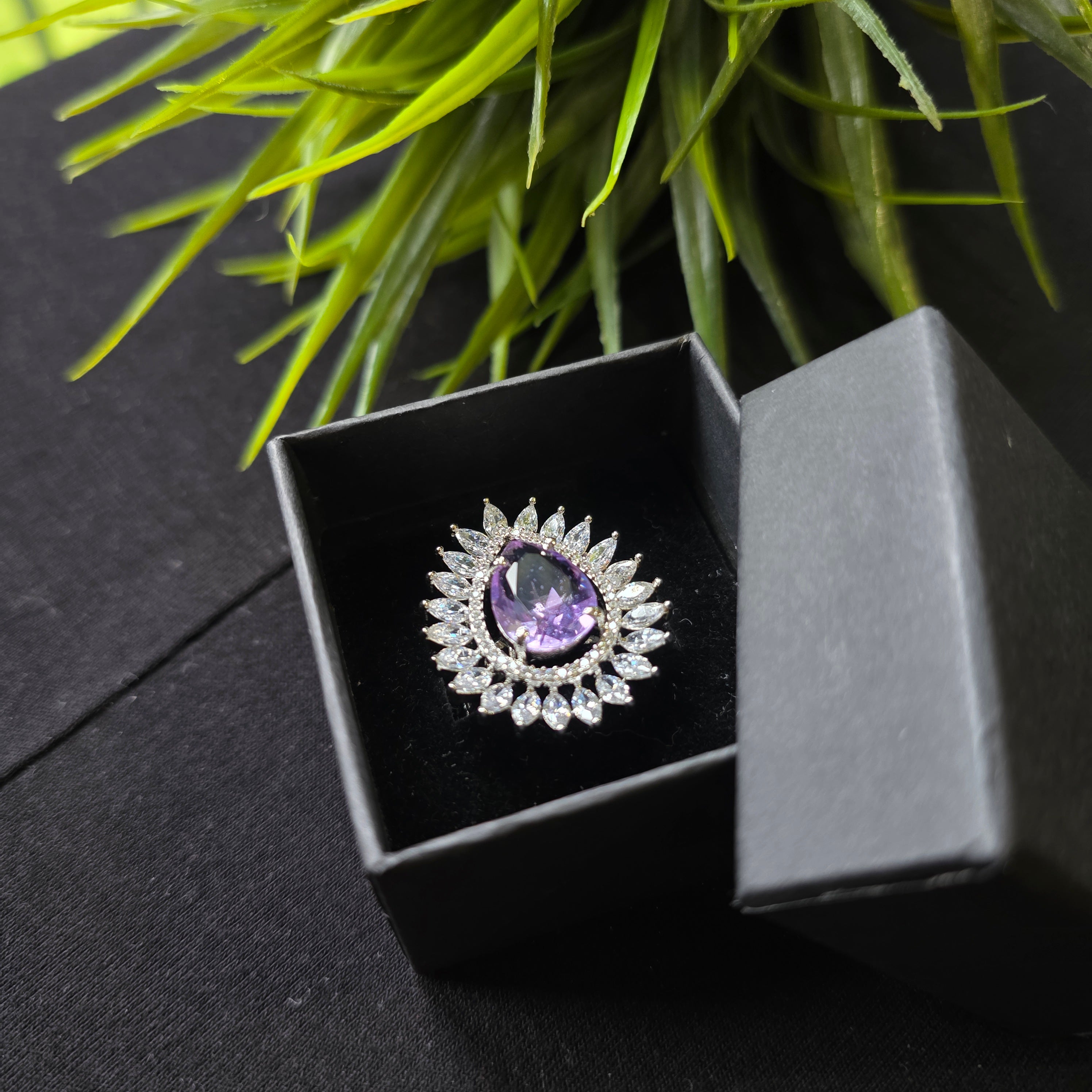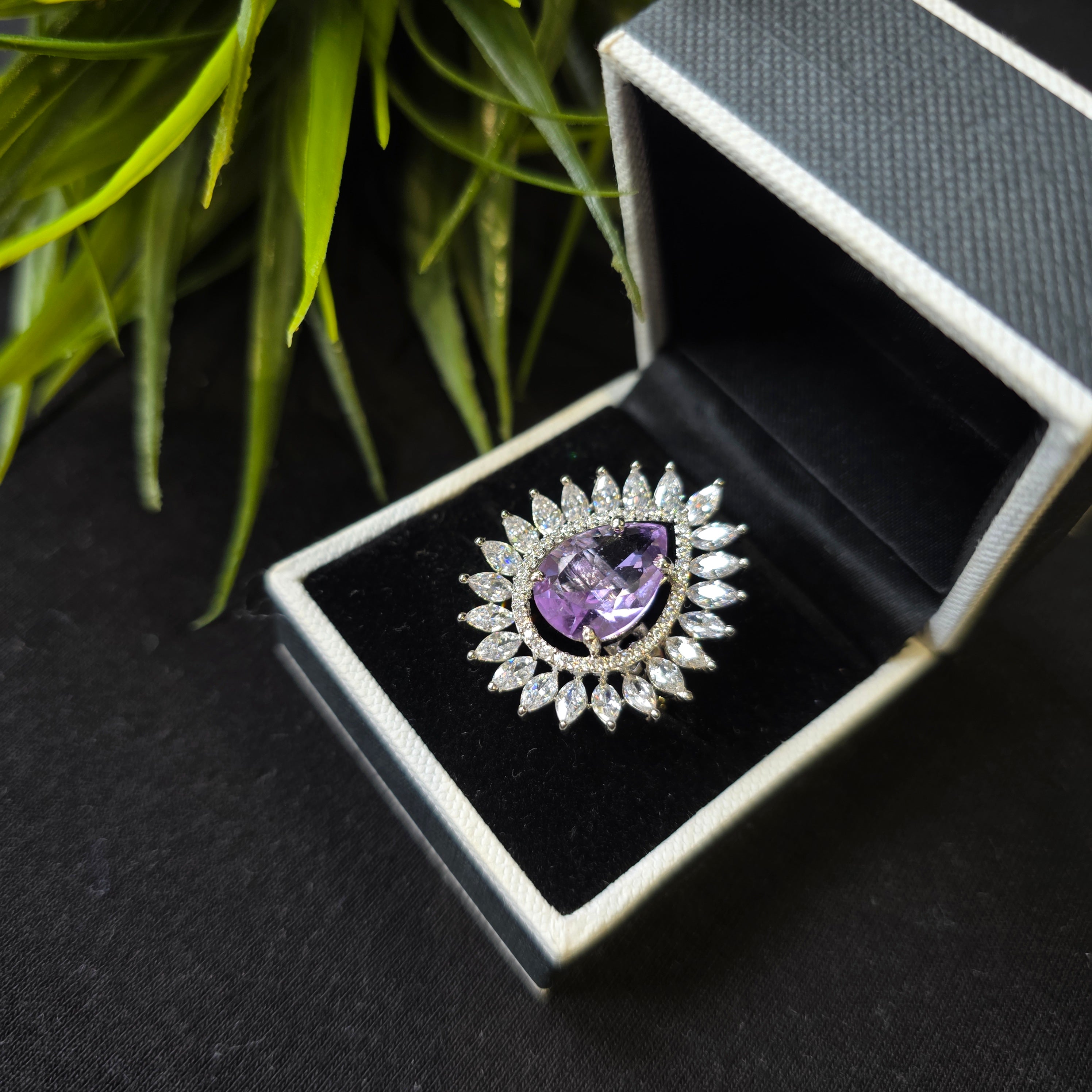White Gold and Rhodium Plated Size Adjustable Ring with Purple Amethyst and Cubic Zirconia.