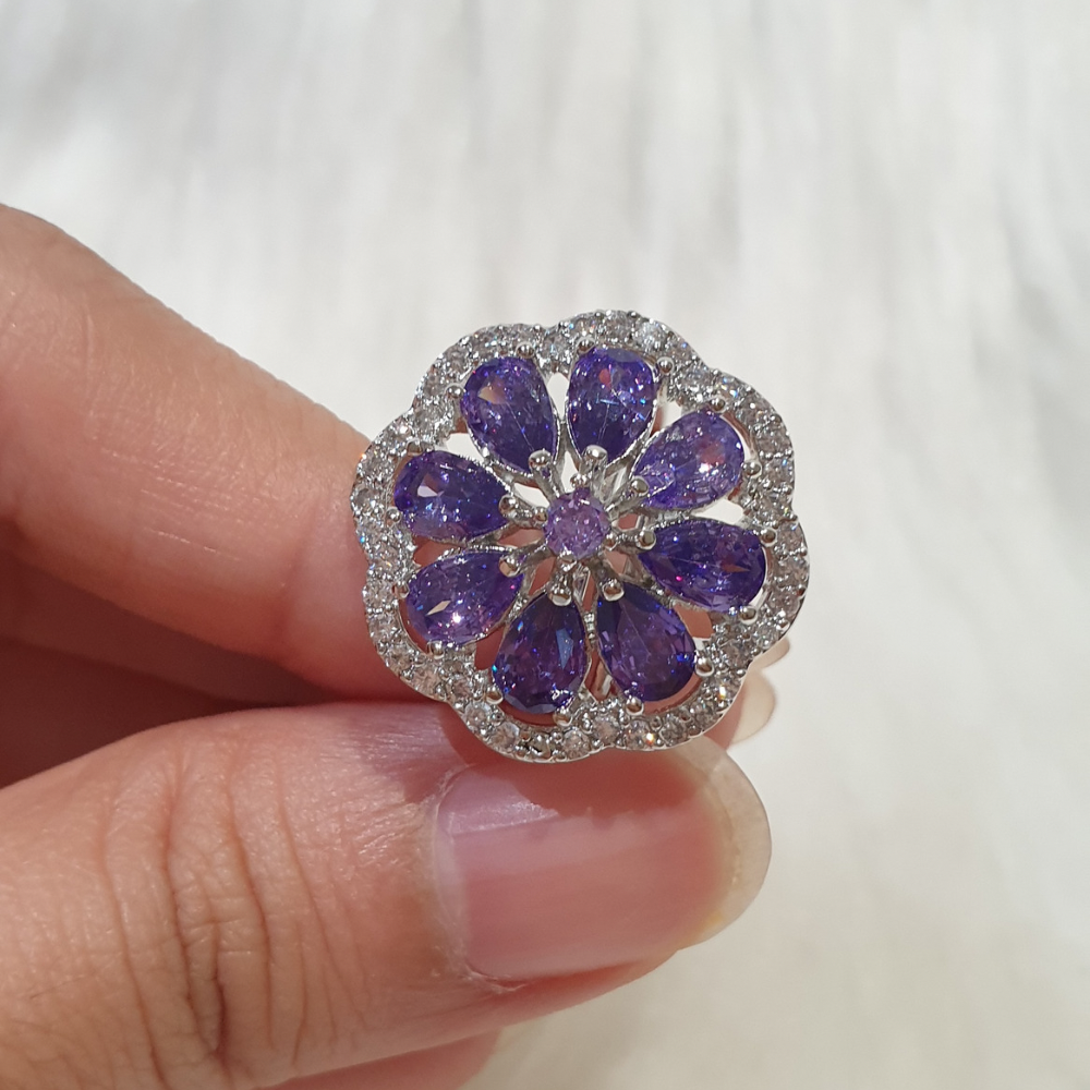 White Gold and Rhodium Plated Size Adjustable Ring with Purple Amethyst and Cubic Zirconia.