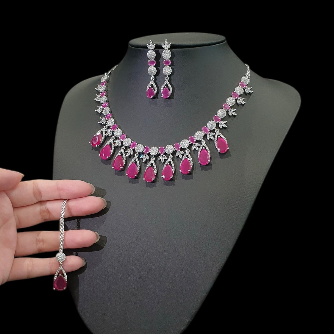 Radiate elegance with this stunning Ruby Necklace Set, featuring a deep crimson ruby centerpiece surrounded by sparkling cubic zirconia, all beautifully set in sleek white gold plating. The vibrant red ruby symbolizes love, power, and timeless beauty, while the zirconia accents bring a luminous brilliance that enhances every detail.