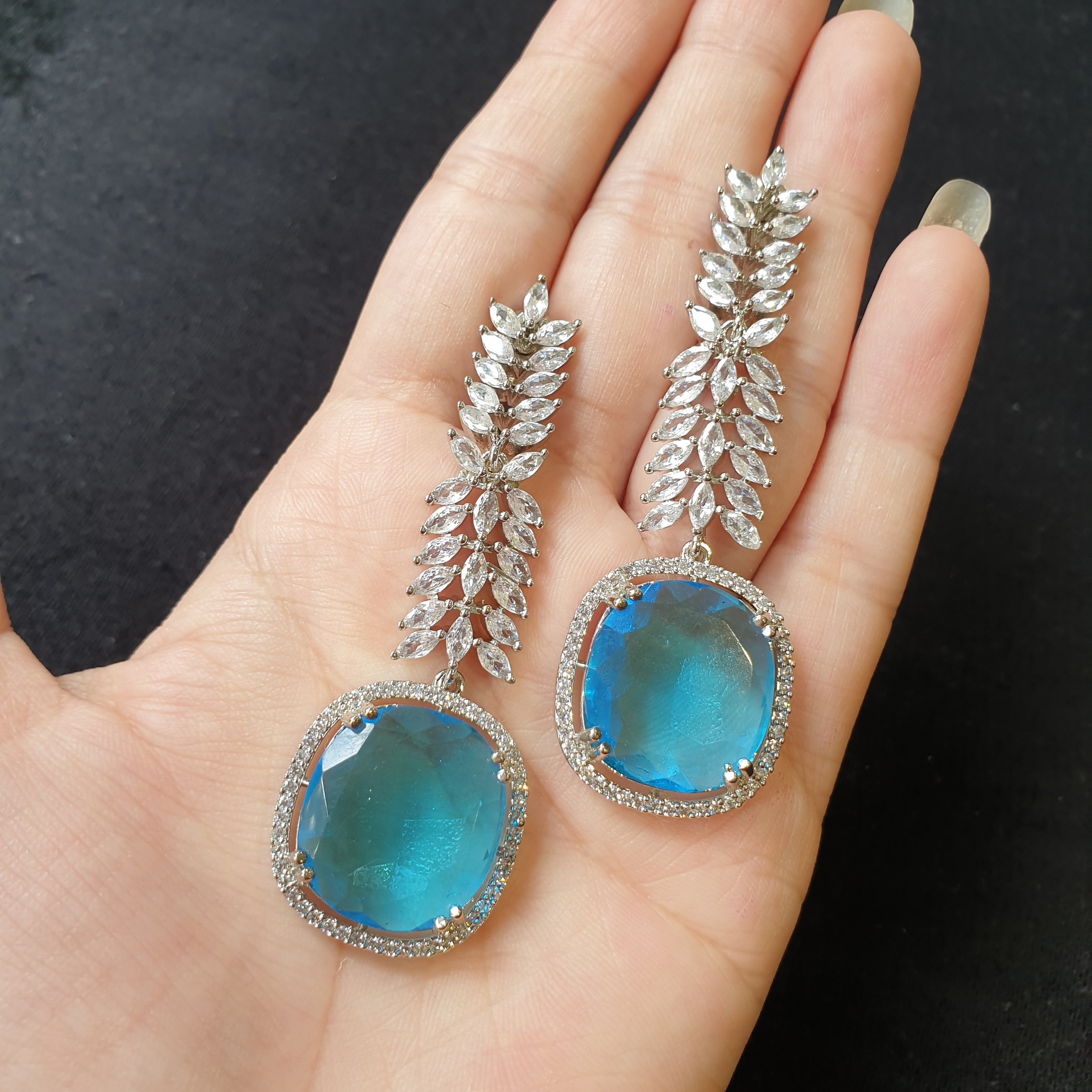 Elevate your elegance with these dazzling blue topaz earrings, designed to capture attention with their radiant ocean-blue sparkle. Each earring features a brilliant blue topaz stone, accented with shimmering cubic zirconia for extra brilliance. The sleek white gold-plated setting enhances the luminous beauty, offering a modern yet timeless appeal.