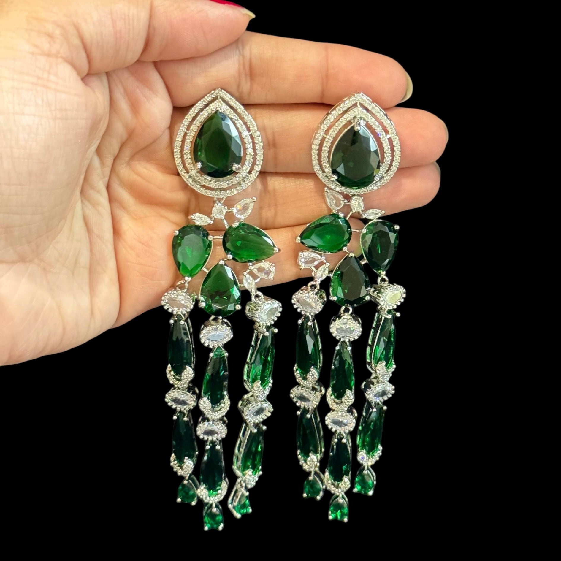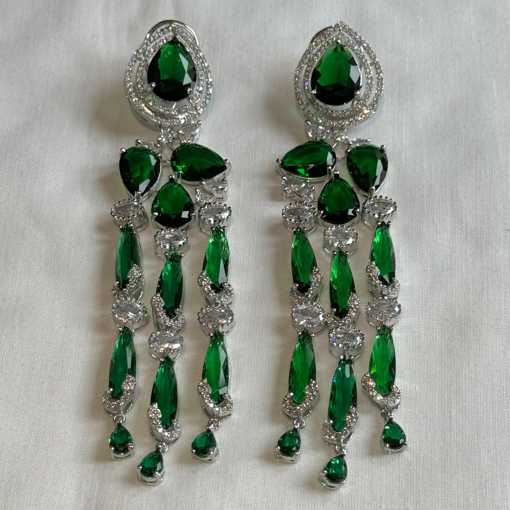 These exquisite emerald green earrings feature vibrant, lab-created emerald stones that are beautifully complemented by sparkling cubic zirconia accents. The deep green emeralds are expertly cut to maximize their brilliance, creating a captivating centerpiece for each earring. Surrounding the emeralds are radiant cubic zirconia stones, adding a touch of shimmer and enhancing the overall elegance of the design. Set in a high-quality metal finish, these earrings offer both durability and luxury, making them the perfect accessory for formal events or adding a pop of colour to everyday wear.