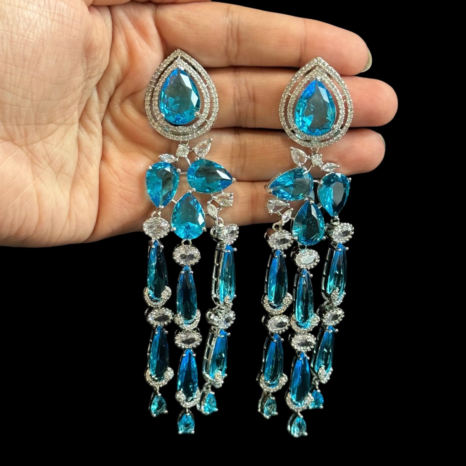 These stunning earrings showcase lab-made aquamarine stones, exuding a serene, light blue hue that captures the beauty of the sea. Each aquamarine is precisely cut to enhance its natural brilliance, serving as the centerpiece of the design. Surrounding the aquamarines are radiant cubic zirconia accents, adding a touch of sparkle and sophistication. Set in a high-quality metal finish, these earrings combine elegance and durability, making them the perfect accessory for both special occasions and everyday elegance. Their cool, tranquil tones make them versatile for a variety of styles and outfits.