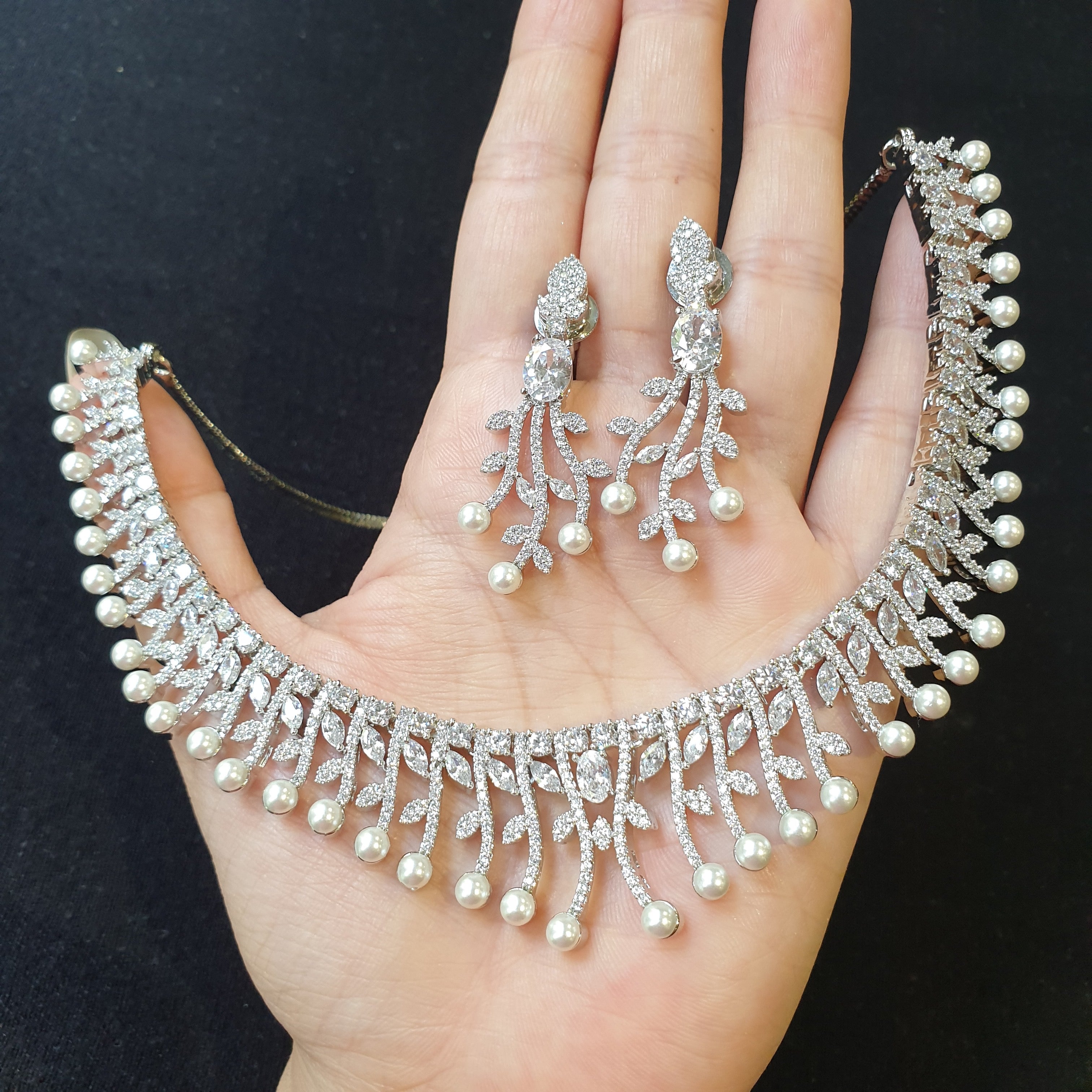 Elegant Pearl Necklace Set – A timeless blend of sophistication and sparkle. This exquisite set features a luminous pearl centerpiece, symbolizing purity and grace, delicately framed by brilliant cubic zirconia accents. The white gold-plated finish enhances its radiant glow, offering both durability and a luxurious touch.