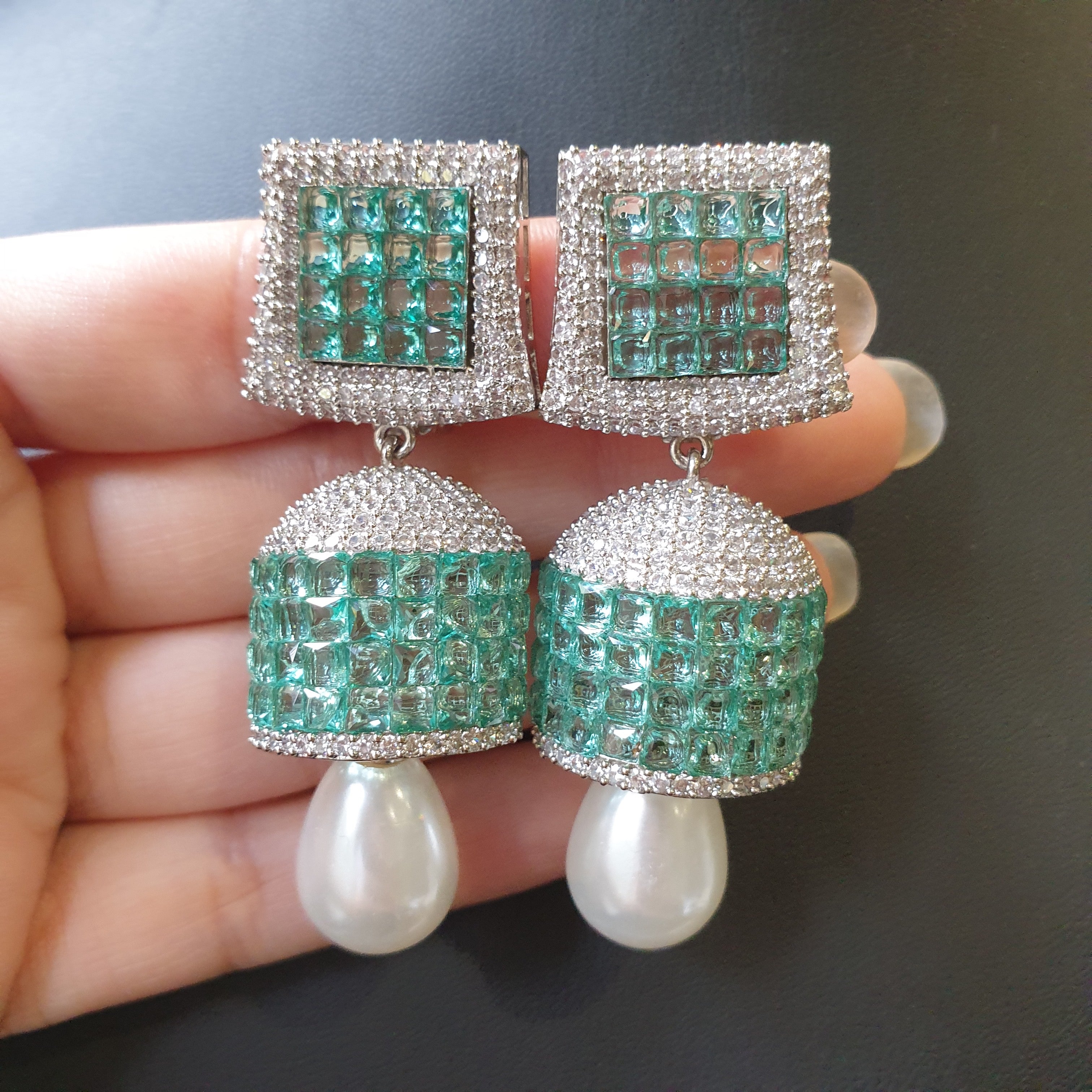 Add a refreshing pop of color to your look with these stunning sea green earrings, beautifully accented with sparkling cubic zirconia for extra brilliance. The stones are elegantly set in a white gold plated finish, creating a radiant contrast that enhances their vibrant hue.