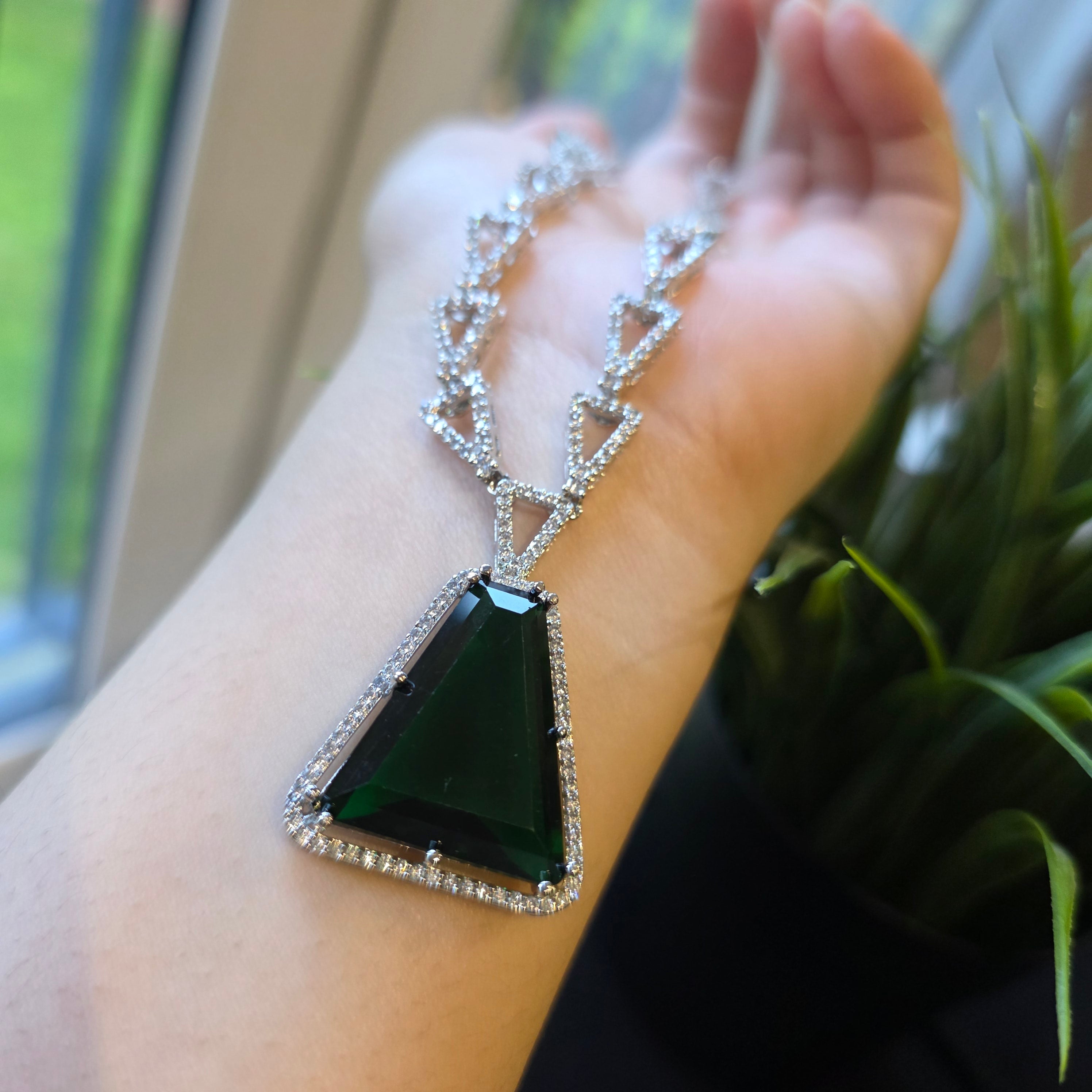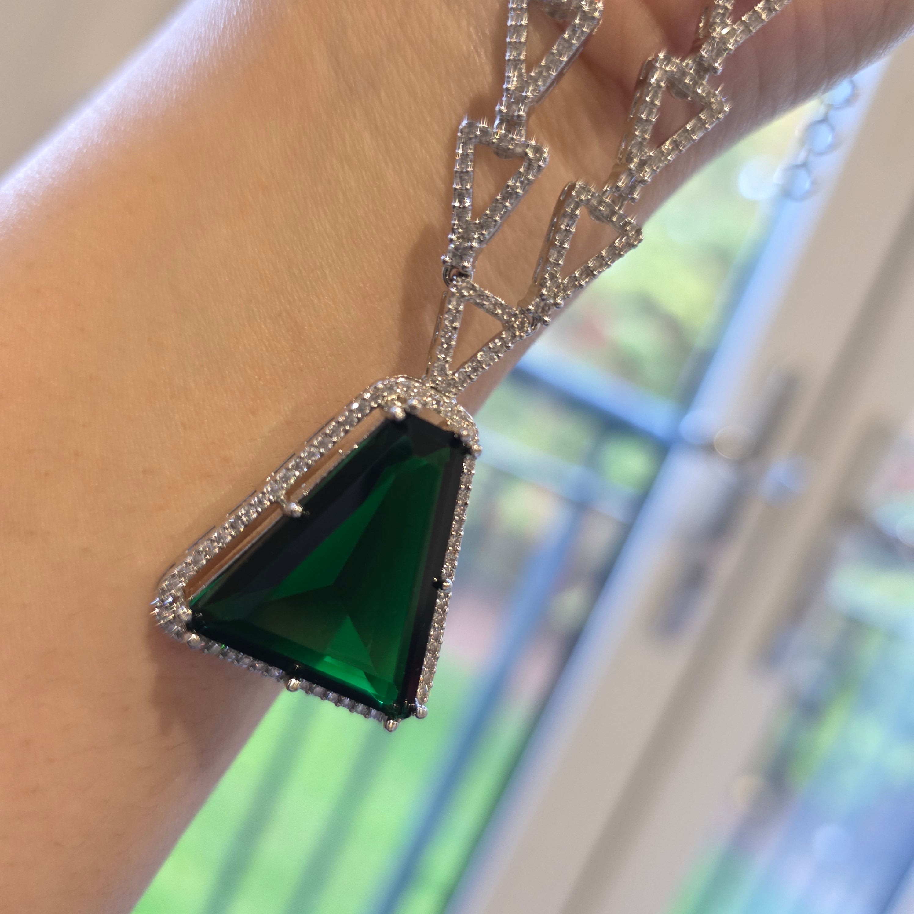 This one of a kind piece has Vibrant Emerald Green (lab created) in Triangular Cut and accented with sparkling cubic zirconia.