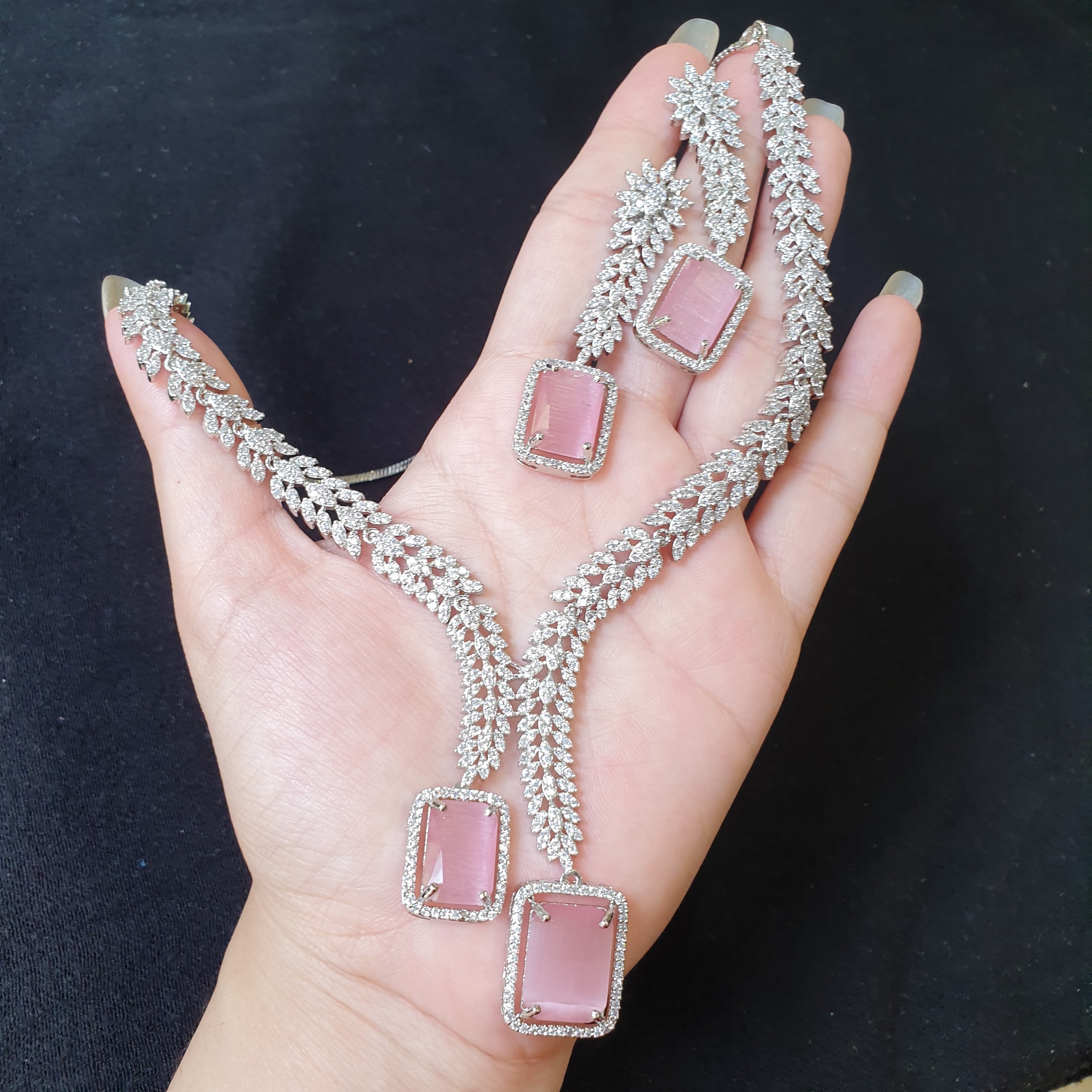Add a touch of romance and elegance to your jewelry collection with this exquisite pink quartz necklace set. The soft blush tones of pink quartz are beautifully highlighted with the sparkle of cubic zirconia, all set in a white gold-plated finish for timeless sophistication.