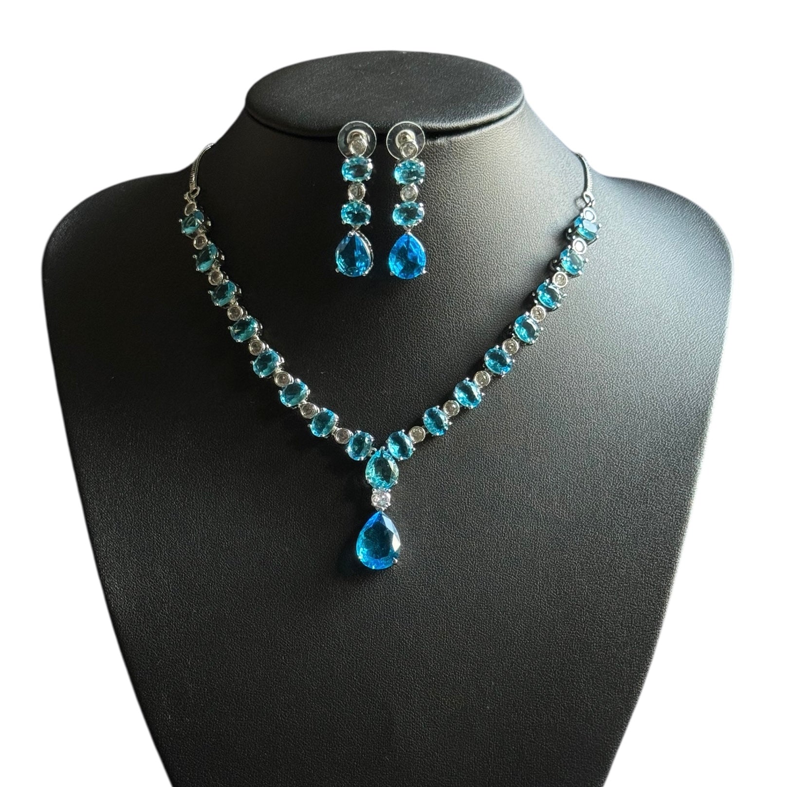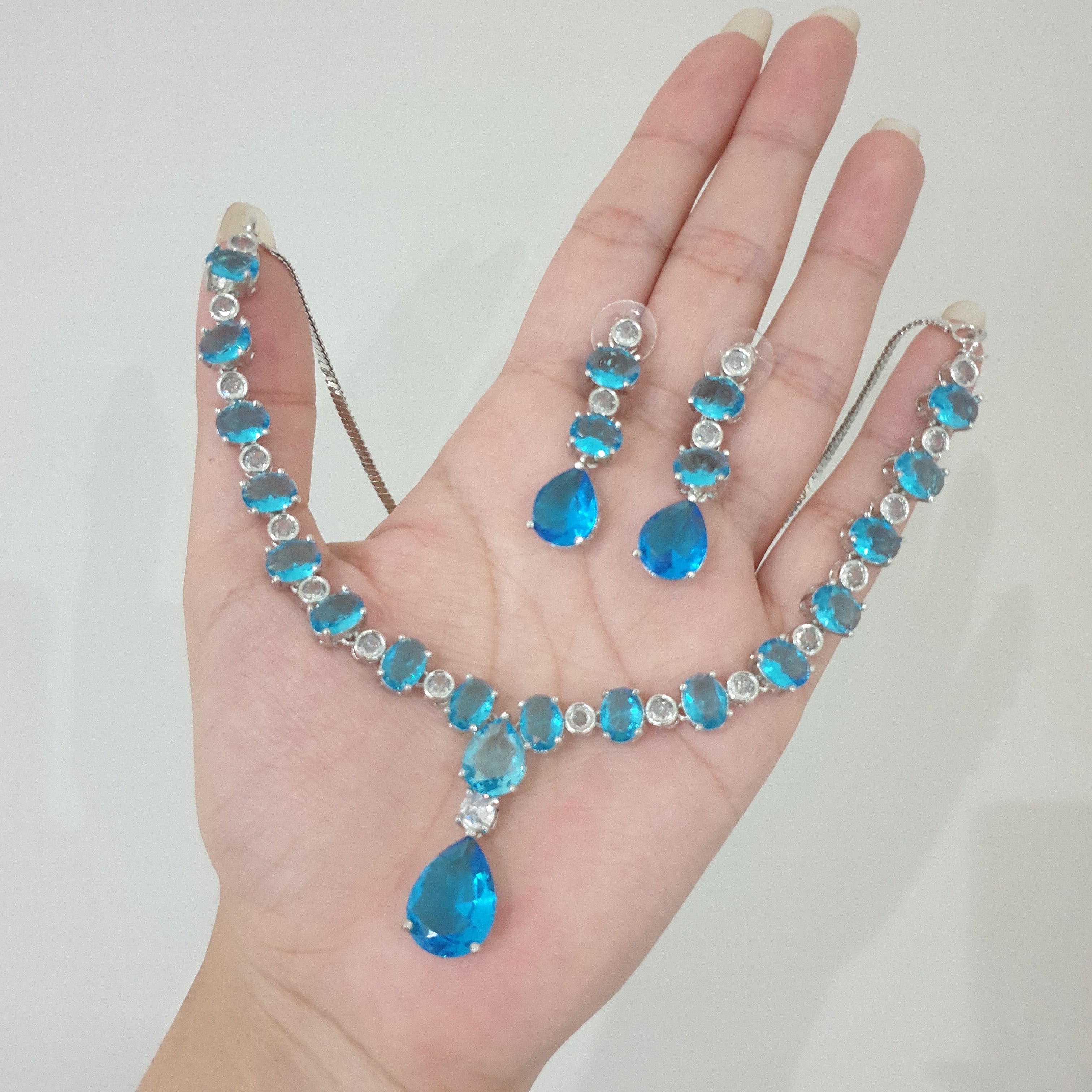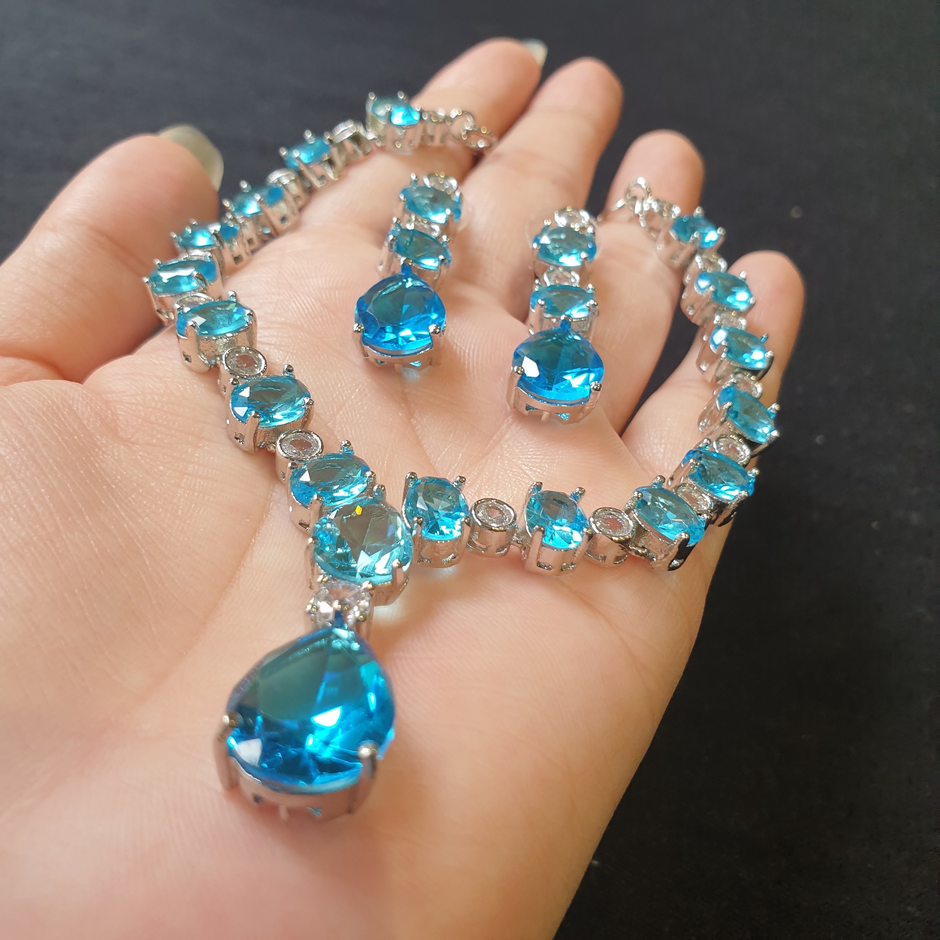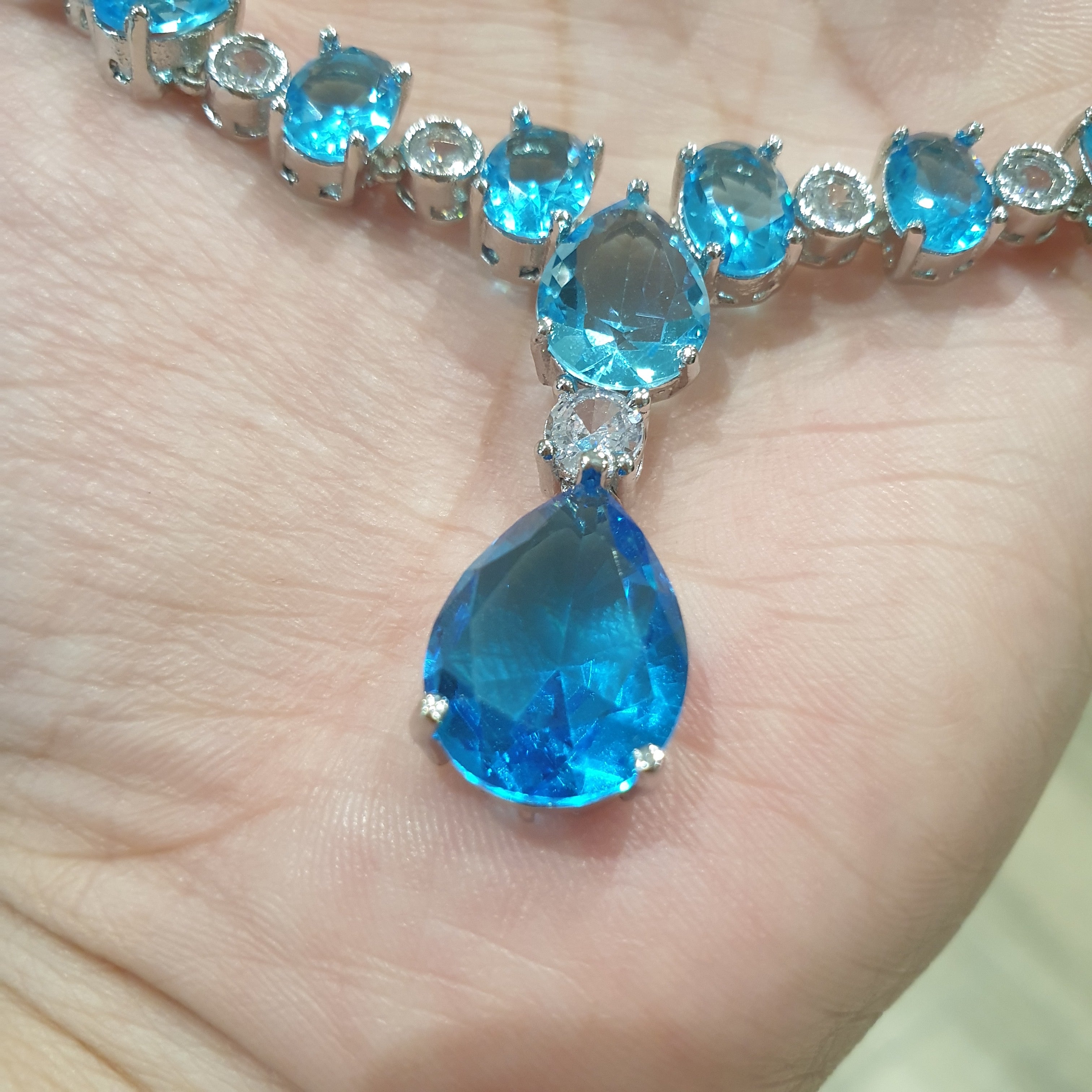 Radiate elegance and tranquility with this stunning aqua blue topaz necklace set, delicately accented with sparkling cubic zirconia stones. The mesmerizing ocean-blue topaz symbolizes serenity and clarity, while the halo of shimmering zirconia adds a touch of brilliance and sophistication.