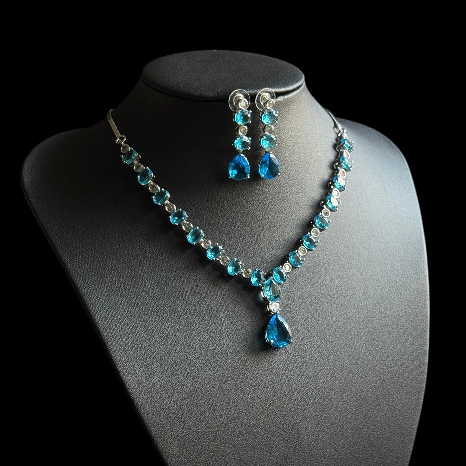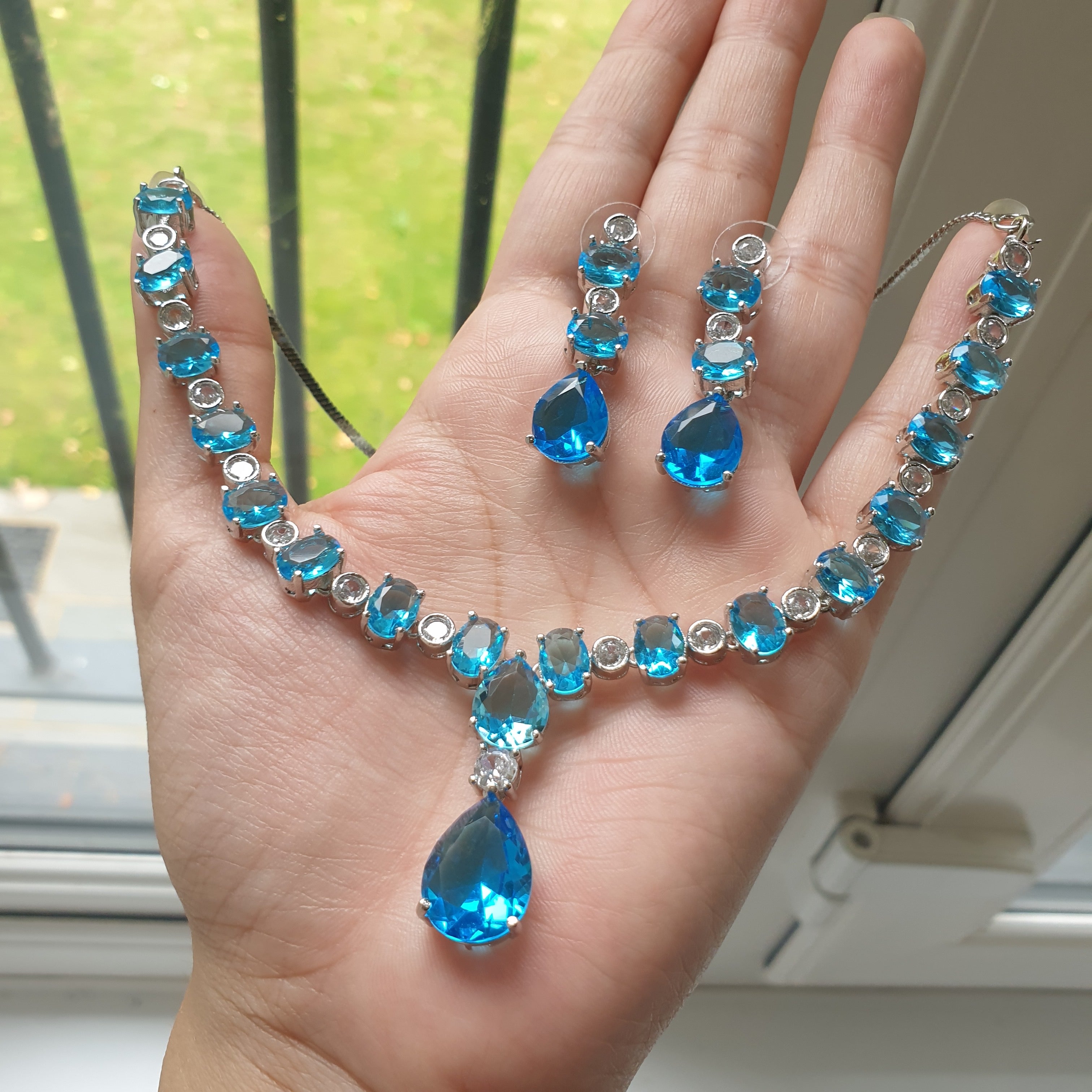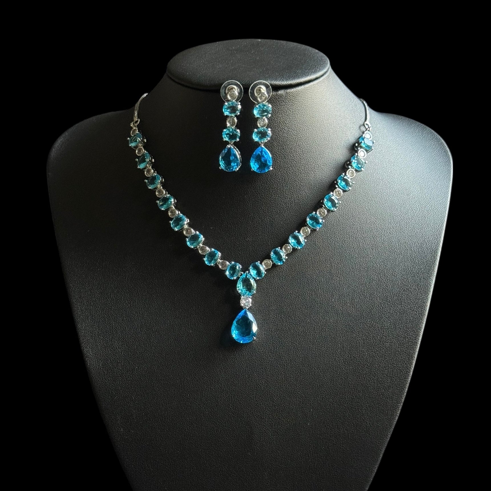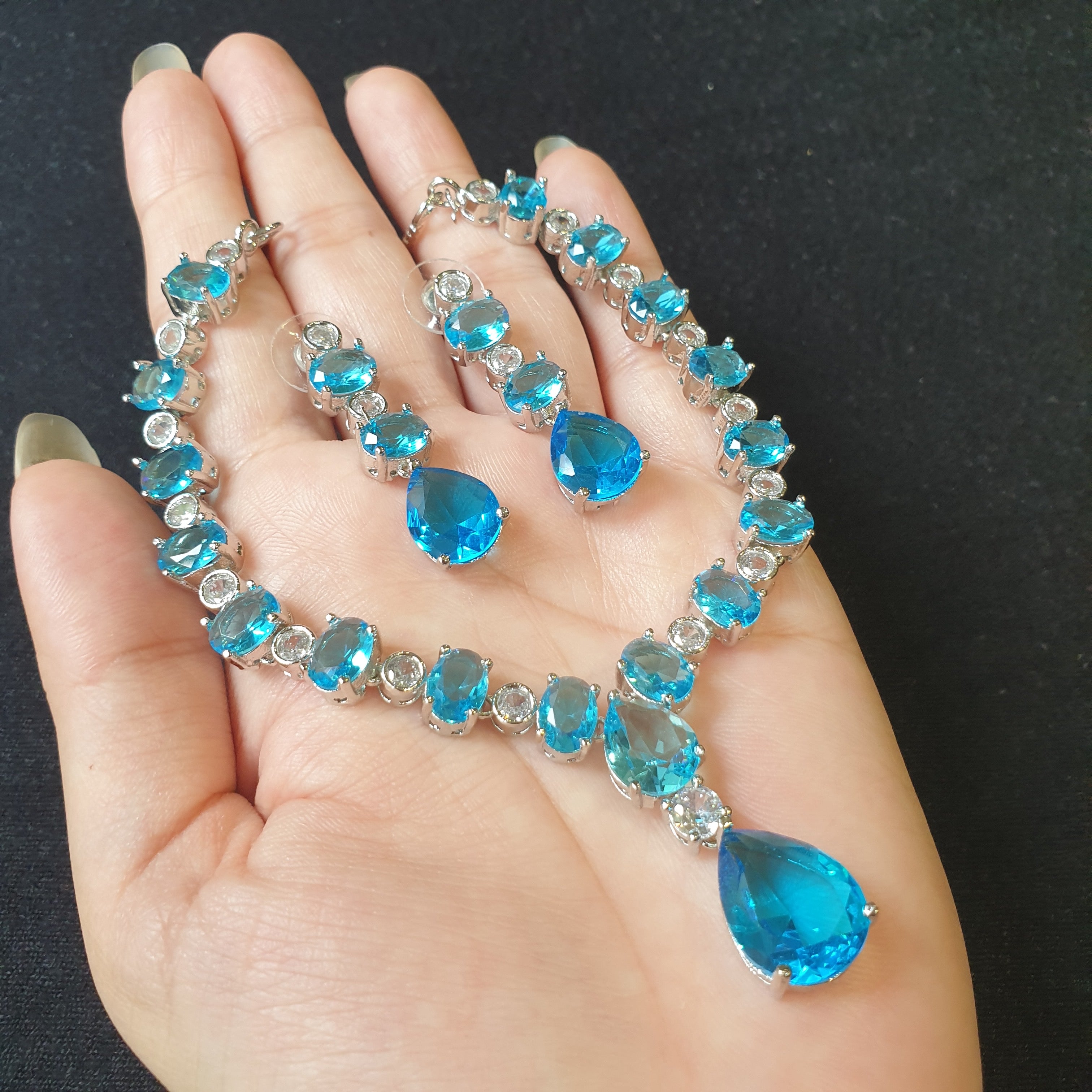 Radiate elegance and tranquility with this stunning aqua blue topaz necklace set, delicately accented with sparkling cubic zirconia stones. The mesmerizing ocean-blue topaz symbolizes serenity and clarity, while the halo of shimmering zirconia adds a touch of brilliance and sophistication.