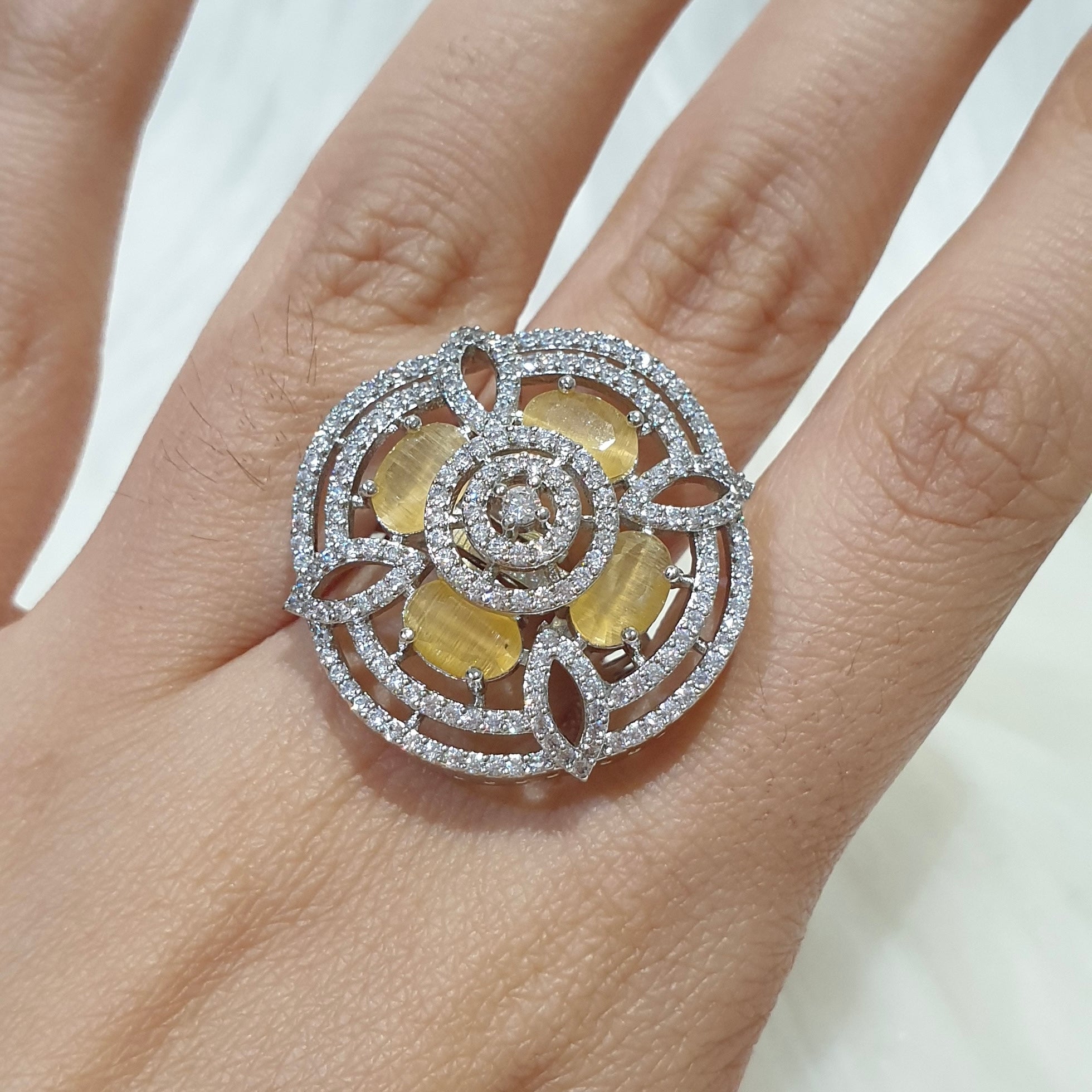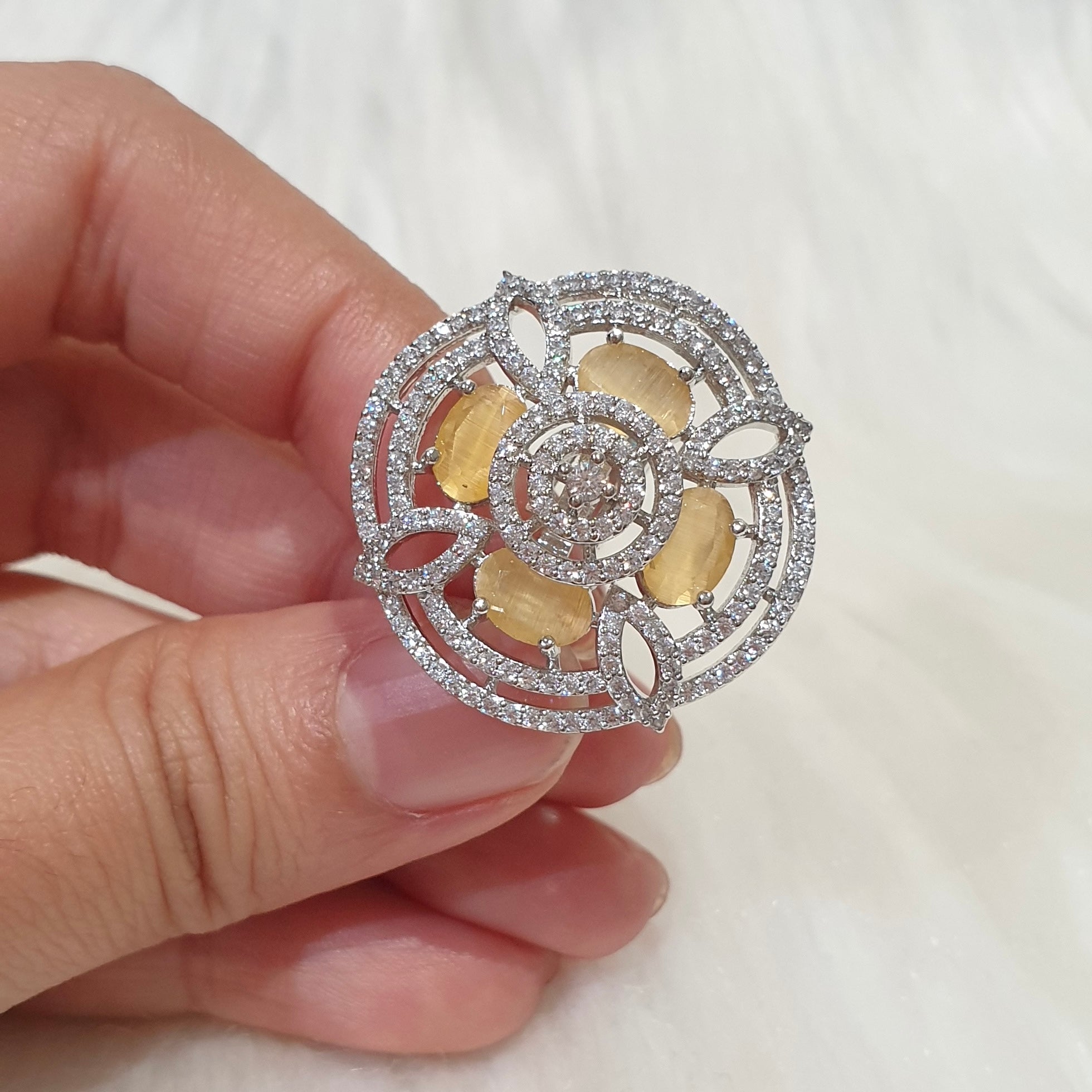 This captivating lab-created yellow topaz ring features a vibrant, golden-hued topaz stone that radiates warmth and brilliance. The centerpiece is beautifully accented by shimmering cubic zirconia stones, enhancing its luxurious appeal. Crafted with a polished, adjustable band, this ring ensures a perfect and comfortable fit for any finger size. The durable, hypoallergenic setting provides lasting shine and wearability. Combining the sunny elegance of yellow topaz with the sparkle of cubic zirconia, this ring is a versatile statement piece, perfect for both special occasions and adding a touch of glamour to everyday outfits.