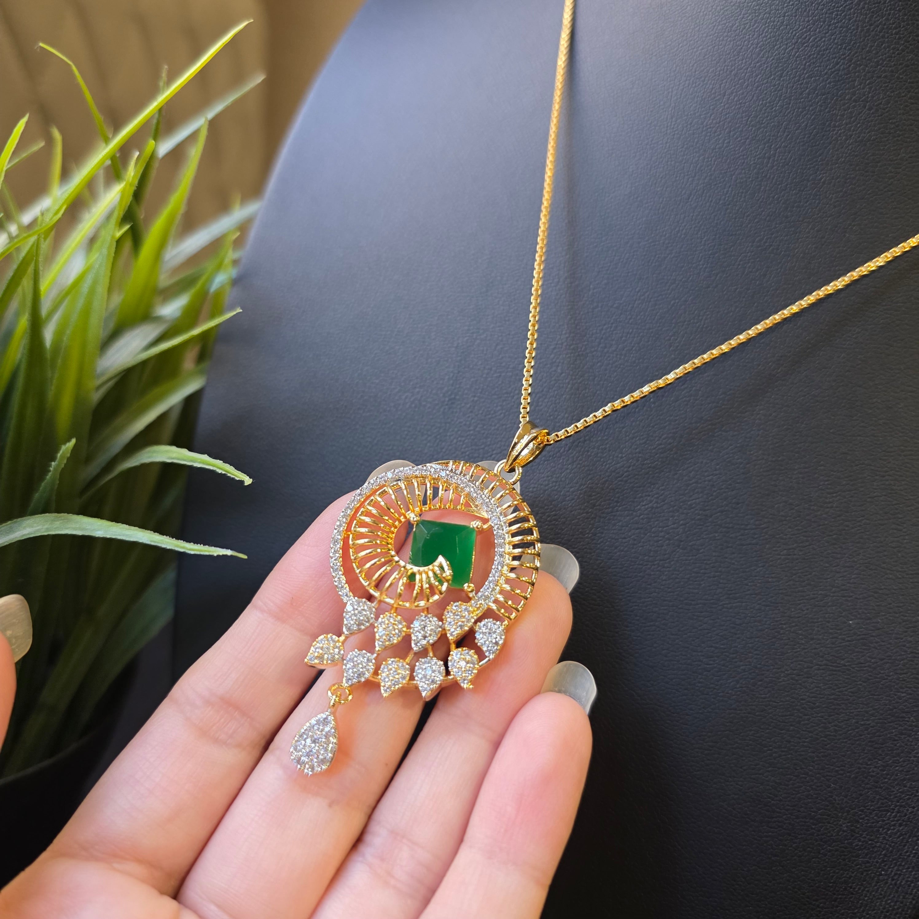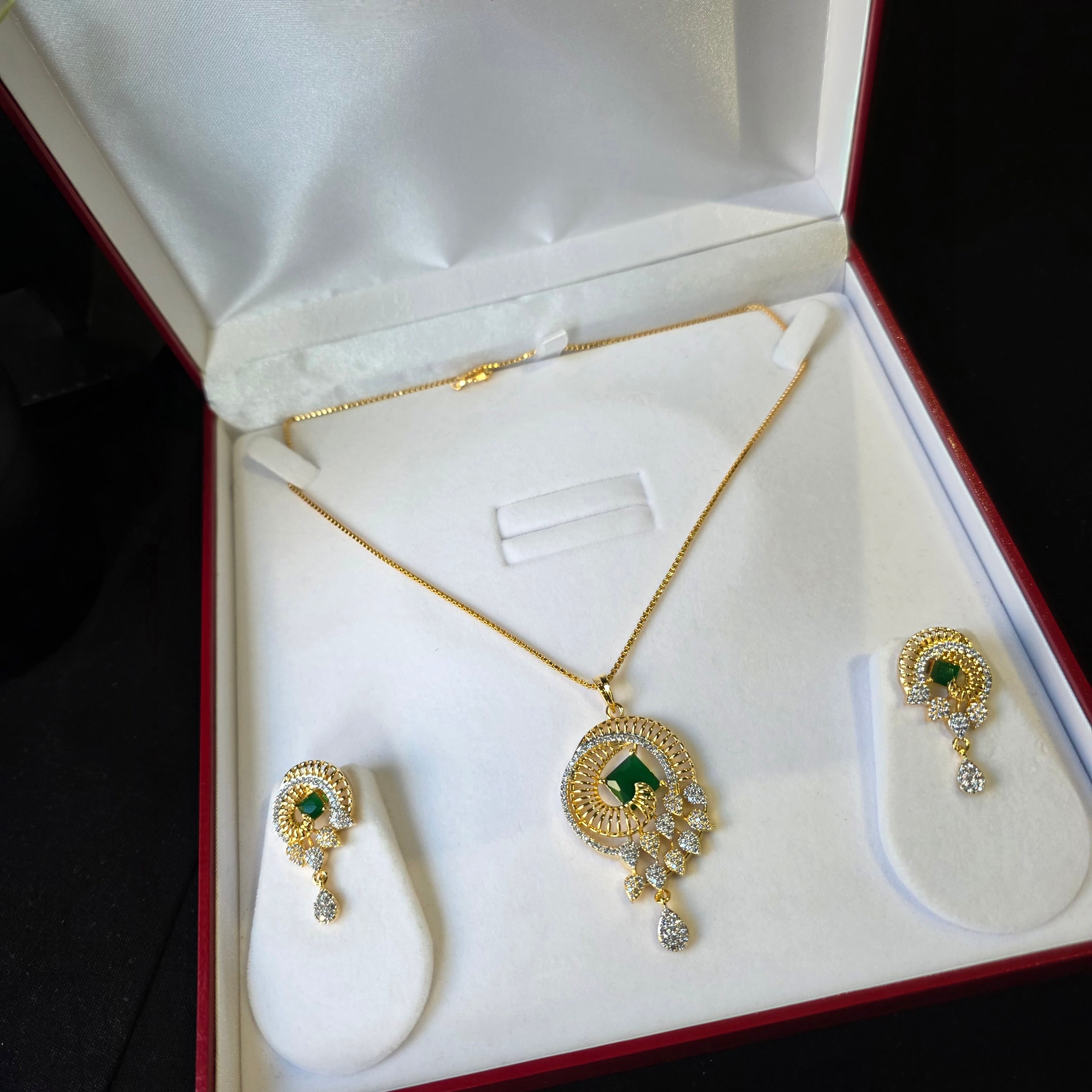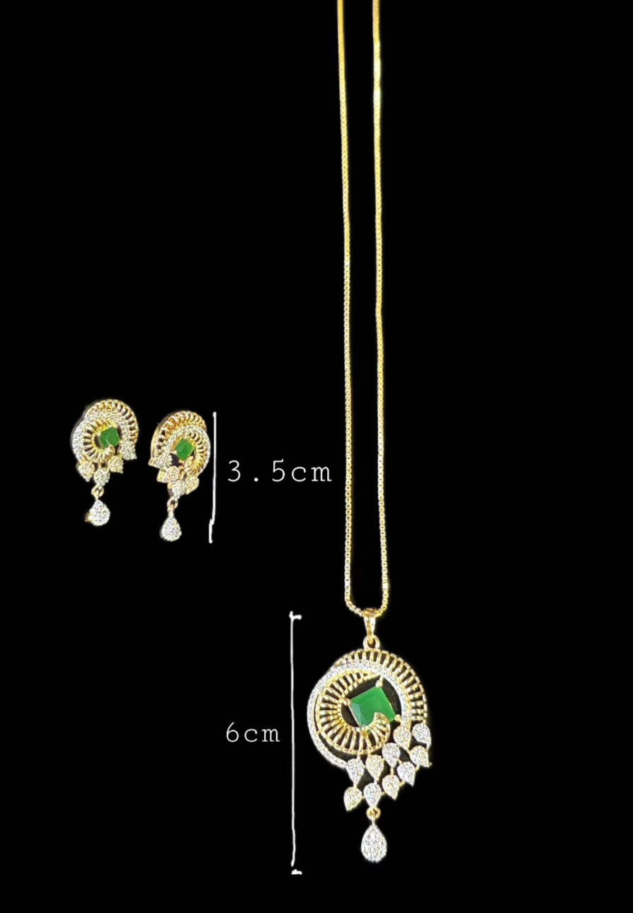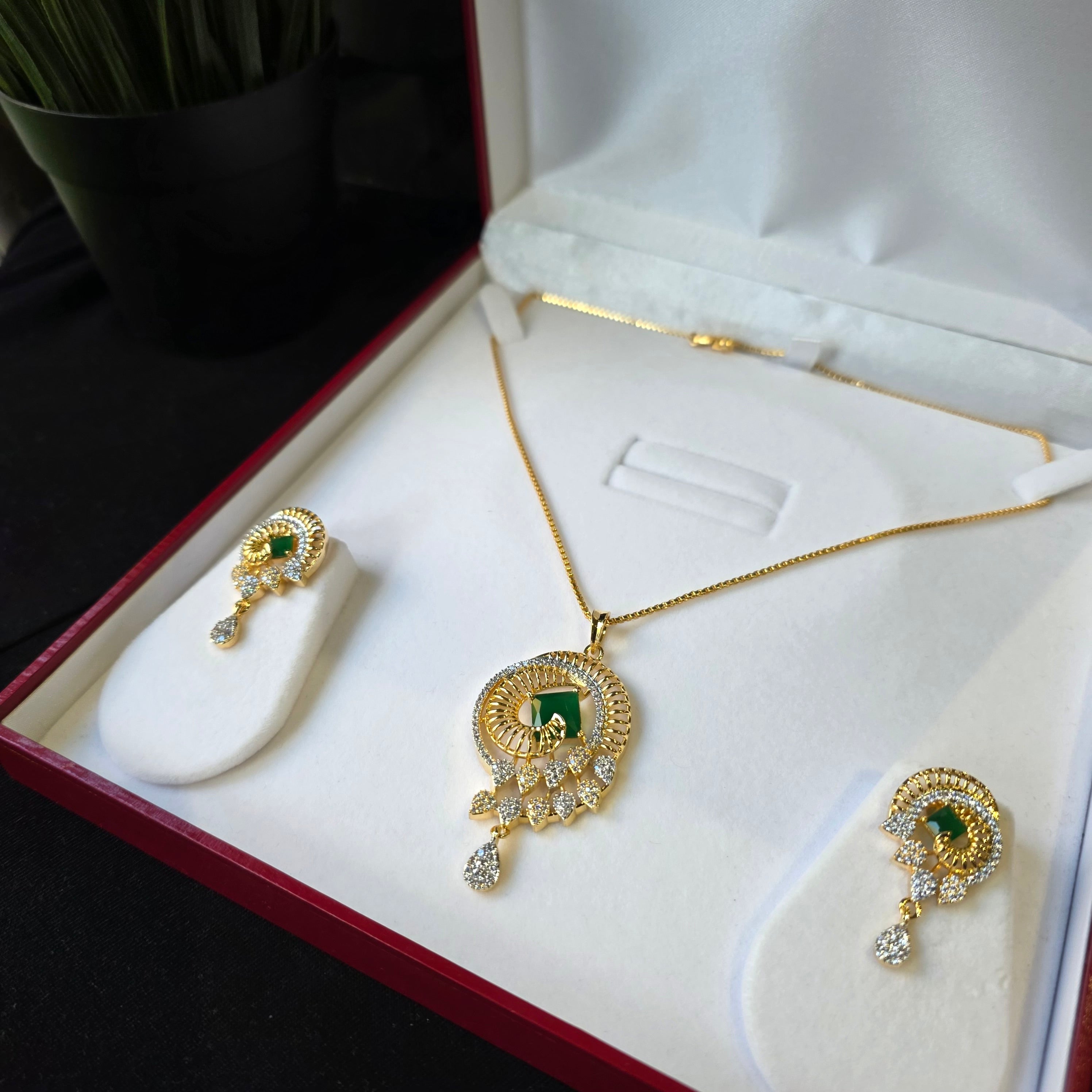 SET INCLUDES: Pendant, Gold plated chain & Earrings.